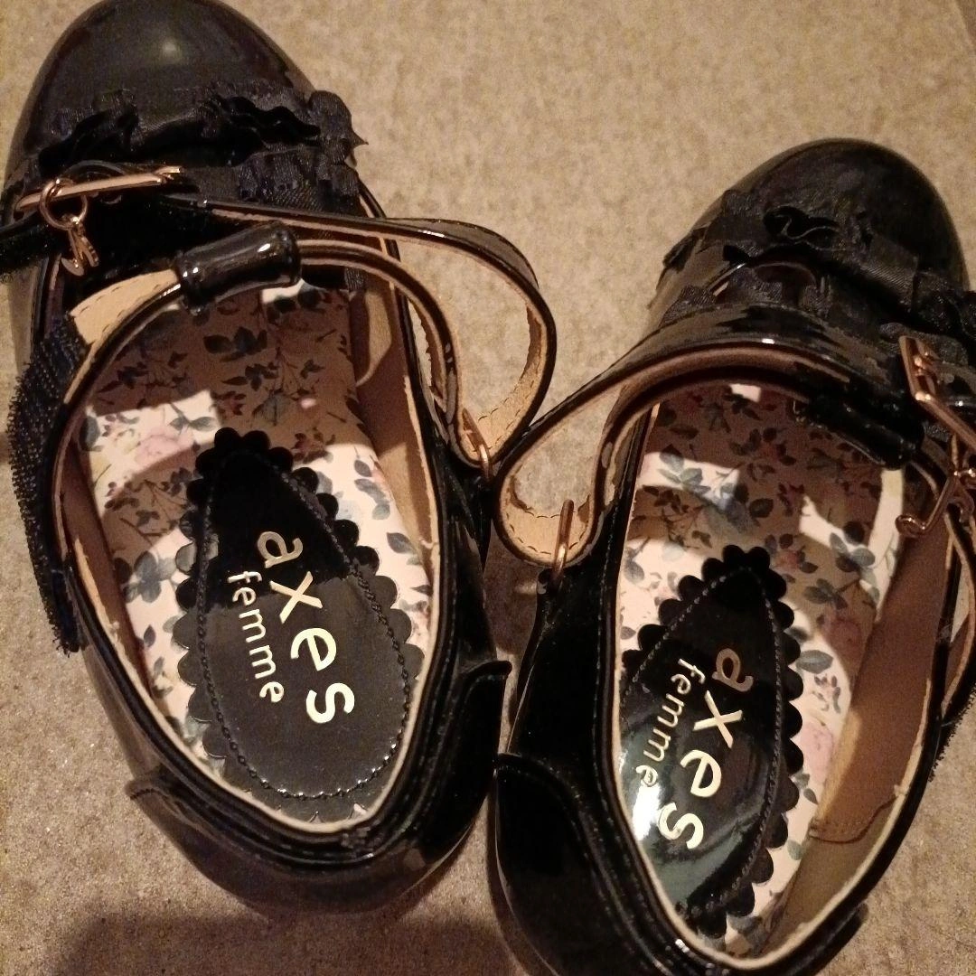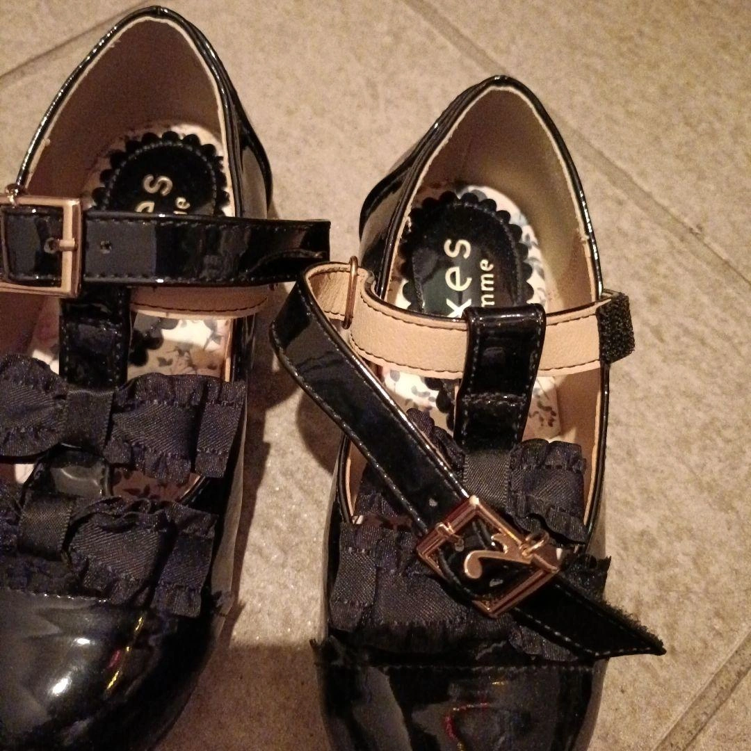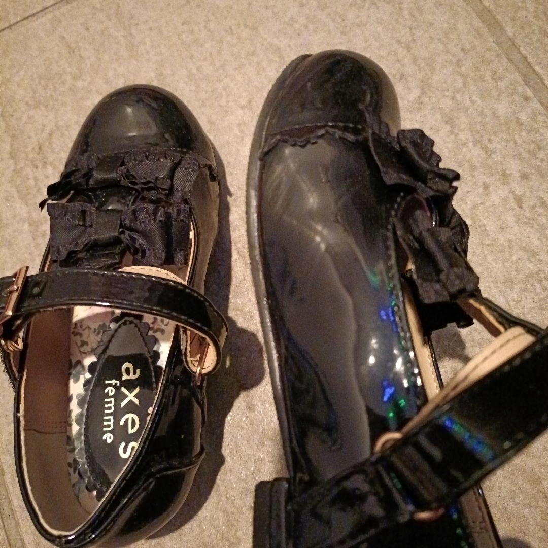リボン付きの黒い光沢のある合成皮革で、フォーマルなシーンにも 合うかと思います。 花柄のインソールが特徴です。 靴底に使用感がありますが、全体的に良好な状態です。卒園式や入学式に数回使用しました。 - ブランド: axes femme - 色: 黒 - デザイン: リボン付き - 素材: 光沢のある合成皮革 - 靴底の状態: 使用感あり - インソールデザイン: 花柄 ご覧いただきありがとうございます。