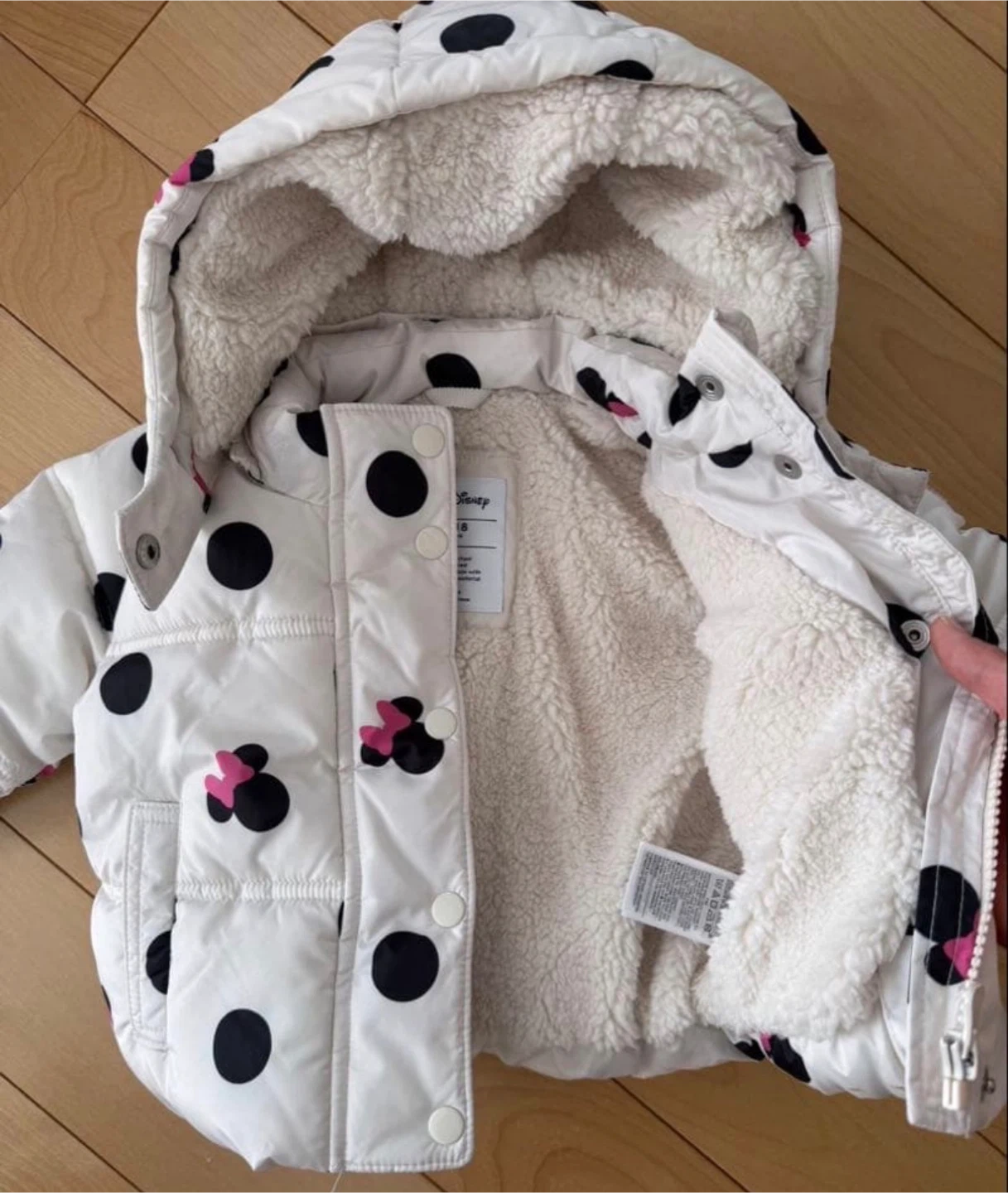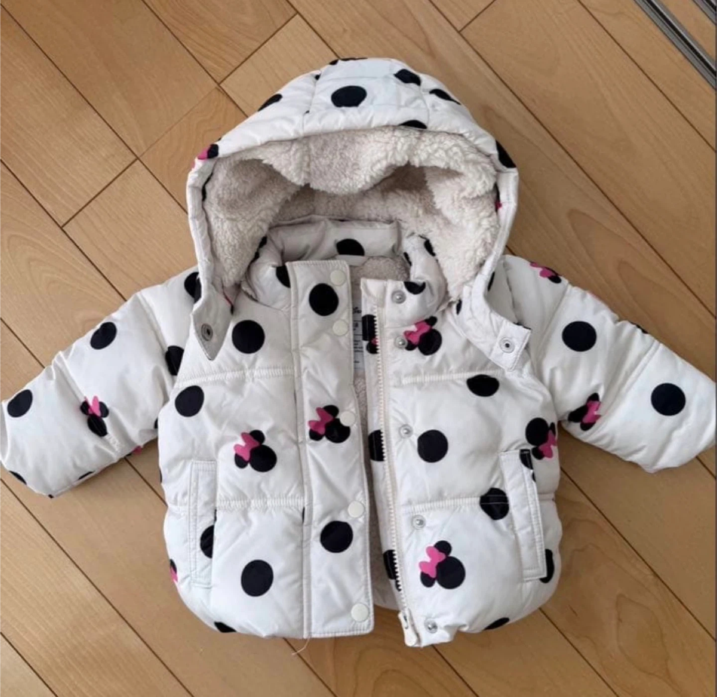 Disney × baby GAP(ベビーギャップ) ミニー柄ダウンジャケット(中綿アウター)です。 カラーはホワイトベースで、ミニーのシルエット柄がとても可愛いデザインです。sizeは70になります。 2025年2月ごろにいただきものですが、その時期は赤ちゃんがまだ小さく着用できず、1度も着せずに保管していました。 試着もほぼしておらず、使用感のないきれいな状態です。 ✔ フード取り外し可能(スナップボタン式) ✔ 内側はふわふわボアでとても暖かい ✔ 前開きファスナー+スナップで防寒性◎ ✔ 定価 12,900円 目立つ汚れや傷みは見当たりませんが、自宅保管の中古品にご理解いただける方のみお願いいたします。 よろしくお願いいたします。