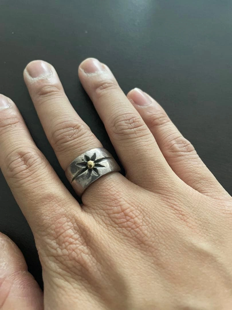 シルバー製のSUN(太陽)デザインリング、中央に小さな宝石付き。 - ブランド: BIGHAND - デザイン: SUNリング - 素材: シルバー925 - 付属品: 本体のみ - サイズ: 17〜18号 17に近いかと思います。 -元値:35,000円ほどしました ご覧いただきありがとうございます。 ご希望の方はお気軽にご連絡ください。