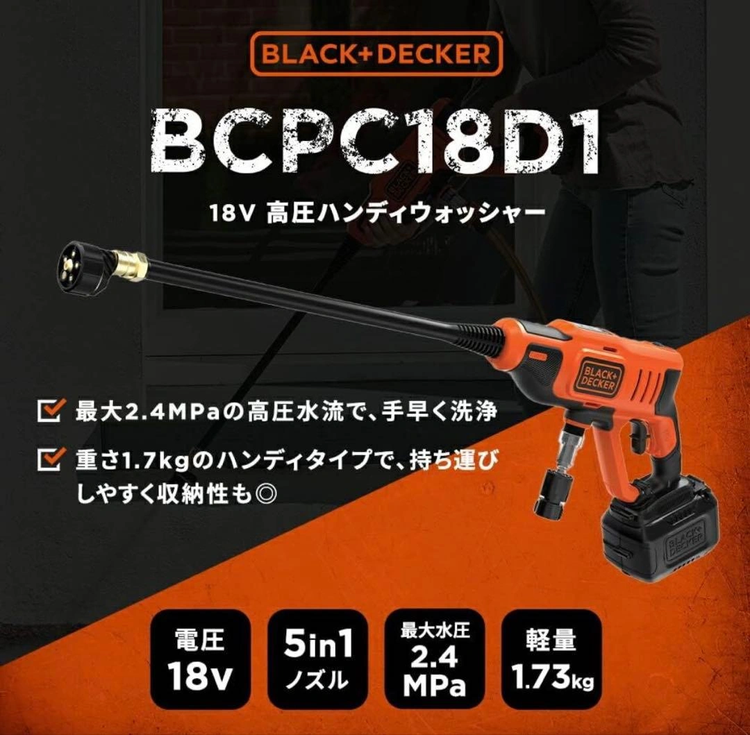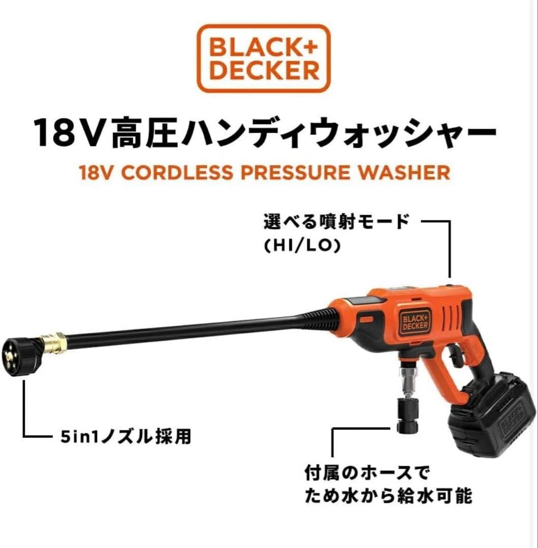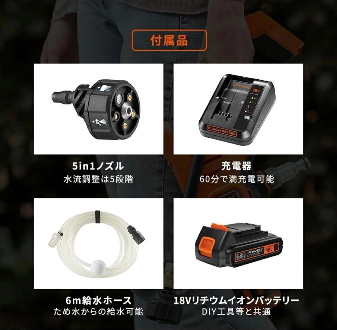ブラックアンドデッカー(BLACK+DECKER) 高圧 ハンディウォッシャー 5in1 - モデル名: BCPC18D1 - 電圧: 18V - 最大水圧: 2.4MPa - 重量: 1.73kg - ノズルタイプ: 5in1ノズル - 付属品: 充電器、6m給水ホース、バッテリー 配送された状態のままです。 * あくまでも中古品ですので、ご理解ください。 *中古品のため、完璧な品をお求めの場合はご遠慮ください。