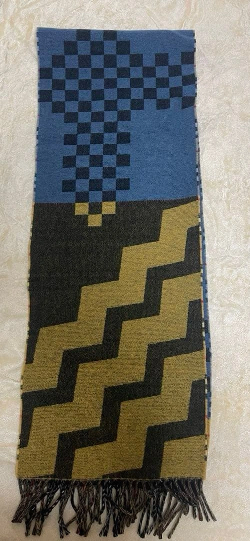 ウールとカシミアの混合素材で、チェック柄とグラフィックデザインが特徴のマフラーです。 - 素材: ウール71%、カシミア29% - 長さ: 長さ180cm × 幅30cm - デザイン: チェック柄、グラフィックパターン - 色: 青、黒、黄、ベージュ - フリンジ: あり [商 品の状態]ユーズド 使用に差し支えるような目立つ汚れやダメージは見受けられません。 ご不明な点があればご購入前にお気軽にご質問ください。 ご覧いただきありがとうございます。