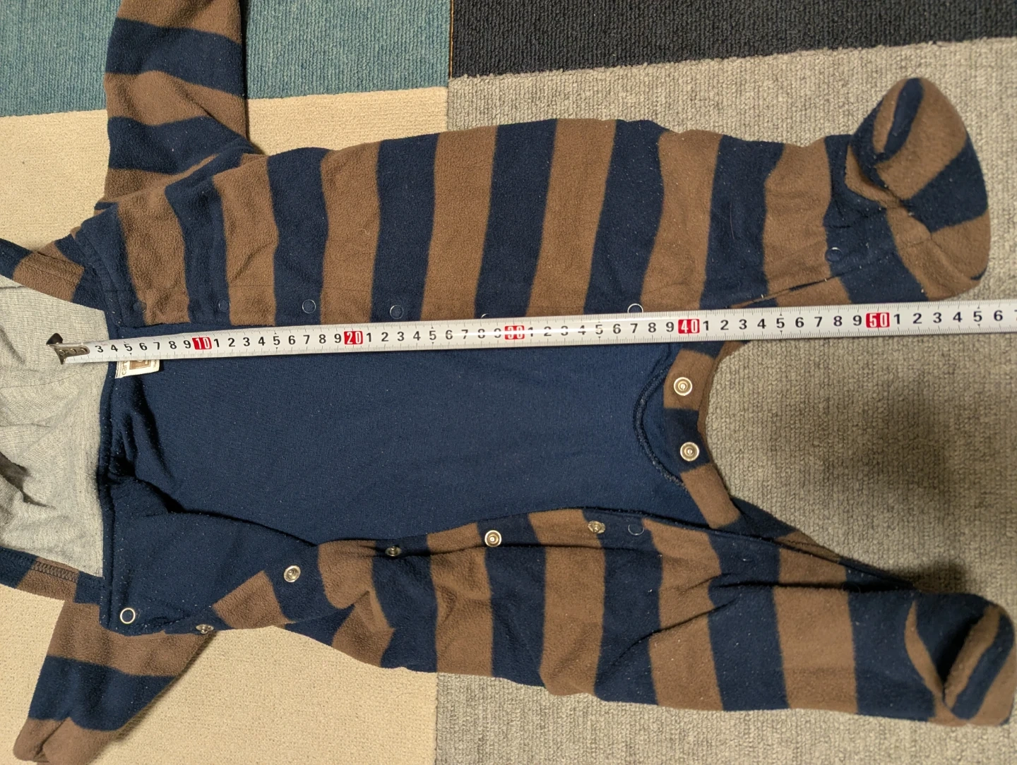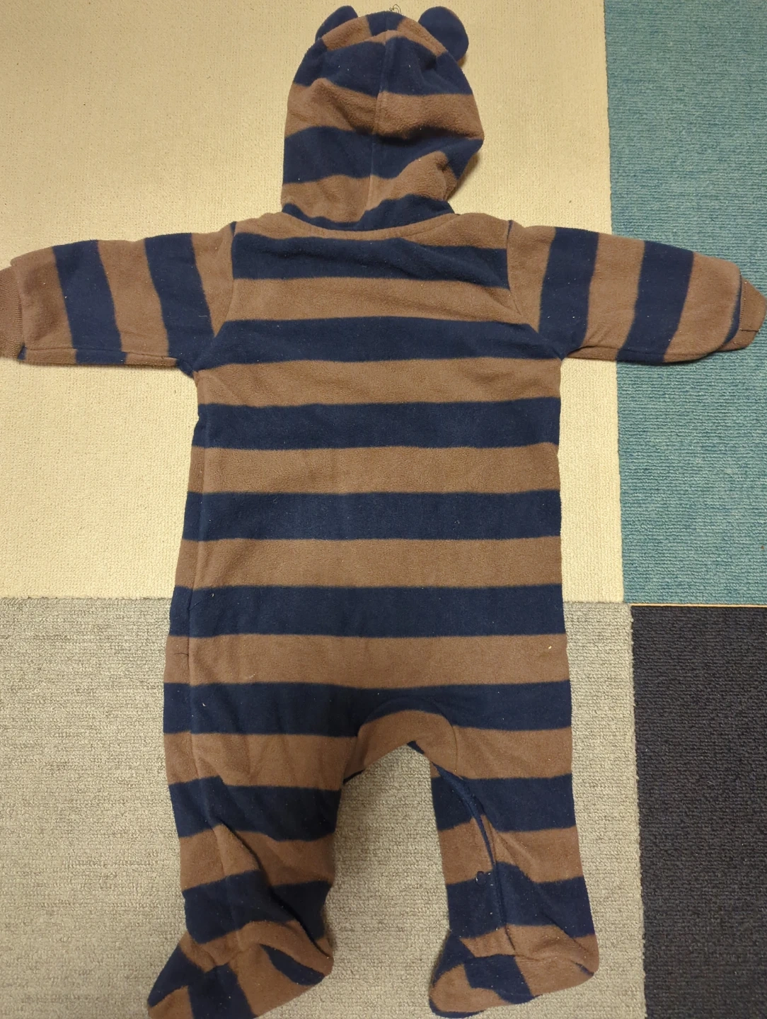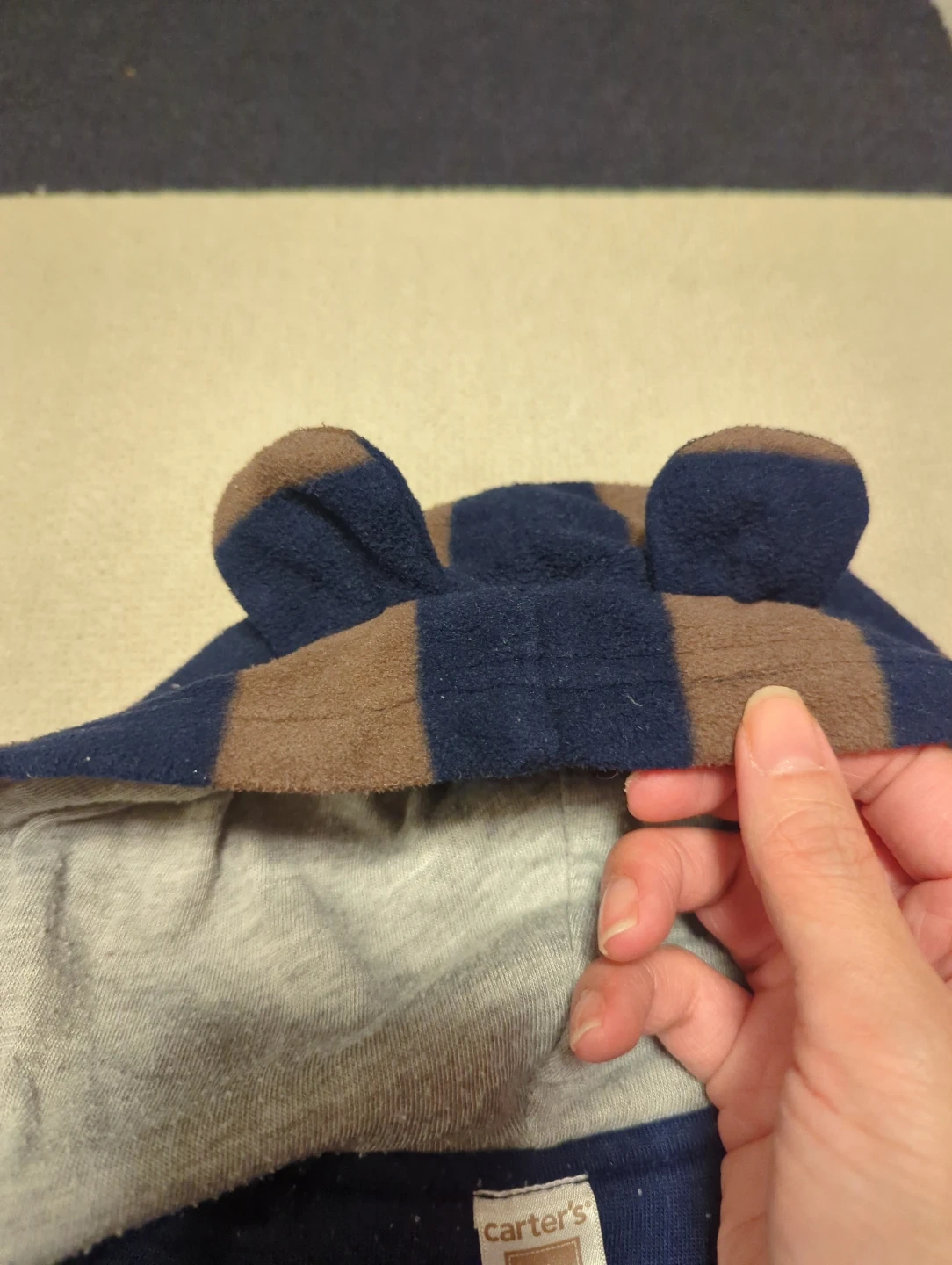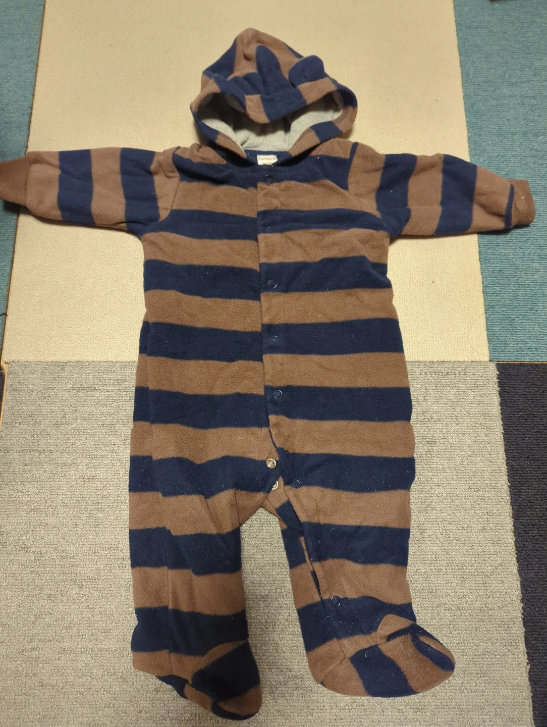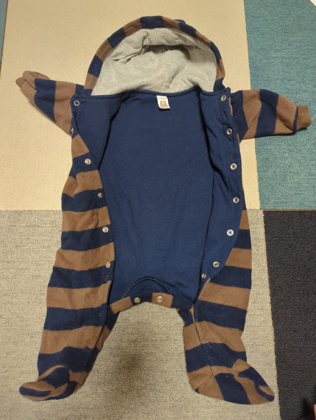 数ある商品の中からご覧になってくださりありがとうございます! carter'sのベビーロンパースです 子供がサイズアウトした物ですが、まだ着用できるのでお安くお譲り出来たらと思います(。・・。) 洗濯を何度かしていて多少縮んでいると思うので、サイズ感は6枚目をご覧ください 洗濯品で自宅保管の為、毛玉はありますが目立つ破損はありません ・ブランド:carter's ・サイズ:6 months ・色:茶色と紺色のボーダーでフードにクマの耳付き ・全体的に使用感はあり 中古品であることご了承の上、返品はご遠慮くださいませ もし目にとまりましたらご連絡ください! (子育て、仕事をしている為お返事に時間がかかることもございます)