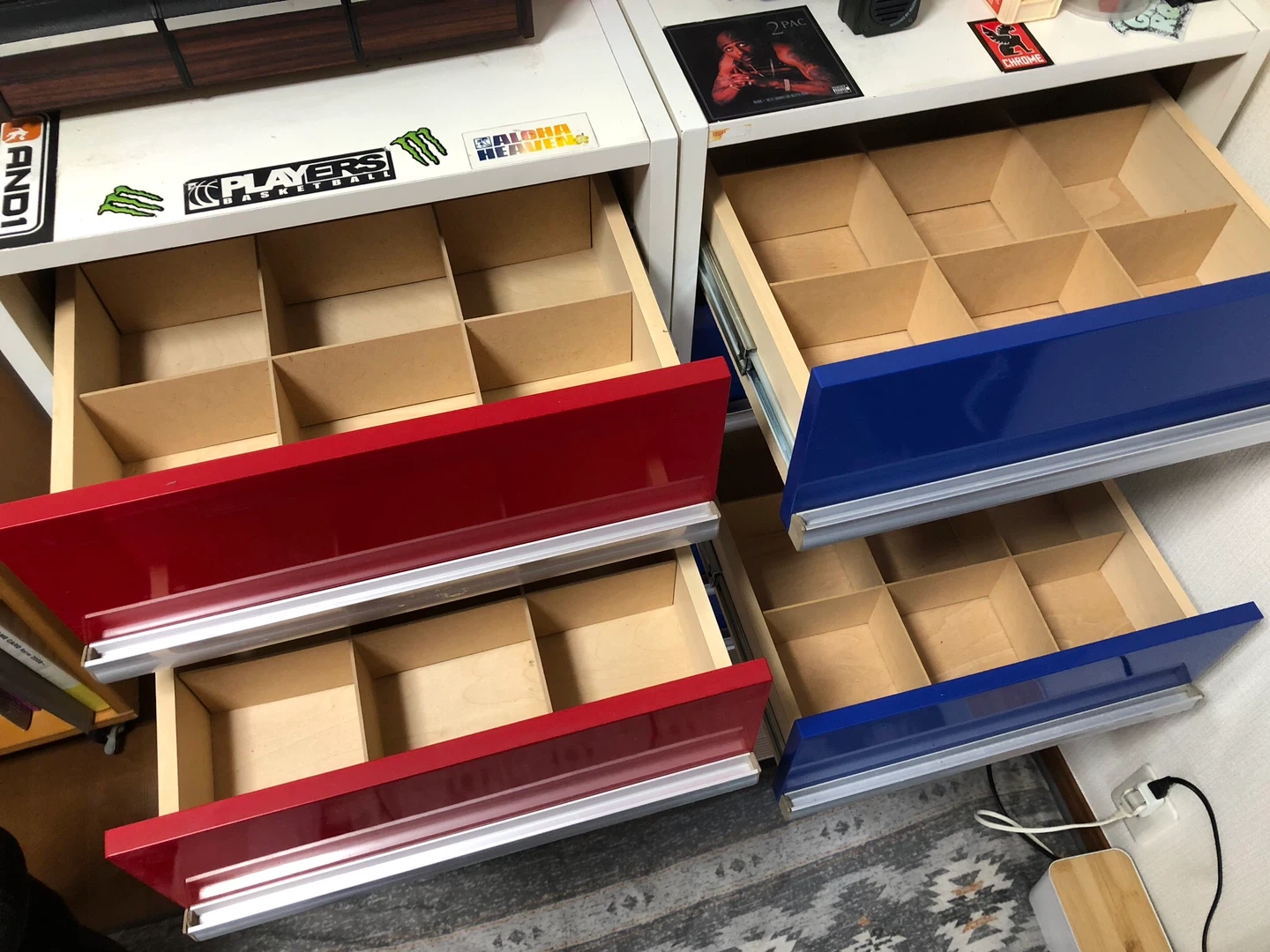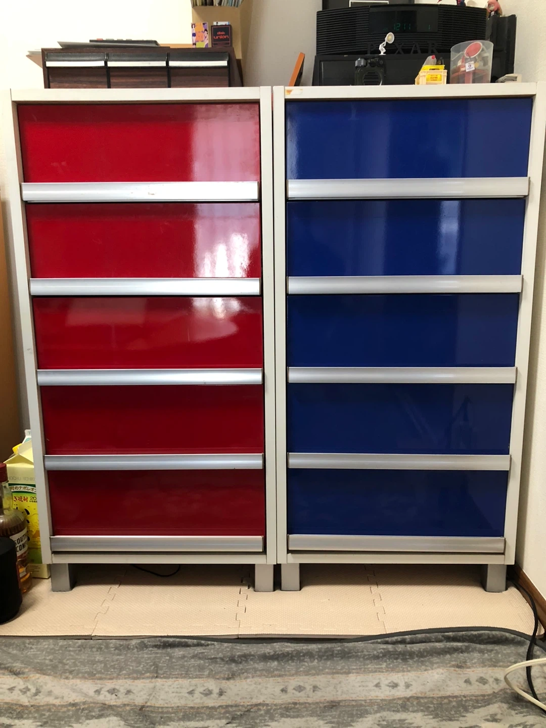 CDキャビネットのセットです。 ・色:赤、青 ・引き出し式 ・棚付き ・使用感あり 中古品であることをご了承ください。 1台約600枚収納可能。他の使い方も貴方次第。キズやステッカー貼りあり。 受け渡しには条件がありますのでお問合せをお待ちしております。