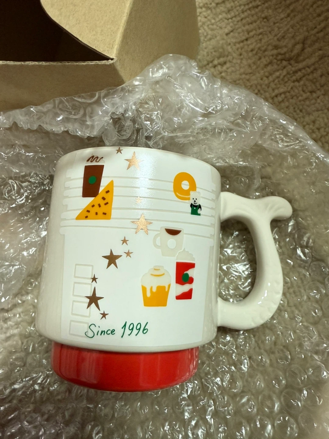 1. スターバックスのコレクタブルスタッキング 限定マグカップです。 25周年のテーマ「The Power of Coffee. The Power of Connection.」の記念のロゴマークがついていて、持ち手がサイレーンの尾がモチーフになっていて可愛いです。 ・容量 355ml ・Made in Japan 2. SABONのホリデー限定アイテムの付属品 コットンのトートバッグです ・色:オフホワイト ・デザイン:"MAGIC IN A BAG"のプリント入り ・年式:2020年 ・状態:未使用、未開封 3. CLARINSのハンドクリーム 星の王子さま 限定コレクションです ・ブランド:クラランス ・商品名:Le Petit Prince ハンドクリーム ・状態:未使用 未開封 ・定価:1430円 未使用なので綺麗ですが、細かい傷があるかもしれません。自宅保管品であることご了承ください。 4. シャネルの紙袋とギフトBOXです。 ホリデー限定リップを購入した時の付属品です。 ・ブランド:シャネル ・状態:使用感少なめですが、1枚目の写真にあるようにBOXの右上に折れがあります。 ・付属品:リボン、チャーム 自宅保管品であることご了承下さい。 5. スターバックスのカード用ギフトボックスです。 ・ブランド:スターバックス ・デザイン:花柄、Happy Springの文字 ・紙製 6. A to Zのマークが入ったマグカップ2個セットです ・色:濃い青 ・「A to Z」と「AWESOME PRODUCTS」のロゴあり ・容量:200ml程度 使用感少なめ、目立った亀裂や破損はありませんが細かい傷が気になる方はご遠慮下さい