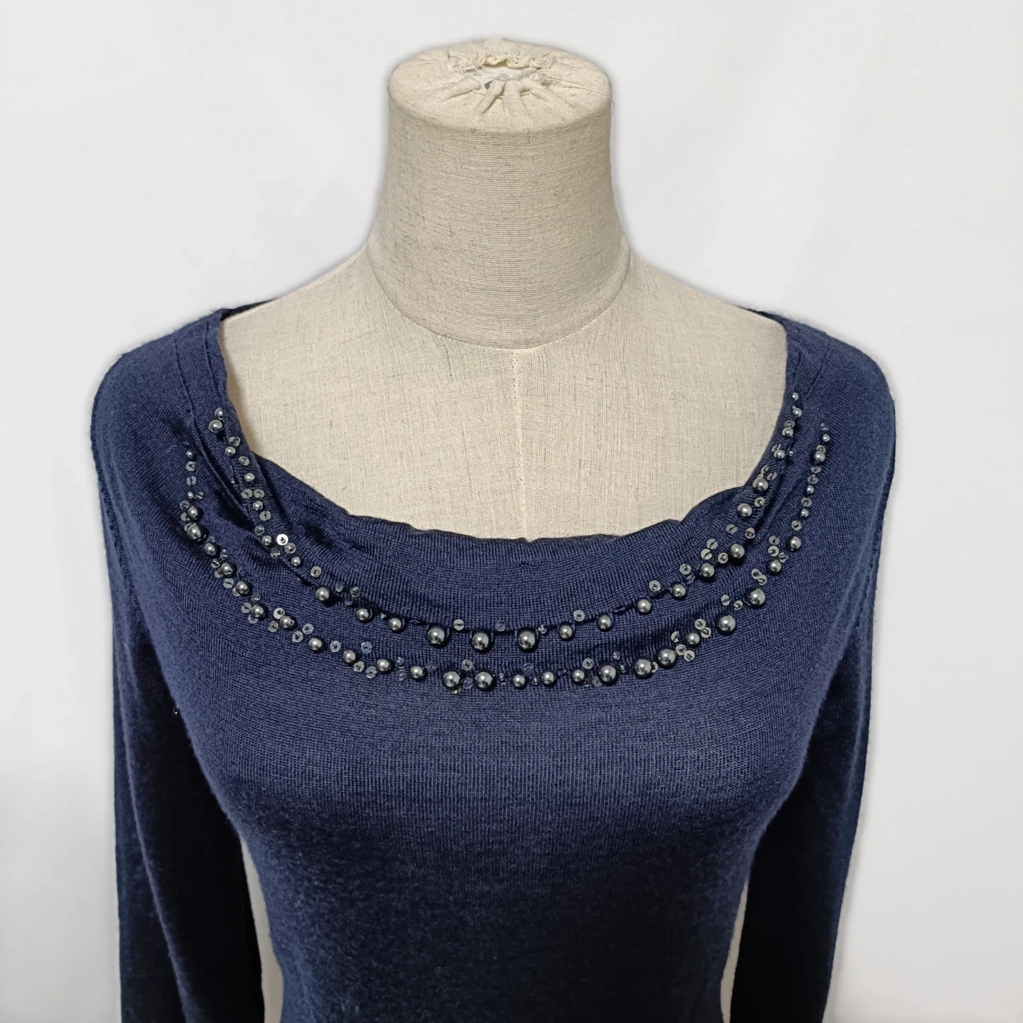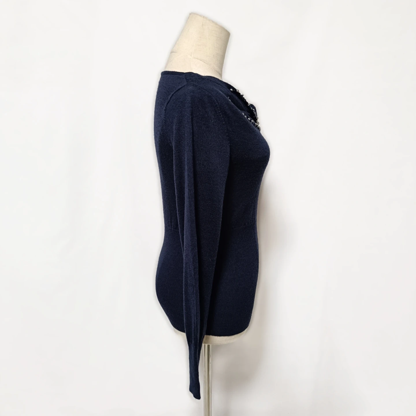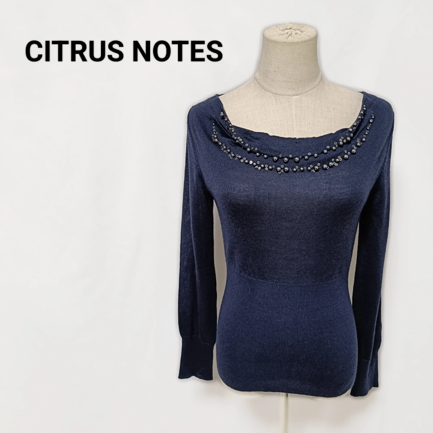 ご覧いただきありがとうございます! シトラスノーツらしい、女性らしくエレガントなシルエットのニットです。 デコルテラインを美しく見せる広めのネックラインには、贅沢にビジューとスパンコールがあしらわれており、アクセサリーいらずで顔周りが華やかに見えます。 ウエスト部分は細めのリブ切り替えになっており、自然にシェイプされるため、スタイルアップ効果も抜群です。 □商品名□ CITRUS NOTES シトラスノーツ ビジューニット ネイビー 羊毛混 M □ブランド□ CITRUS NOTES シトラスノーツ □表記サイズ□ M □実寸サイズ(cm) □ 着丈:53 肩幅:36 身幅:38 袖丈:62 ※実寸につきまして多少の誤差はご了承ください。 ※表記サイズだけではなく実寸のサイズをご確認ください。 □カラー□ ネイビー(濃紺) □素材□ 羊毛(ウール)50%、アクリル50% 羊毛混で暖かく、しっとりとした肌触りの良いハイゲージニットです。 □コンディション□ 目立った汚れやダメージなど特にございません。 ※汚れはできる限り写真にて掲載しております。まずは画像をご確認ください。 どうぞよろしくお願い致します。 □商品管理番号□ K3-R-5649