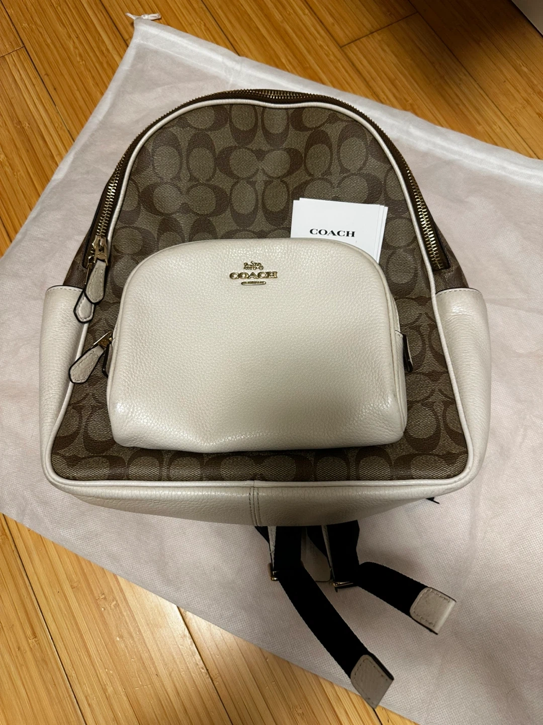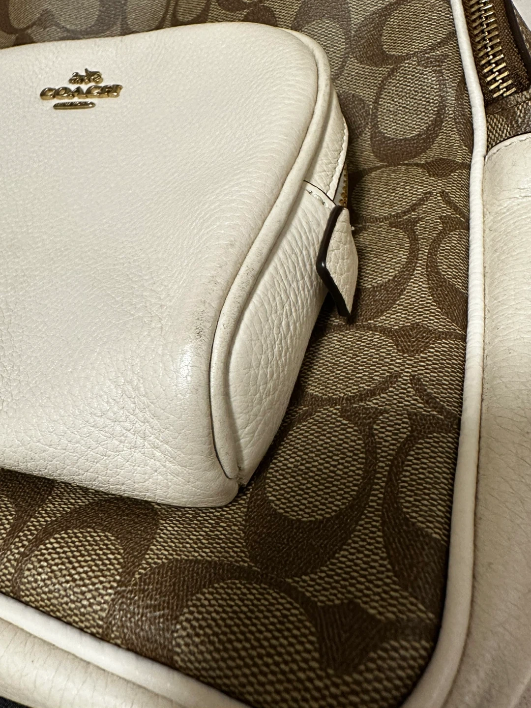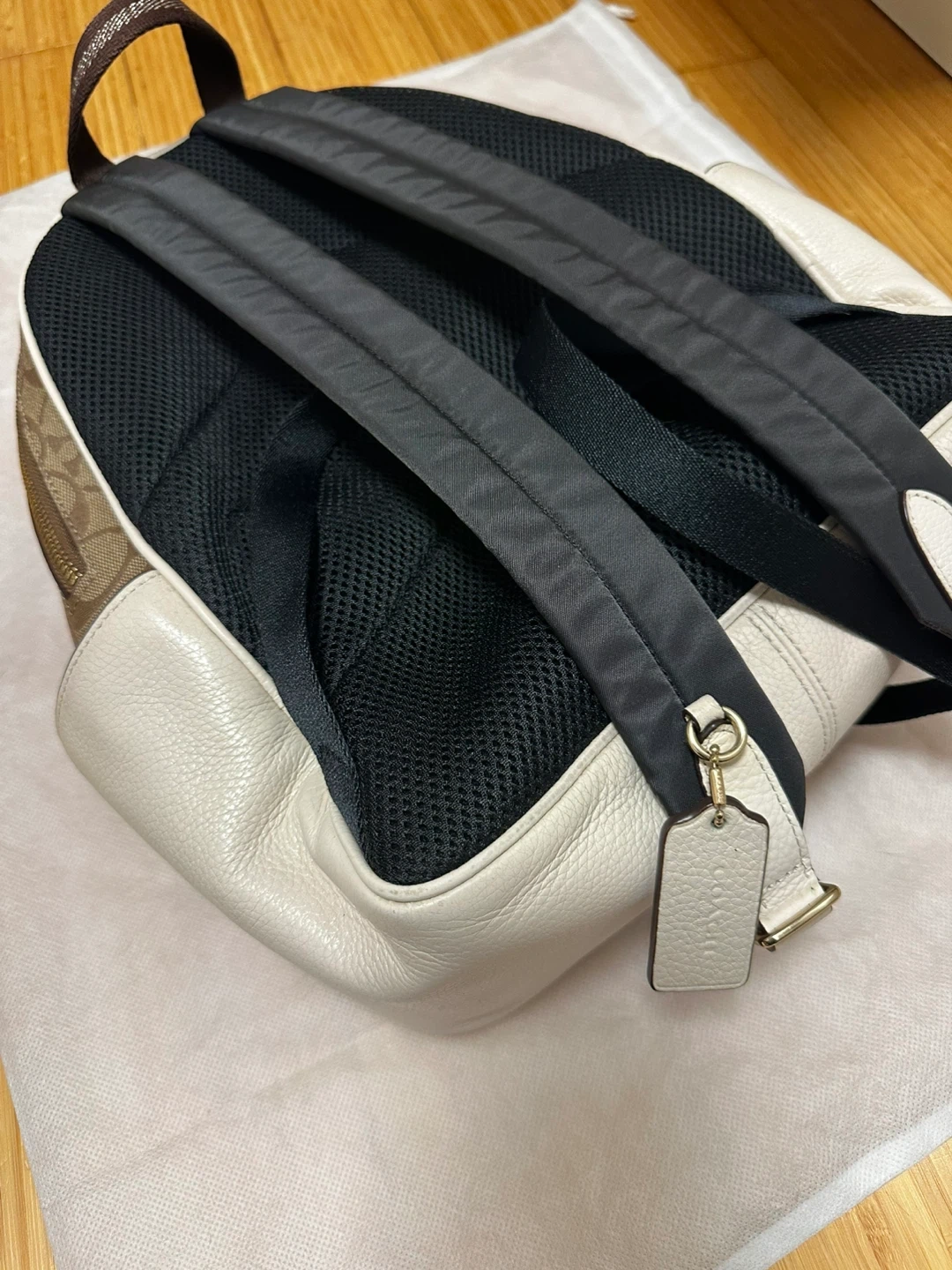 コーチのリュックサックです。 【情報】 ブランド:コーチ 【状態】 使用感あり (使用回数は2~3回ですが、経年による一部汚れがあるのと、猫が乗ってしまったので型崩れしていますが、ある程度物を入れると問題なく使えます。) 【付属品】 保存袋、レザーモイスチャライザー、取り扱い説明書 アウトレットパークで3.3万ほどで購入しましたが、ワケありなので半額以下にしています。
