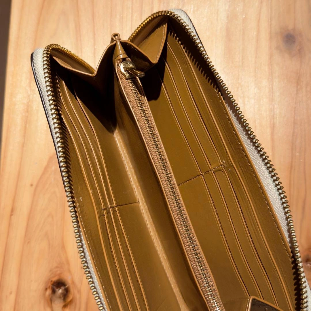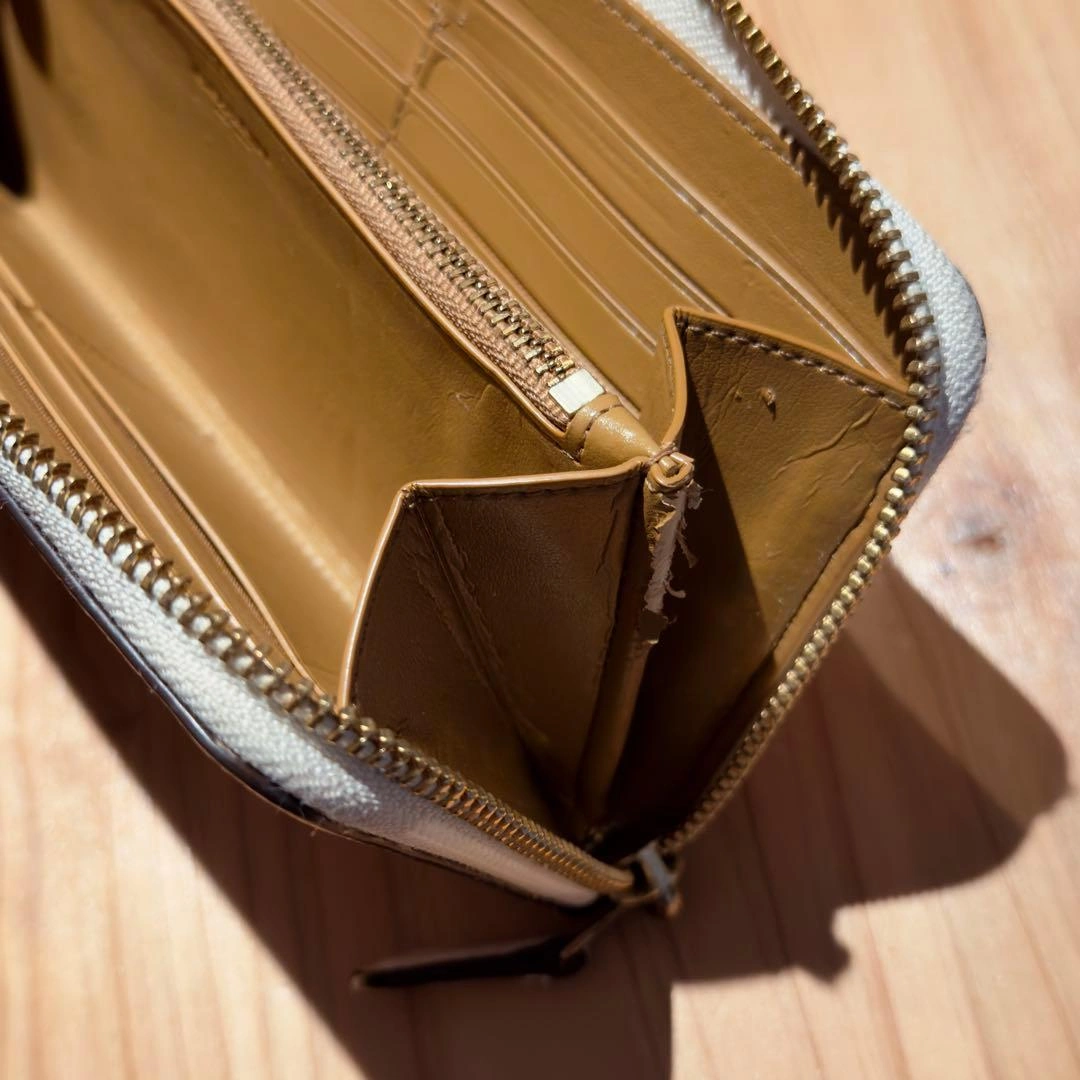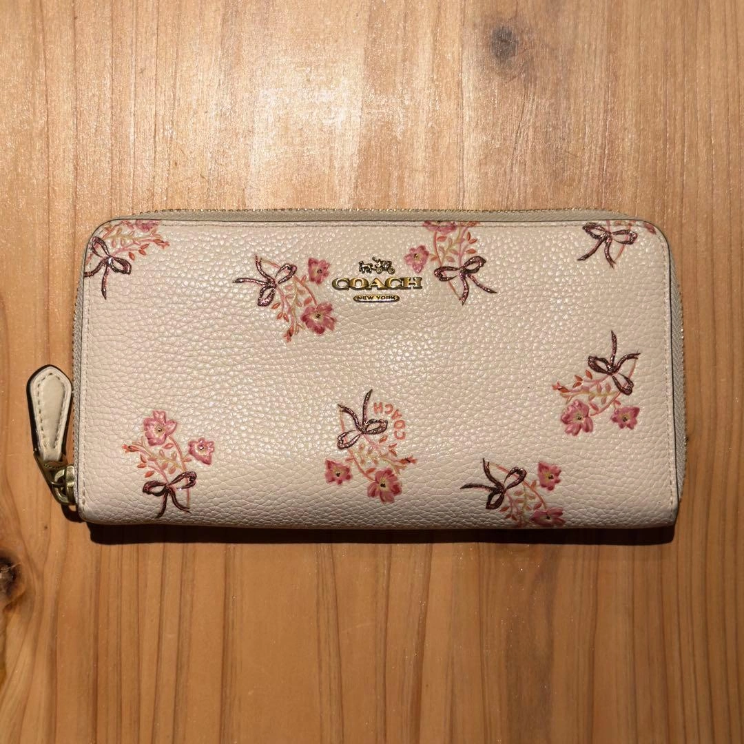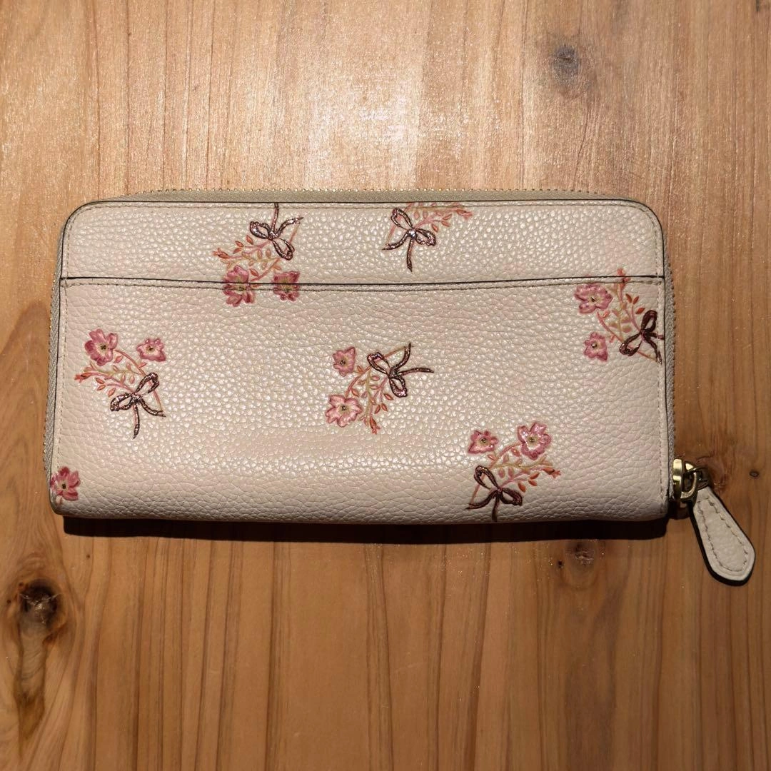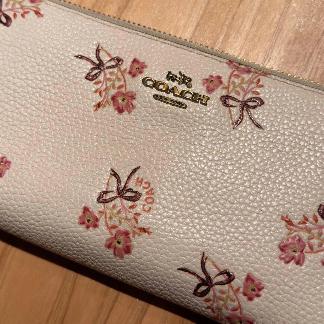 COACH コーチ レディース レザー 長財布 ラウンドファスナー 花束の柄で、リボン部分にはラメが入っておりシンプルかつ可愛らしいデザインです。 ファスナーの不調もなく、表には目立った汚れはありません。ファスナー周りがすこし変色しています。 中は、一部剥がれがあったりコインケース内に変色があったりします。 百貨店のCOACH店頭にて購入しました。 状態について写真でご確認の上、ご購入お願いいたします。