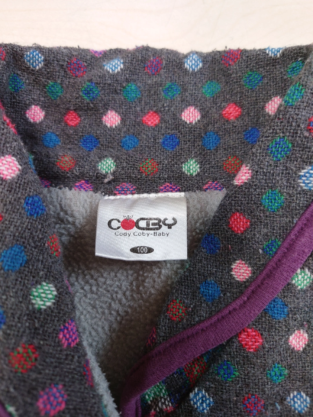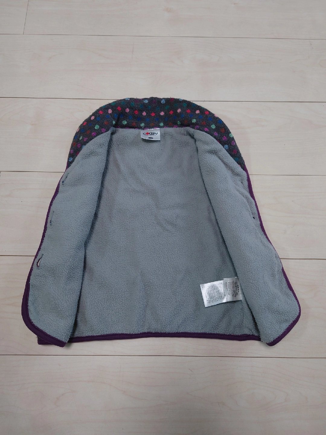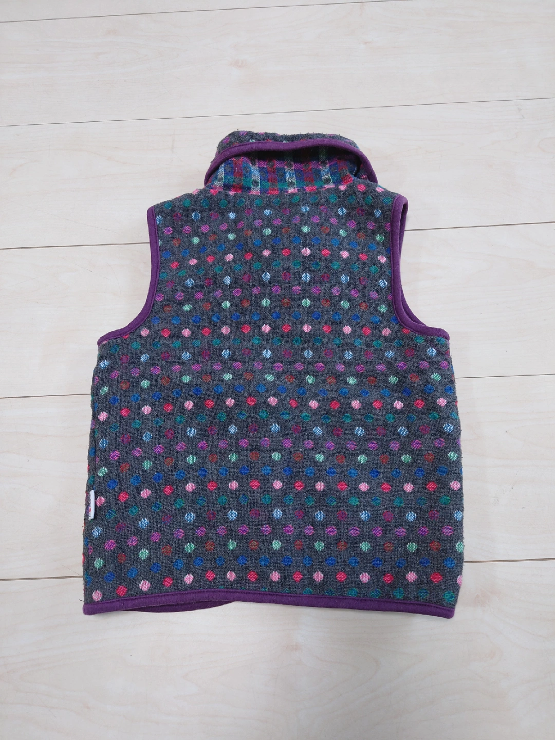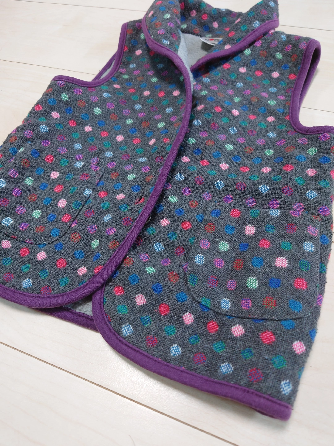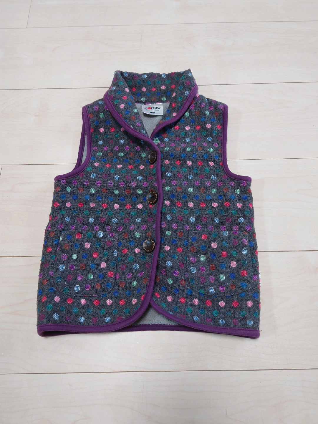 ジャガード生地のボタン留めベスト、100cmです。外遊びにも室内で肌寒い時にも使えます。ベストなので、お子様の活動の妨げになりません。こらからの季節にいかがでしょうか。 受け渡し場所は、中野富士見町駅以外にも東高円寺や新中野駅等対応できますので、お気軽にお声かけください。