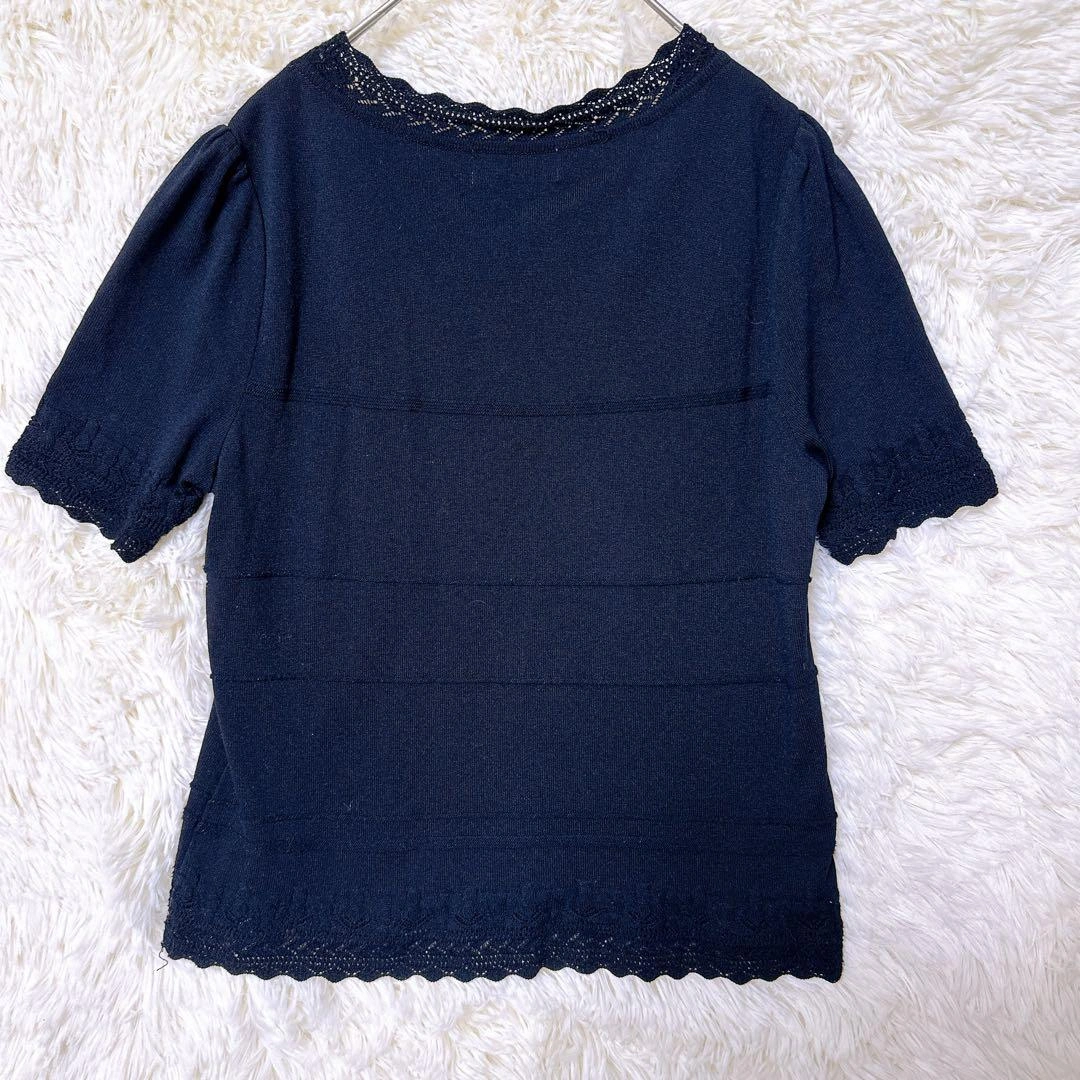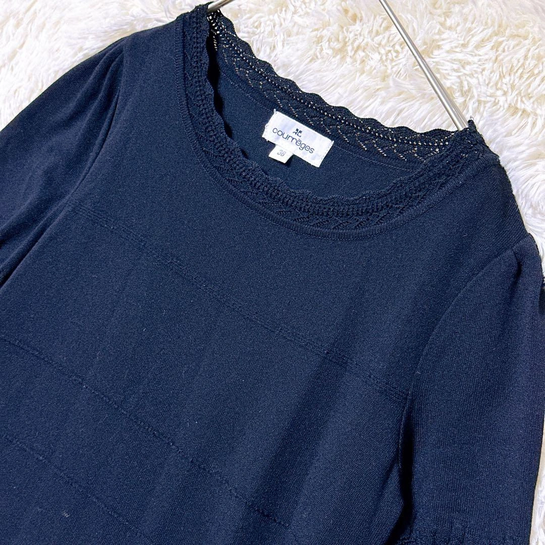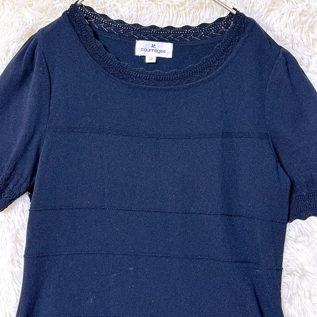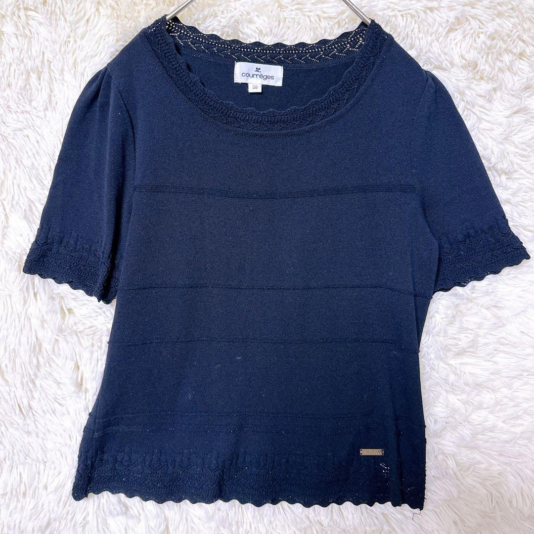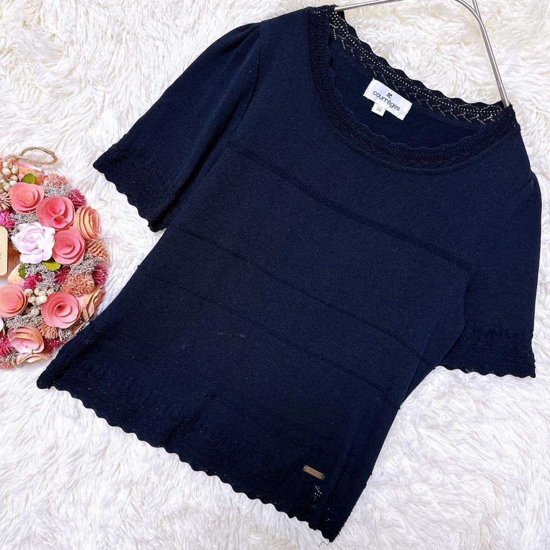 あたたかさご覧頂きありがとうございます。 courrèges クレージュの半袖ニットです。 カラー:ブラックネイビー 素材は写真でご確認ください。 サイズ:38(Mサイズ相当) 着丈:48cm 身幅:41cm 肩幅:32cm 袖丈:22cm ※素人採寸のため、多少の誤差はご了承ください。 レース付きのクルーネック、裾にフリルがあります。お腹周りに少し白い汚れがありますが、あまり目立ちません。写真にてご確認ください。 ご希望の方はお気軽にご連絡ください。