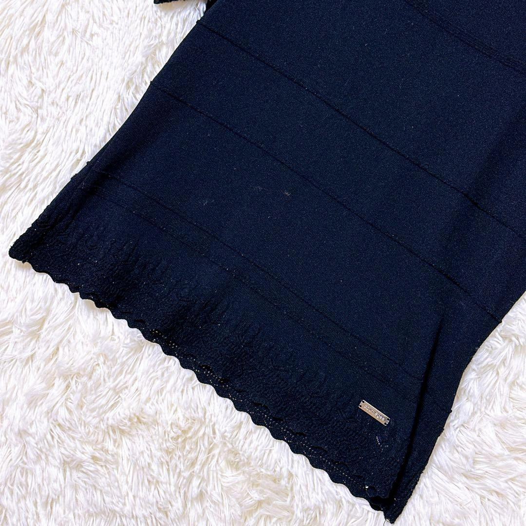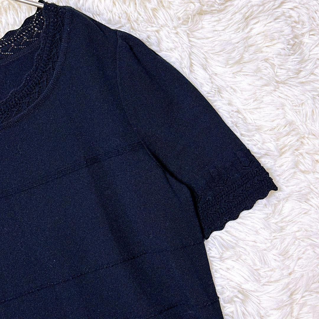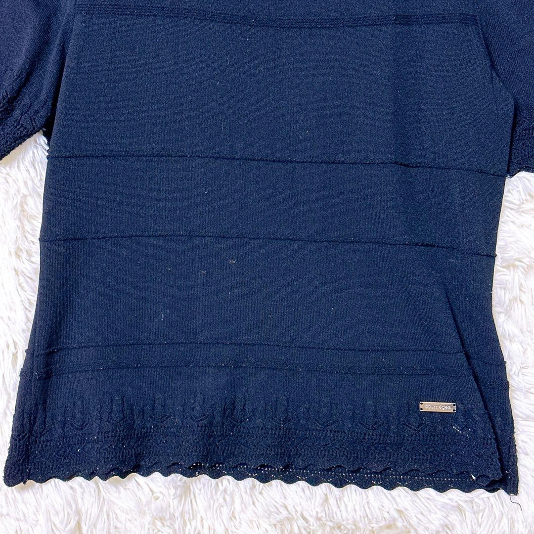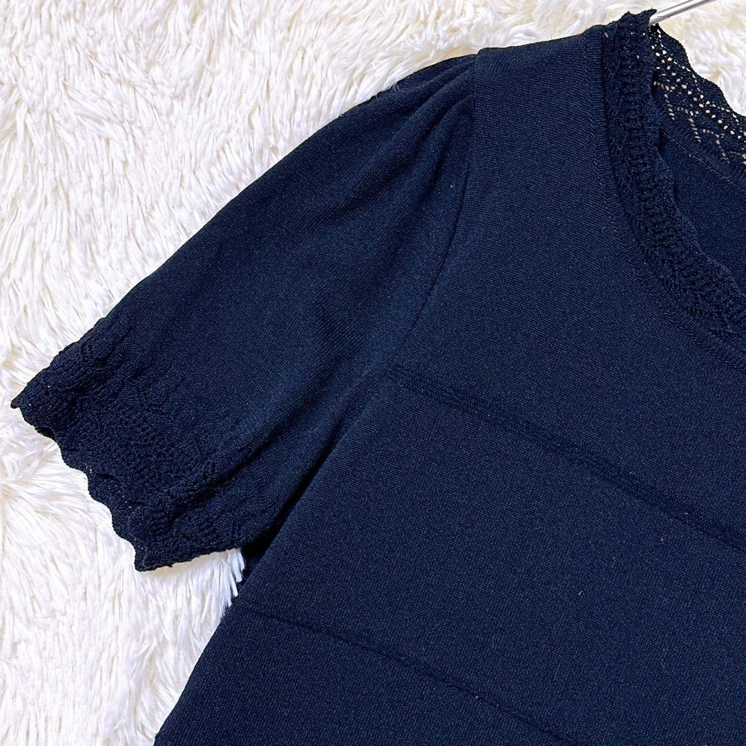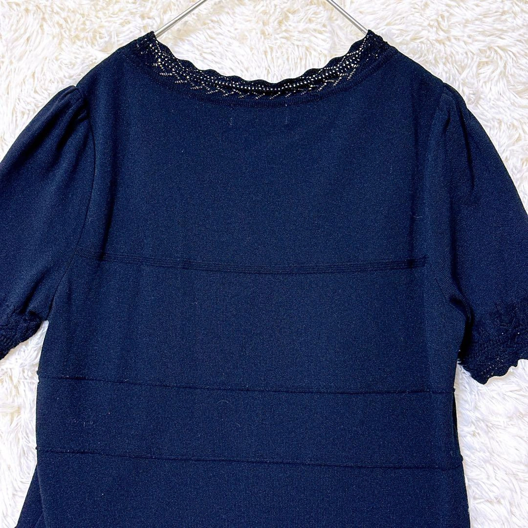 あたたかさご覧頂きありがとうございます。 courrèges クレージュの半袖ニットです。 カラー:ブラックネイビー 素材は写真でご確認ください。 サイズ:38(Mサイズ相当) 着丈:48cm 身幅:41cm 肩幅:32cm 袖丈:22cm ※素人採寸のため、多少の誤差はご了承ください。 レース付きのクルーネック、裾にフリルがあります。お腹周りに少し白い汚れがありますが、あまり目立ちません。写真にてご確認ください。 ご希望の方はお気軽にご連絡ください。