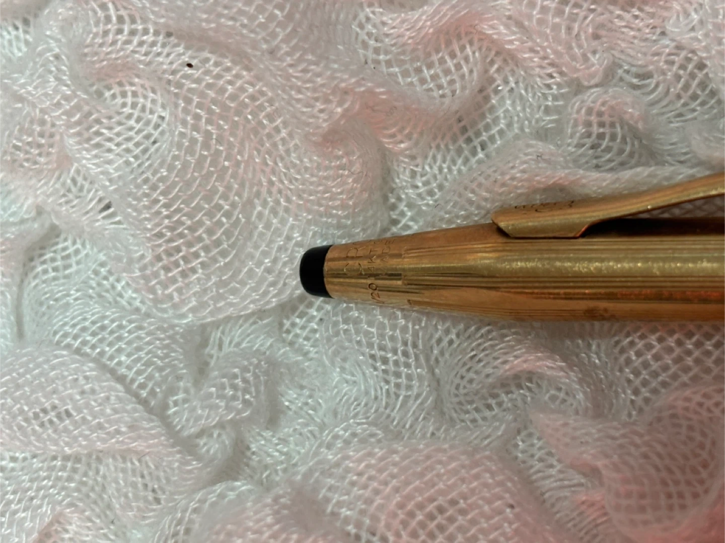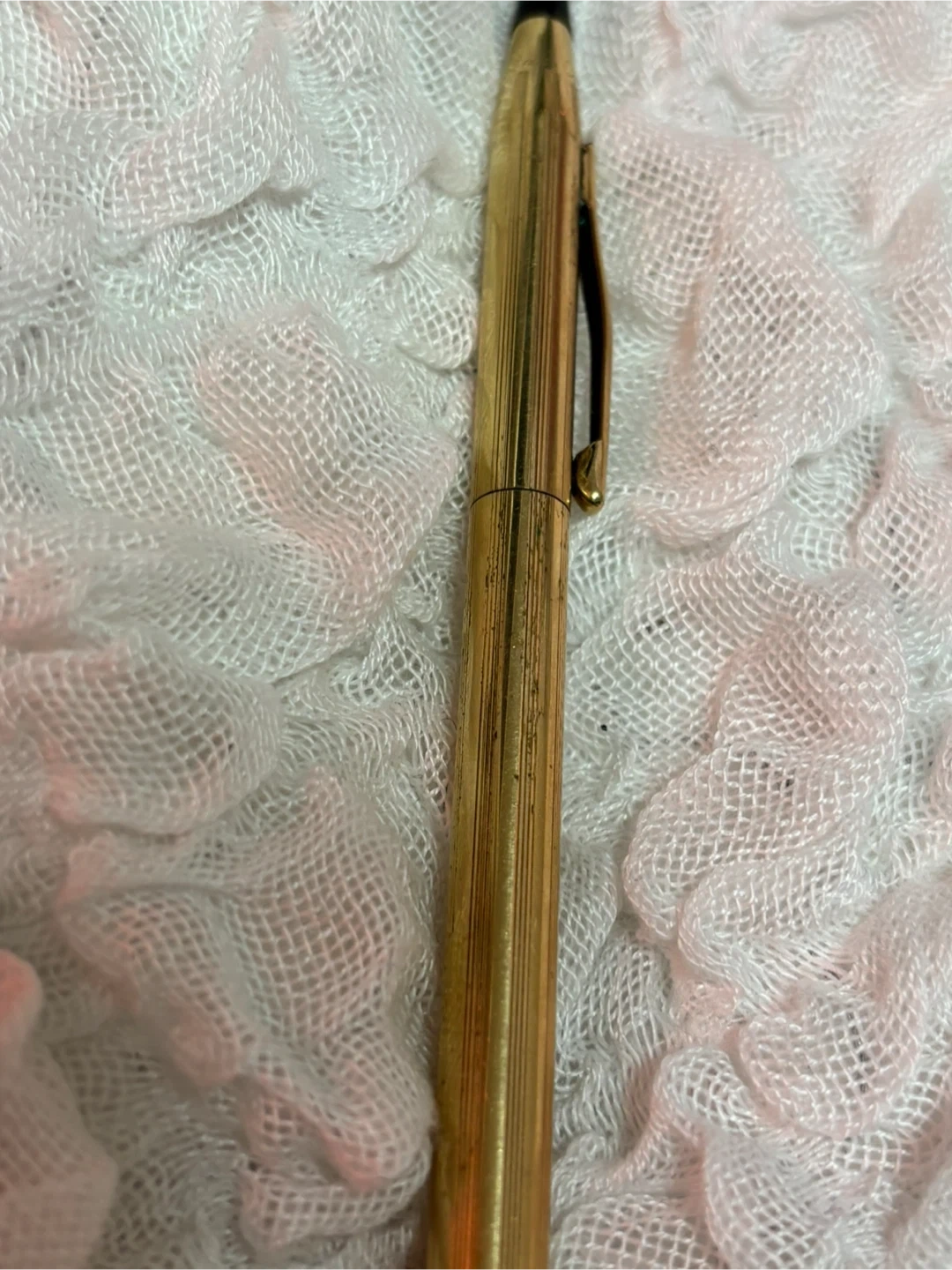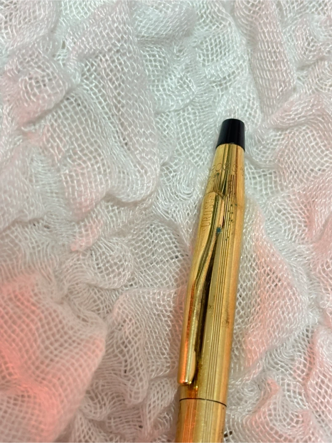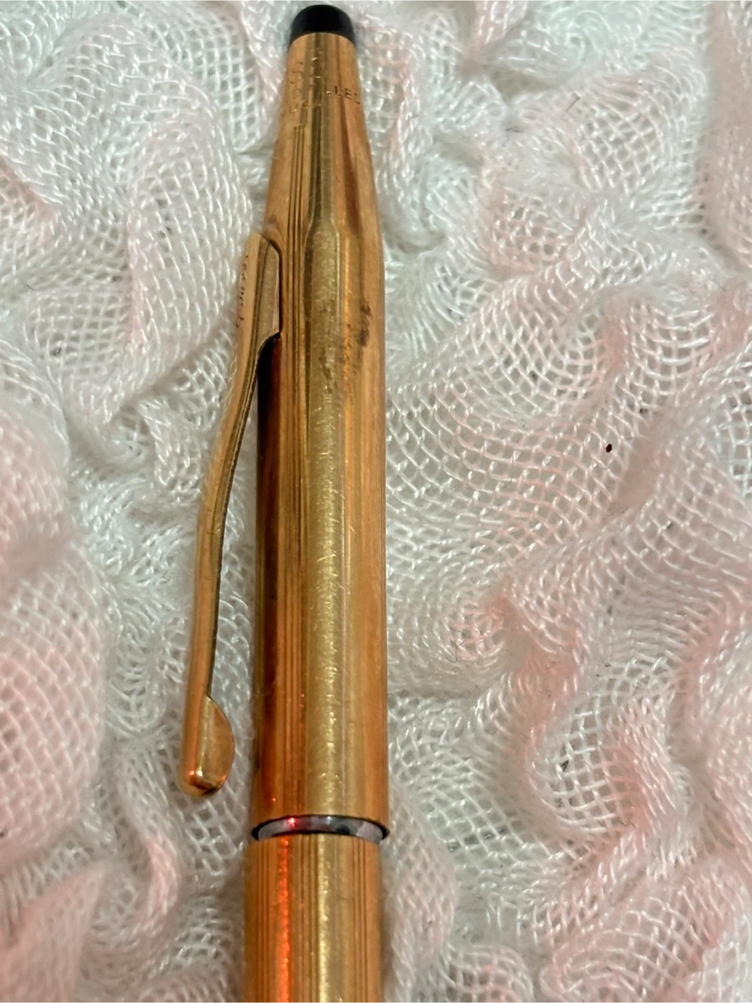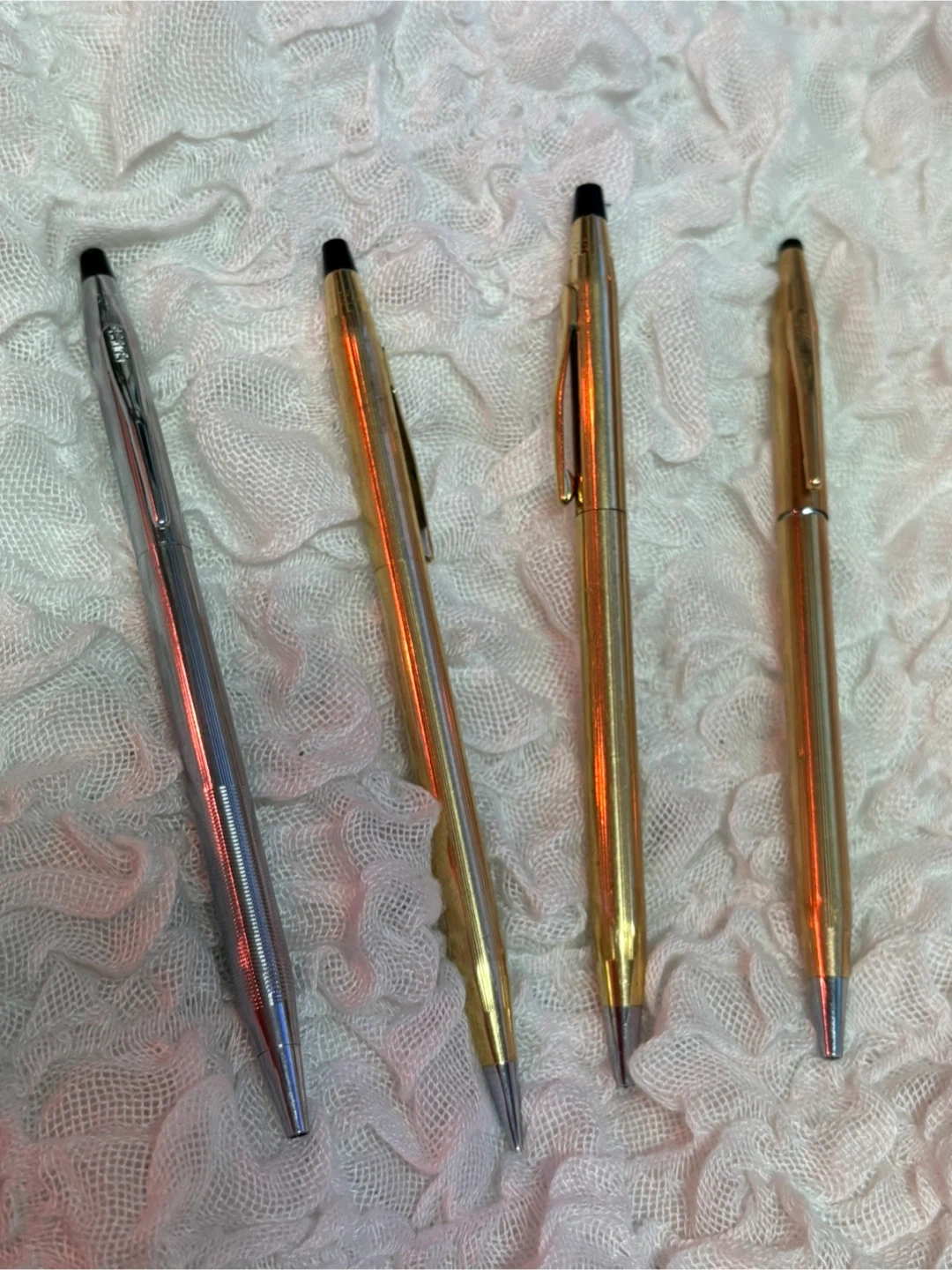 全て使い込んだ中古品です。 4本中1本は現在使い物にならない状態です。 cross のクラッシックセンチュリーは機械生涯保証付きですので(クリップの開きや表面上の傷などは対象外)crossの公式サイトから修理に出してみても良いかもしれません。 ◯cross クラッシックセンチュリーボールペン クローム 現在赤のインクが入っており使用可能です。 全体的に小傷あり。 ◯crossクラッシックセンチュリーペンシル 12金張り 現在ペンシル芯が入っており使用可能です。全体的に小傷あり。一部に変色、クリップの裏側の目立たないところに若干緑青のような変色が見えます。ペンシル使用時には見えません。 ◯cross クラッシックセンチュリーボールペン12金張り 現在黒のインクが入っておりますがインク切れ間近なようなのでインク交換が必要です。 全体的に小傷、ところどころ点状の変色やクスミ、クリップの付け根や裏に少し緑青が出ています。 ◯crossクラッシックセンチュリーボールペン14金張り 修理が必要な状態です。 現在青のインクが入ってます。インクは使用可能ですので他のcrossのボールペンに使っても良いかもしれません。 全体的に小傷、部分的に変色やクスミ、クリップの開きがあります。 全て本体のみ