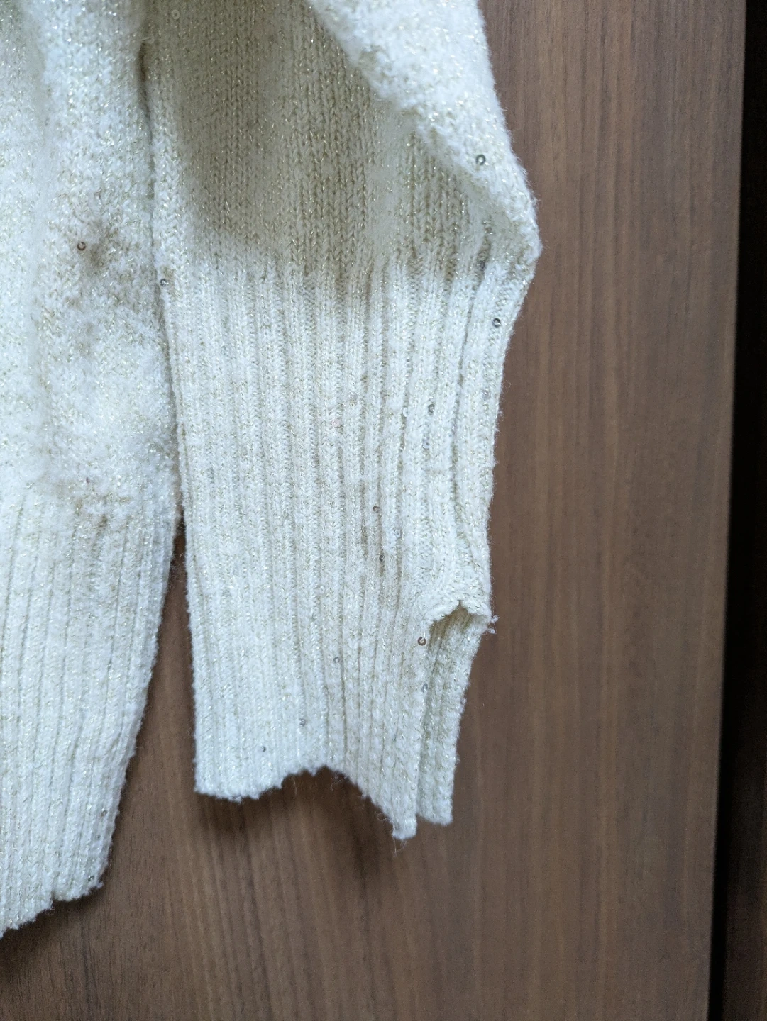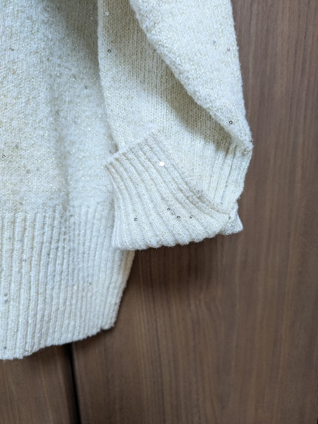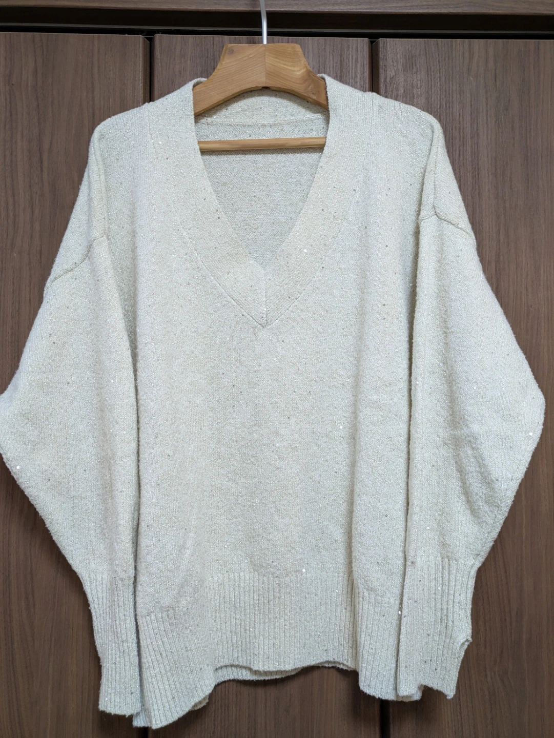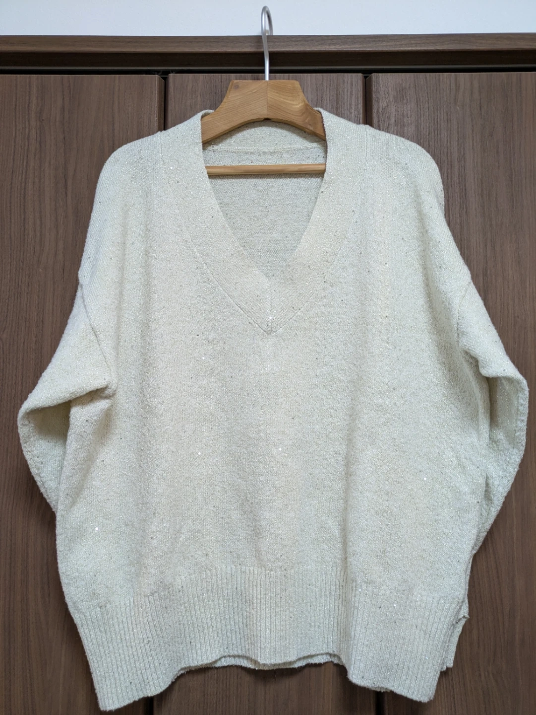 【Doux archives】ドゥアルシーヴ Vネック スパンコールニット アイボリー スパンコールとラメが煌びやかな一枚 【point】 ・顔周りをすっきりと見せてくれるVネック ・シャツやハイネックのレイヤードもおすすめ ・スパンコールとラメ糸が華やかな印象 ・肩が落ちるドロップショルダーなので楽に着ていただけます ・お尻にかかるくらいの丈感でお腹周りをカバー 【fabric】 ・柔らかく軽い素材感 アクリル 57% ポリエステル 40% ポリウレタン 3% (スリット糸使用) 【size】 F 着丈ニット:70 身幅ニット:62 肩幅ニット:59 ゆき丈 袖丈ニット:49 【color】 IVORY(アイボリー) 参考URL https://item.rakuten.co.jp/0101marui/ce016533630101/?scid=wi_ich_androidapp_item_share 【お取引場所】 JR大森駅またはJR蒲田駅 (平日夜はJR品川駅でも対応可)