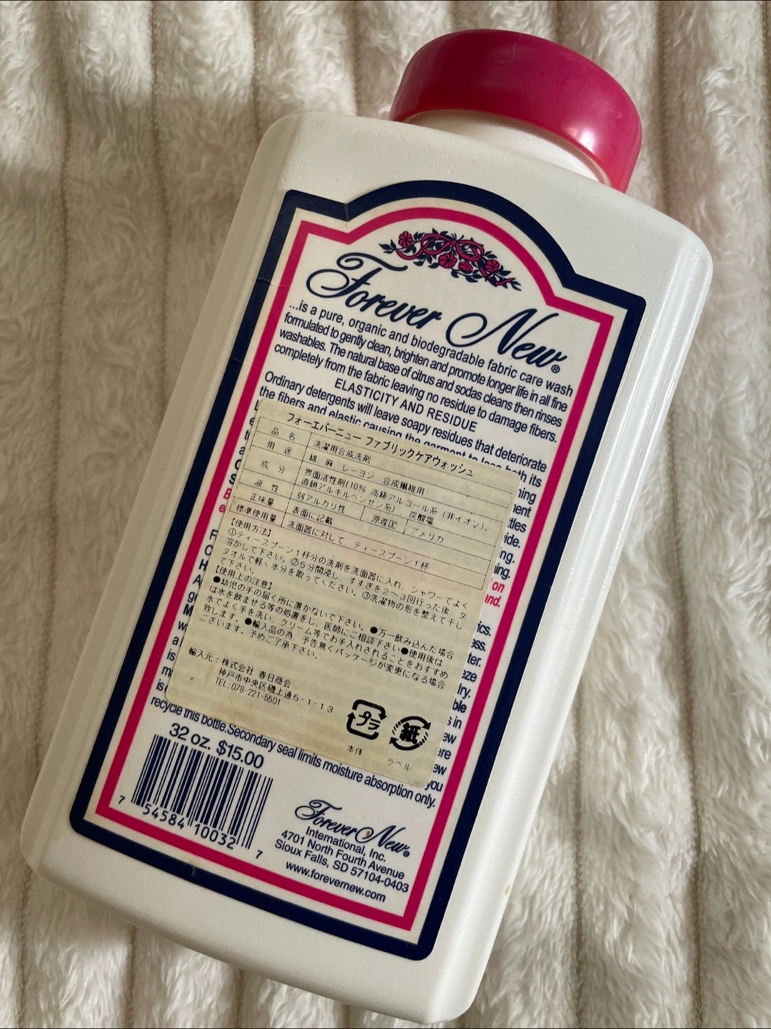 ・容量:32 oz (908g) ・FABRIC CARE WASH フォーエバーニュー ファブリックケアウォッシュ 下着用洗剤として長く愛されていることで有名な洗剤です•*¨*•.¸¸♪ デリケートなアイテムのお洗濯におすすめ わたし自身は手洗いのランジェリー用に使っておりました 容器込みで666gあります 飾っておくだけでも可愛いです☺︎ 重さがあるため海外に持って行くのを断念