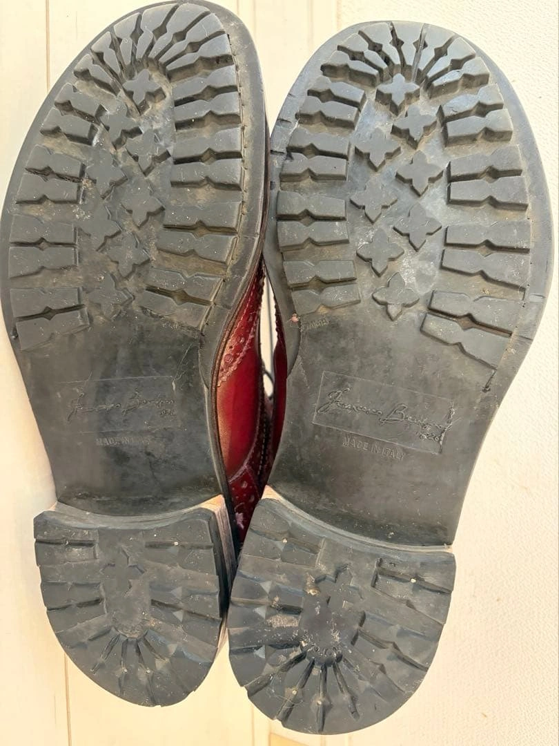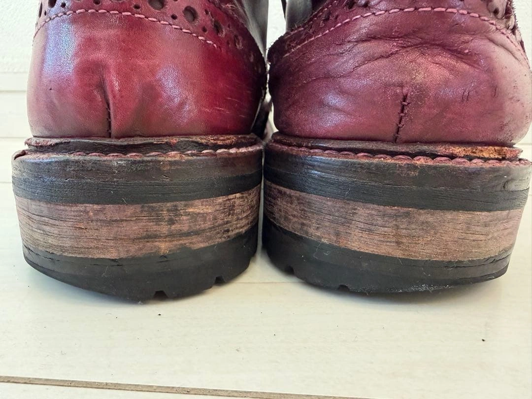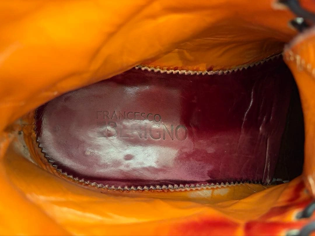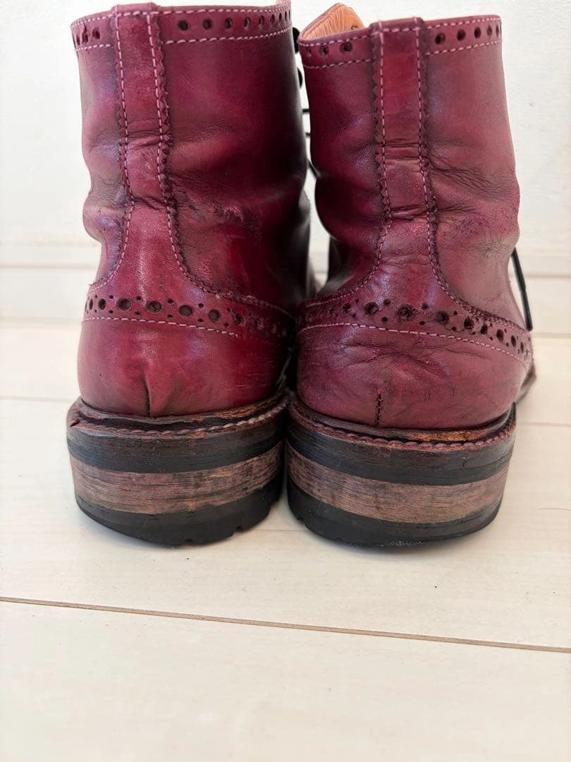 FRANCESCO BENIGNOのウイングチップデザインのレースアップブーツです。表側がワインレッド、裏側がオレンジとカジュアルからきれいめまで幅広いスタイルに合わせやすい一足です。 【カラー】レッドブラウン系 【デザイン】ウイングチップ、レースアップ 【商品の状態】全体的に使用感があり、つま先やかかと部分に擦れや傷が見られます。ソールの減りも若干ありますが、まだまだご着用いただけます。 【製造国】イタリア 【サイズ】表記は見当たりませんが、自身のサイズ26cmでジャストサイズでした 【備考】外箱なし 上記をご理解の上、ご検討をお願いいたします。