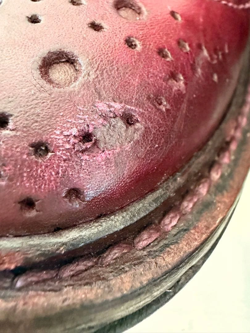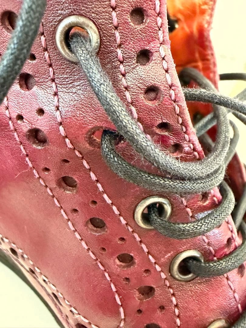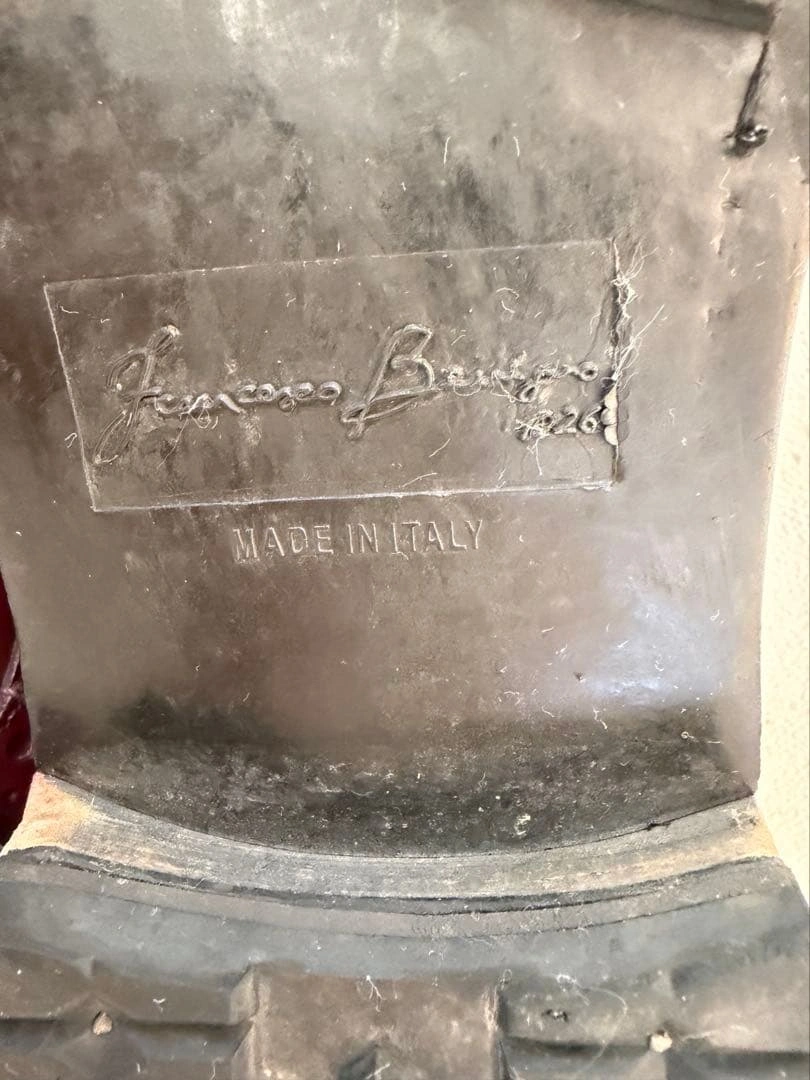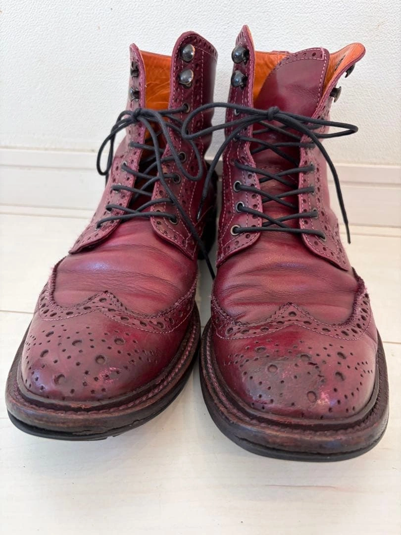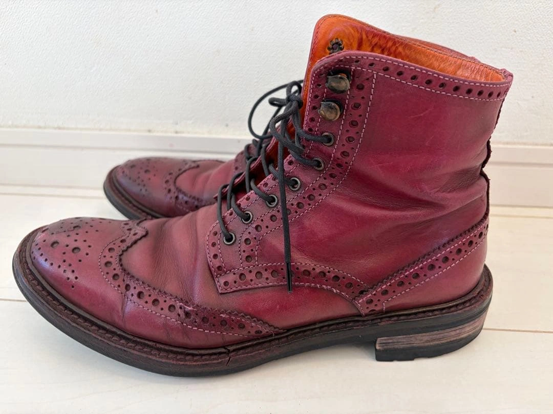 FRANCESCO BENIGNOのウイングチップデザインのレースアップブーツです。表側がワインレッド、裏側がオレンジとカジュアルからきれいめまで幅広いスタイルに合わせやすい一足です。 【カラー】レッドブラウン系 【デザイン】ウイングチップ、レースアップ 【商品の状態】全体的に使用感があり、つま先やかかと部分に擦れや傷が見られます。ソールの減りも若干ありますが、まだまだご着用いただけます。 【製造国】イタリア 【サイズ】表記は見当たりませんが、自身のサイズ26cmでジャストサイズでした 【備考】外箱なし 上記をご理解の上、ご検討をお願いいたします。