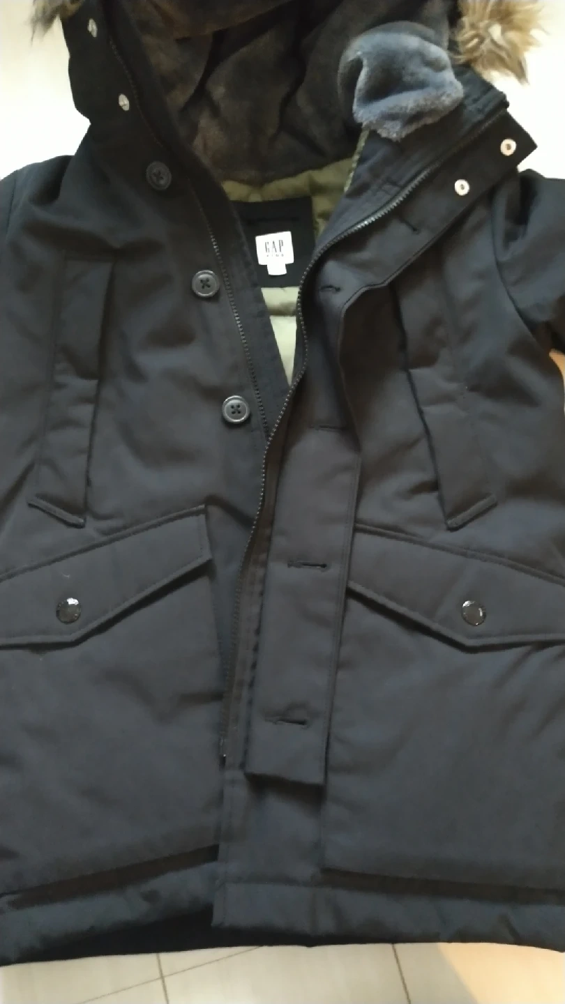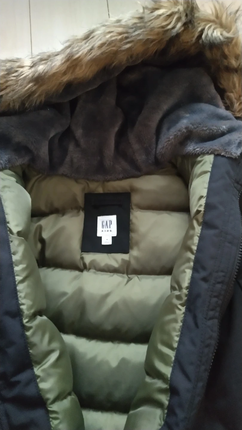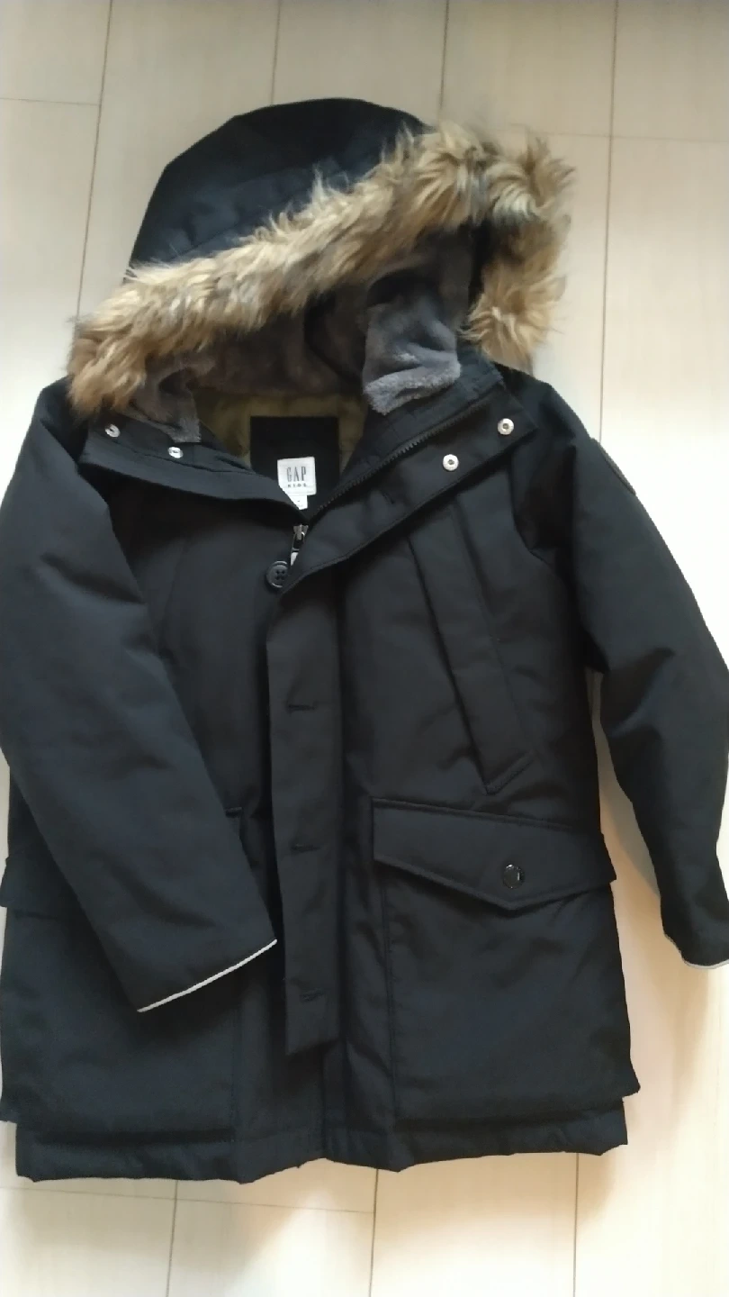ギャップキッズのダウンジャケットです。 寒冷地用に買いましたがほとんど着用せず自宅保管しておりました。 重量のあるしっかりとしたダウンジャケットで、フード部分ももこもこしているのでかなり温かいです。 ボタンとジッパー両方ついているので寒さをブロックします。 左肩部分にロゴあり。 前にポケット4つついてます。 【情報】 ブランド:ギャップ サイズ:M カラー:ブラック(裏地はカーキ) 素材:表地 主ポリエステル、詰め物 75%ダウン25%フェザー フード付き(取り外し不可) 【状態】 使用感少なめ、全体的にきれい 目立った汚れやほつれ、傷はありませんが、中古品であることご了承いただける方、ぜひご検討ください。 他にも子供服を出品しておりますので、まとめ買いご相談ください。