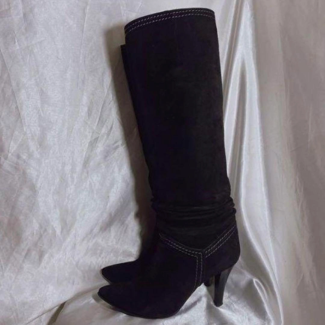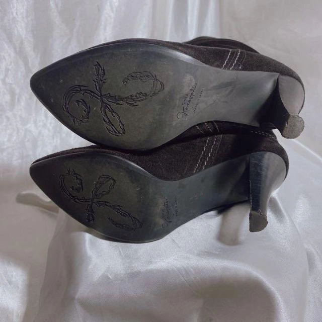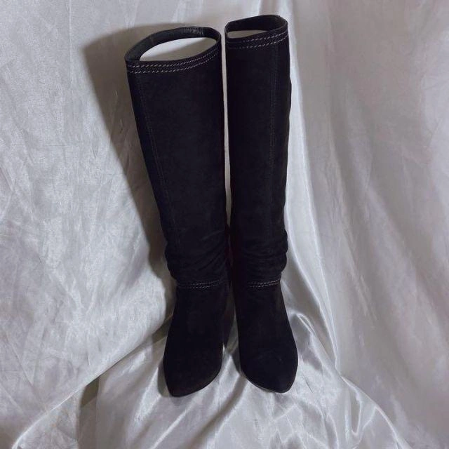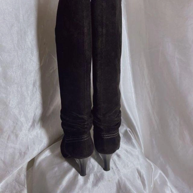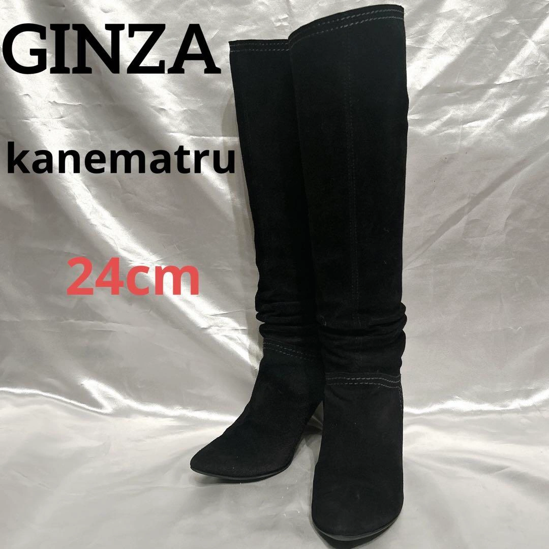 GINZA Kanematruのロングブーツです。 サイズは24cm、ヒール高は8.5cm、ヒール上は39cmです。 ファスナー無しで、靴のように履いて引っ張るタイプです。 ピタッとして足が綺麗に見えます。 カラーはブラック、シューズ丈はロング、ヒール高さは7.1~10cm、ソールヒール形はピンヒール、素材はスエードです。 ご希望の方はお気軽にご連絡ください。