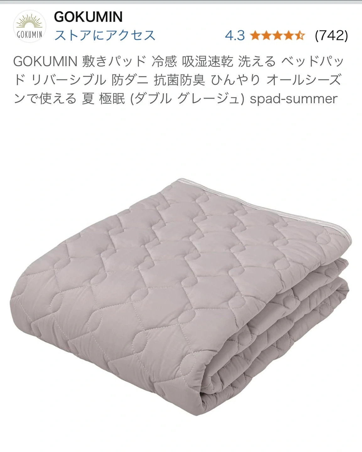GOKUMIN 敷きパッド 冷感 吸湿速乾 洗える ベッドパッド リバーシブル 防ダニ 抗菌防臭 ひんやり オールシーズンで使える 夏 極眠 (ダブル グレージュ) Amazonで新品購入。一年程使いましたが、常にマットレスカバーとシーツの間にはさまれていたため、直接肌に触れた事はなく状態よいです。気に入っていましたが、ダブルベッドを手放したためこちらも手放します。 https://amzn.to/3D4vSjw