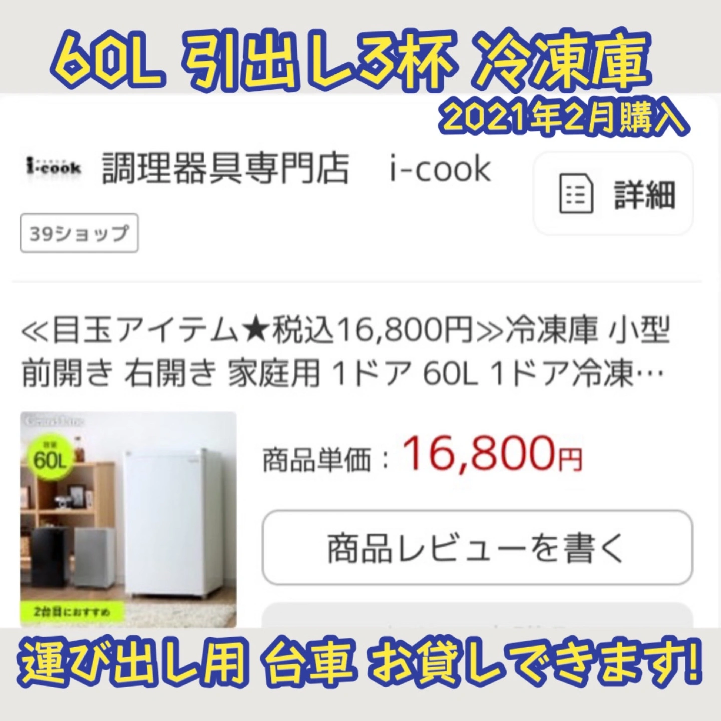 【情報】 ブランド:Grand-Line 型番:AFR-60L01WH 種類:冷凍庫 容量:60L 外形寸法:幅480mm×奥行500mm×高さ840mm 年式:2020年製 【状態】 2021年2月購入 中古品 引出しに小傷あり よ〜〜く冷えます‼︎ 冷凍の宅配おかず・お弁当、 ふるさと納税返礼品のお肉やお魚、 特売だった麺類、アイスクリーム‥ 大丈夫です、ぜんぶ入ります。 セカンド冷凍庫、大正解です! ‥残念ながら疾病の影響で体幹と手指〜腕の筋力が低下して、引出しを開け閉めしにくくなってきてしまい、このたび手放すことにしました。 今もまだメイン冷蔵庫に押し込めていない(苦笑)カップのアイスクリームを冷やしてもらっています。 お受け渡し前日迄に電源を切り、ザッとお手入れしますので、 お日にちに余裕をもってご連絡いただけましたら助かります。 ※お近くで、出来るだけ冷えヒエ状態のままがいいのだ、すぐに使いたい等のご事情がおありでしたらお伝えくださいませ。 ★搬出用 台車 お貸しできます★ (デポジット料 ¥5000 お預かりします) お近くの方、必ずご返却いただける方に限り、「台車」お貸しできます。 拙宅玄関先から台車に乗せて、エレベータを使い、任意の場所まで冷凍庫を運んだあと、 台車を返却しにいらしていただけたら デポジット料 ¥5000はお返しします。 ーーーーー ○他にも生活用品を多数出品予定です。ぜひご一緒にご検討くださいませ。 ーーーーー ※7/15迄にお譲り先が決まらなければ、全て処分いたします 7/7(月)全日・7/8(火)〜夕方迄を除いて いちばん早く来ていただける方 ○喫煙者は居りません ○洗濯洗剤 : 無香料 (ハイブリッドJOE、無印良品おしゃれ着用洗剤、過炭酸ナトリウム等のアルカリ剤) ○柔軟剤 : なし ※水に溶いたクエン酸 ○香り付けビーズ類 : なし ○消臭スプレー : なし 化学物質過敏症です 流入VOCの還元のため、業務用オゾン発生器(10,000ppm/時)を使用しています 疾病・障害のため、 駅改札内外を跨ぐ受け渡しや、屋外の指定場所へ出向くことは不可能です (荷物を持った状態では、電動車椅子で移動できません)。 拙宅の玄関先※へ受け取りにいらしてくださいませ。 ※お取引に合意後、当方がメッセージからお送りするGoogleマップリンクの場所です ※キャロットで表示される地図は正確な場所ではありません どうかよろしくお願いいたします。