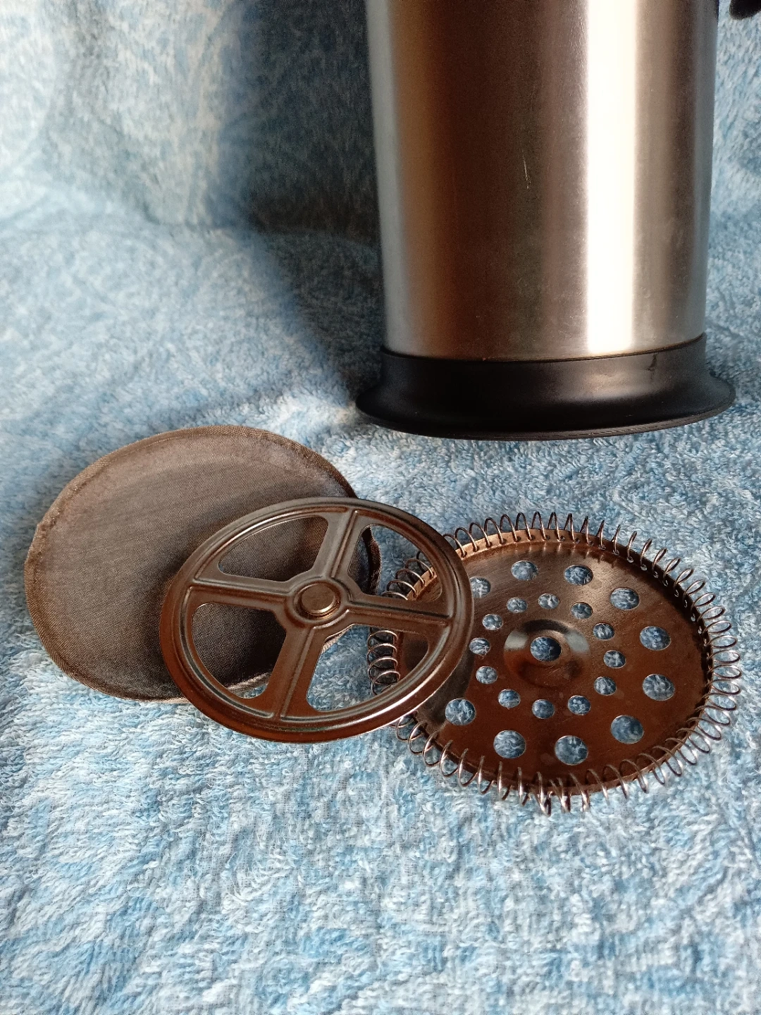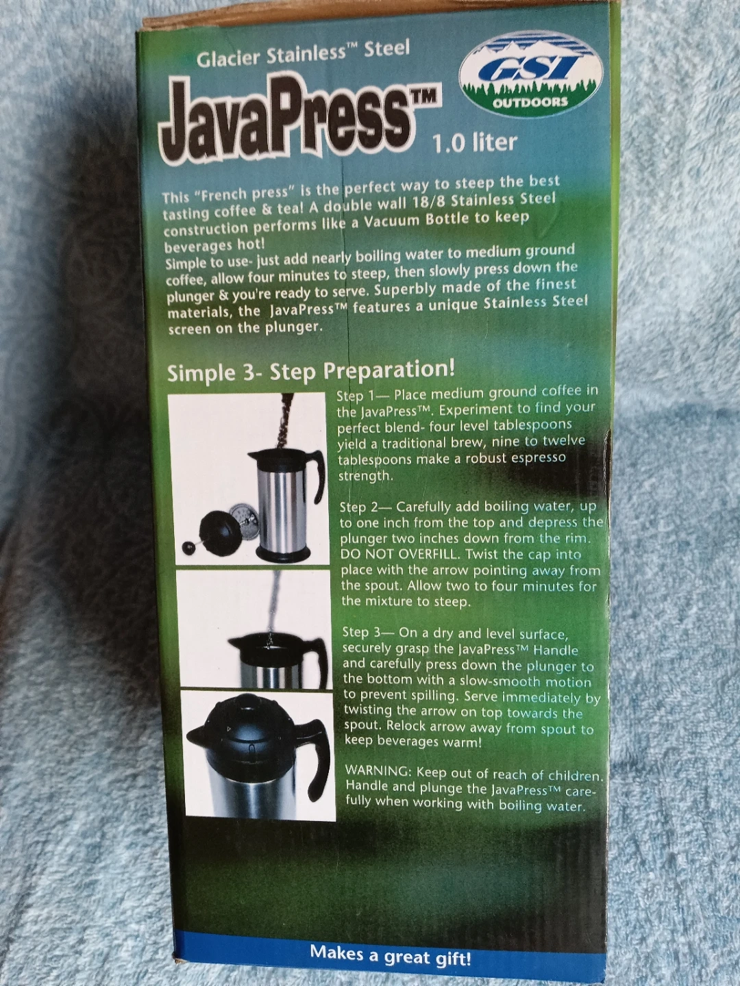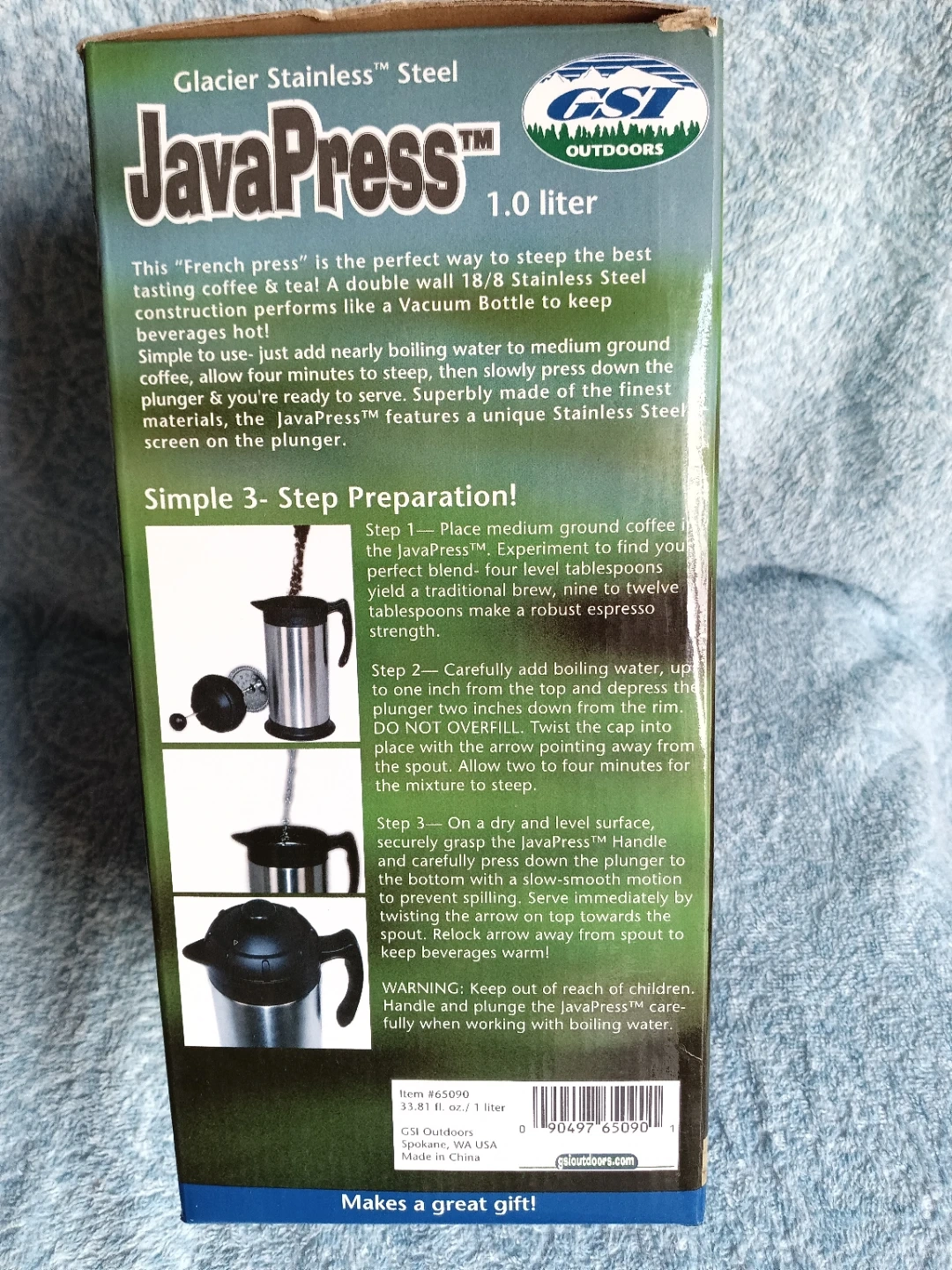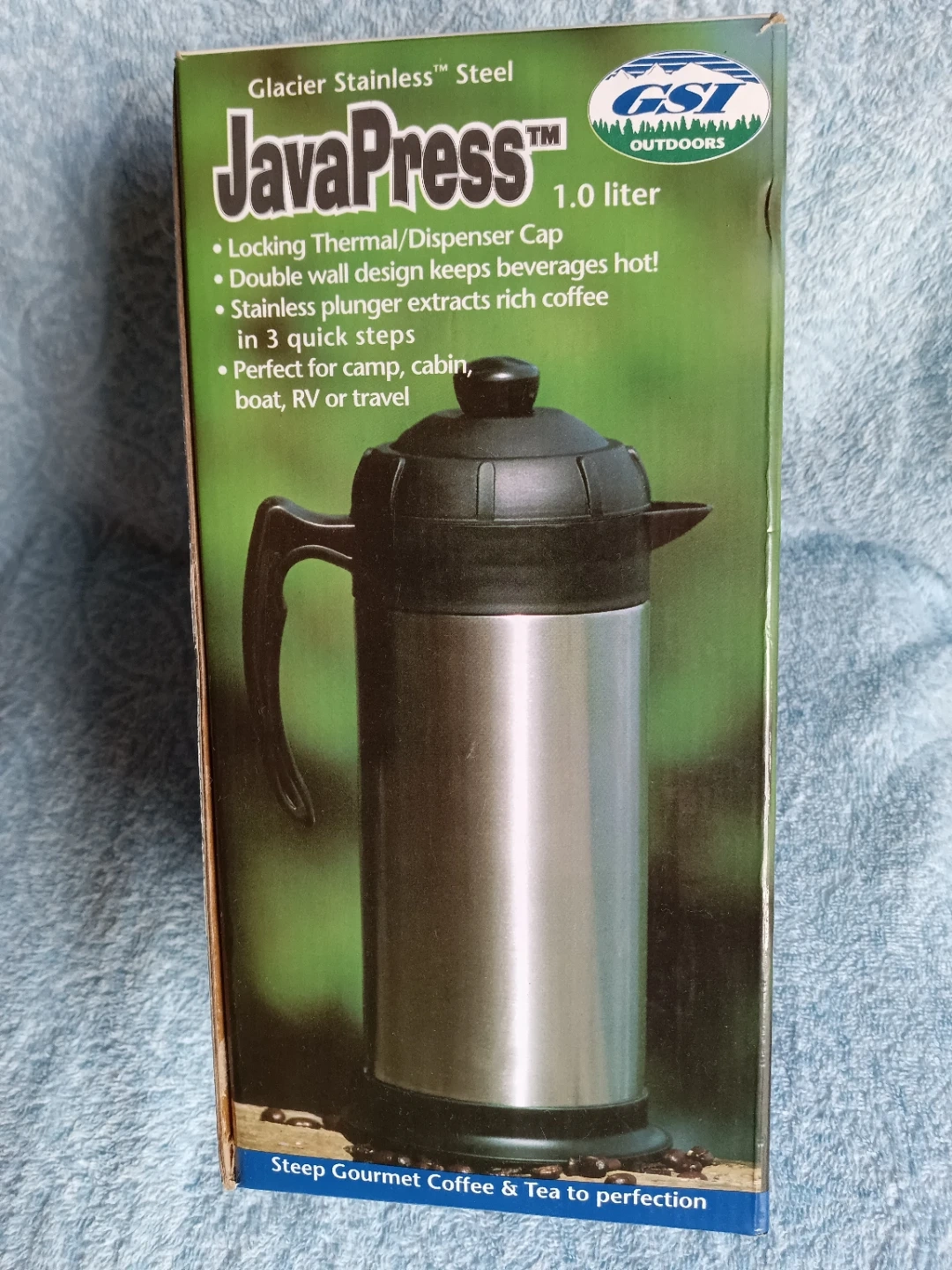 ※同時購入の方に差し上げます。 GSIアウトドアのJavaPressです。 こちらのサイトでお譲り頂きました。 1リットルと容量が大きいので、夏場にアイスコーヒーを作り置きするのに重宝でした。 別の物を使うようになりましたのでお譲りします。 ステンレスとの繋ぎ目からコーヒーがわずかに染み出ることがございます。 ・ブランド:GSIアウトドア ・容量:1.0L ・Glacier Stainless Steel ・キャンプ、キャビン、ボート、RV旅行などに最適 ・3ステップでステンレス製プランジャーがリッチなコーヒーを抽出 ・ダブルウォールデザインで飲み物を保温 ・ロッキングサーマル/ディスペンサーキャップ ・箱、説明書付き 中古品であることご了承ください。