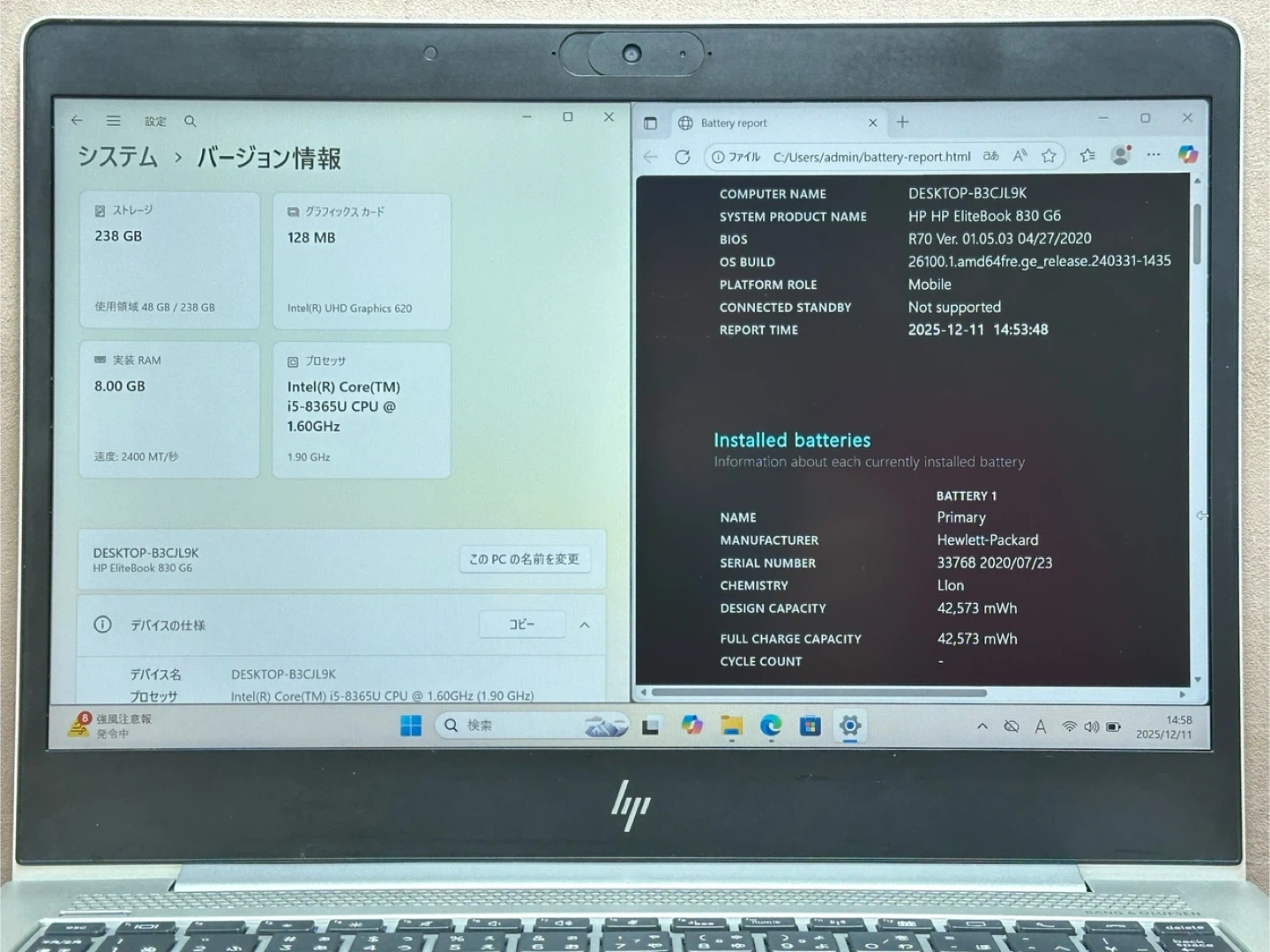 HP EliteBook 830 G6 のノートパソコンです。 【情報】 ブランド:HP モデル:EliteBook 830 G6 CPU:Core i5 8365U RAM:8GB SSD:256GB 画面サイズ:13型 (1920x1080) OS:Windows 11 【状態】 ランク:B 使用感はありますが、全体的にきれいです。 【その他】 保証期間:2週間 中古品であることをご了承ください。
