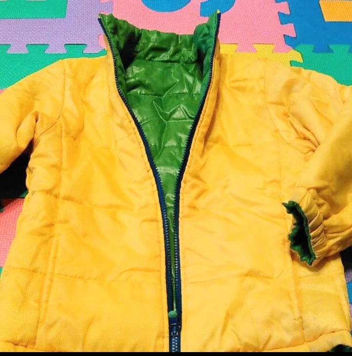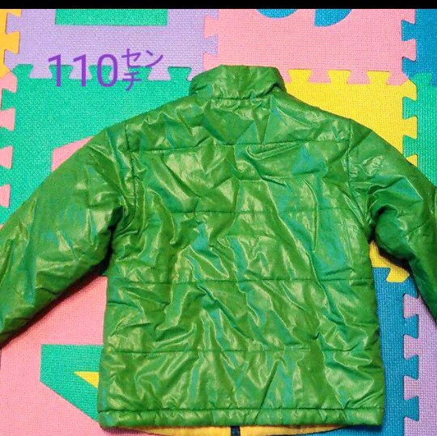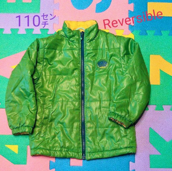 あたたかさ〓HusHush〓 リバーシブルで着用できる中綿ジャケットです。 グリーンとイエローの組み合わせで、元気いっぱいのデザインです。 サイズは110cm (身長105~115㌢、胸 囲53~59㌢、胴囲47~53㌢、腰囲58~66㌢) 着用に伴う多少の使用感と、袖口に若干の黒ずみが見られますが、まだまだご着用いただけます。 (よく洗えば落ちると思います) 本体は、表地・裏地:ポリエステル100%。 詰物:ポリエステル100%。 【サイズ】110cm 【カラー】グリーン、イエロー 【素材】ポリエステル キズは、ありません! 内側タグに名前明記あったので、消したあとあり。