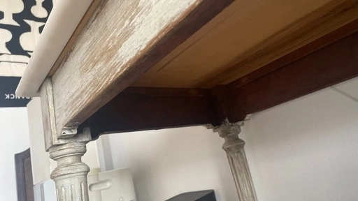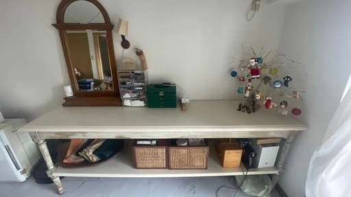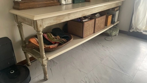ベイクルーズが運営しているセカンドハンドの店舗で購入したシェルフ、コンソールテーブル、またはキャビネットです。 ベイクルーズの建築部門がIENA渋谷店の店舗什器用に作ったものとのことです。ヴィンテージの木の土台に、最高級人工大理石のコーリアンを天板として組み合わせたオリジナル什器です。 我が家ではテーブルの高さとちょうど合うため、テーブルの横にキャビネット的に使っていました。 購入時から下段中央に向かってややたるみがでていますが、使用に支障はでていません。下段裏側に釘が出ていますが、これも購入当時からのものです。 w2210 d550 h795 人工大理石を使っているためかなり重量があります。大人の男性2人は必須で、それでもきついかもしれません。 引っ越しに伴い手放します。 11/23(日)に現場で受け取れる方を優先します。 ※マンション1階までは出しておきます。 素材的にもかなり破格だと思います。 ※ベイクルーズの方も当時予算度外視で作ってしまったと仰っていました。 よろしくお願い申し上げます。 IKEA 無印良品 ボーコンセント アクタス ACTUS Boconcept 大塚家具 関家具 フランフラン サンゲツ