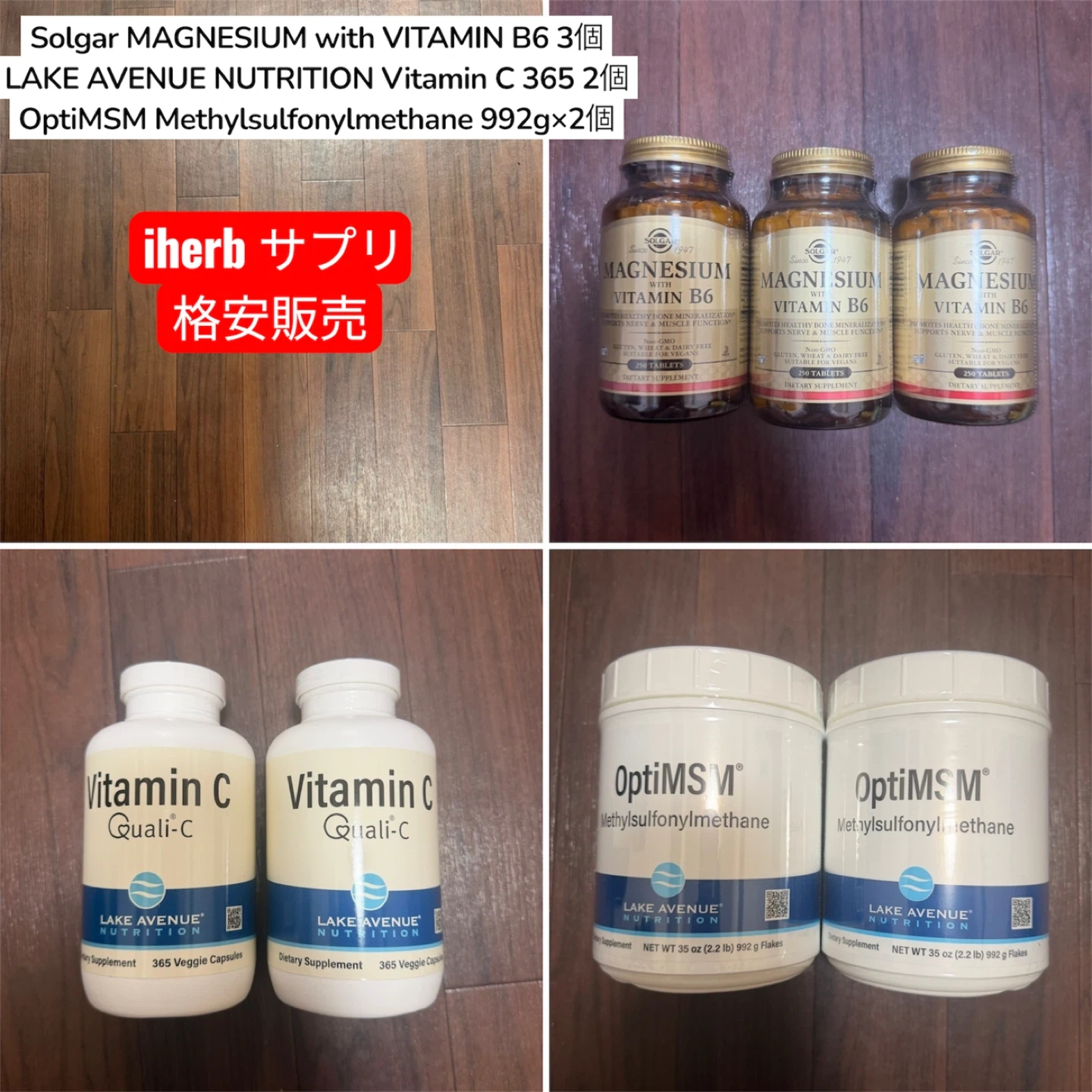 サプリメ ントのセットです。 ・SOLGAR MAGNESIUM with VITAMIN B6 3個 ・LAKE AVENUE NUTRITION Vitamin C 365 2個 ・OptiMSM Methylsulfonylmethane 992g 2個 1) ソルガー マグネシウム ビタミンB6 250タブレット 3個セット 賞味期限:04/2027 2) レイクアベニューニュートリション Vitamin C 365カプセルx2個セット 使用期限:12/2026 3) レイクアベニューニュートリション OptiMSM 992g x 2個セット 使用期限:05/2027 ご不明点があればお気軽にお尋ねください。