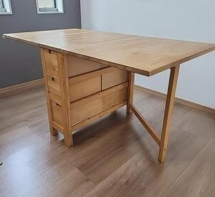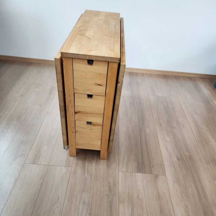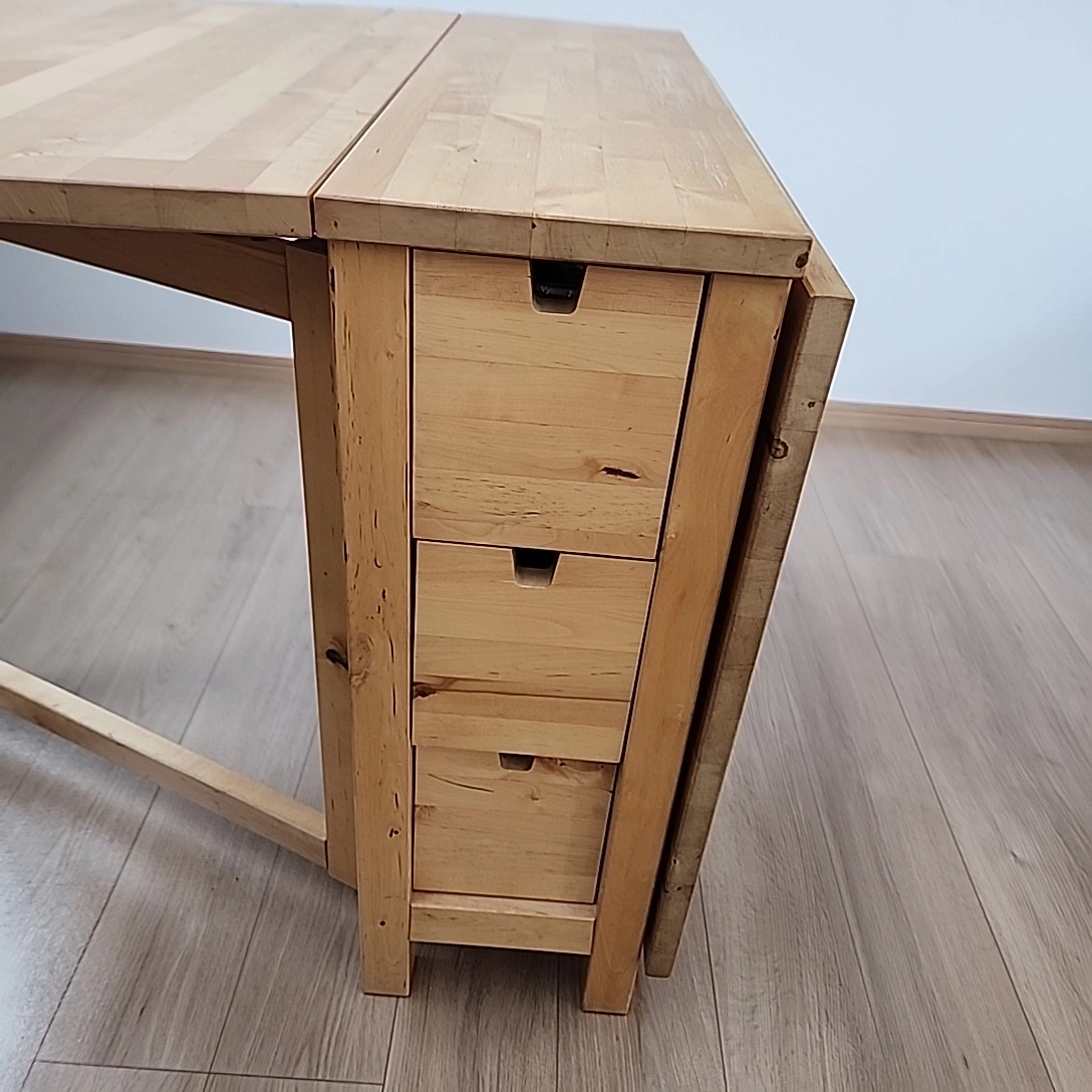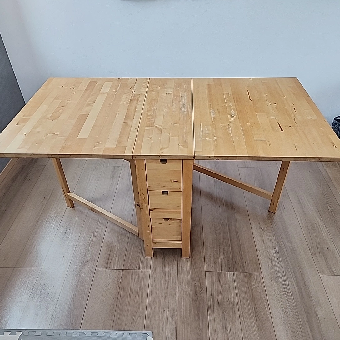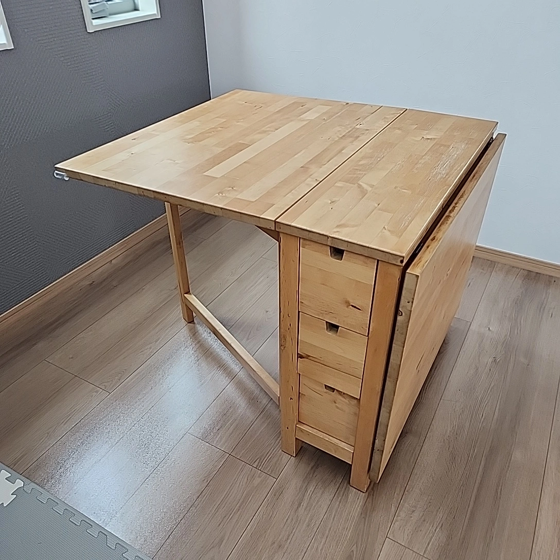 IKEA ゲートレッグテーブル 折りたためるダイニングテーブル 6個の収納引き出しが便利です サイズ ・長さ: 89 cm←片方を畳んだ時 ・長さ(最小): 26 cm←両方畳んだ時 ・長さ(最大): 152 cm ・幅: 80 cm ・高さ: 74 cm 4年程使用してます。 ✳テーブル角にぶつけ防止のコーナーガードが付いてます(両面テープで付いてるので剥がれます) 5日土曜日までに取りに来ていただける方 その他質問等あれば気軽にメッセージ下さいませ。 宜しくお願いします!