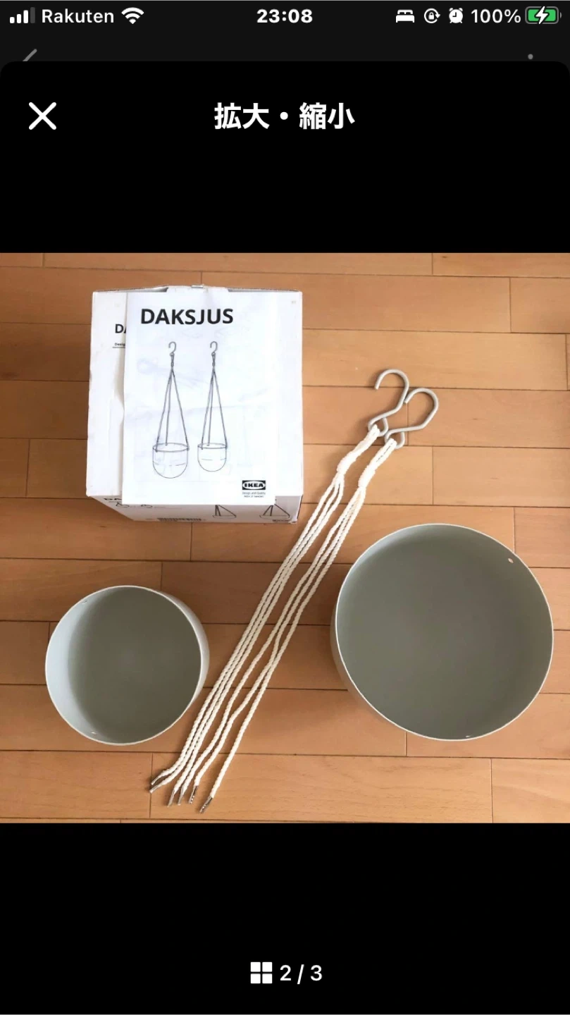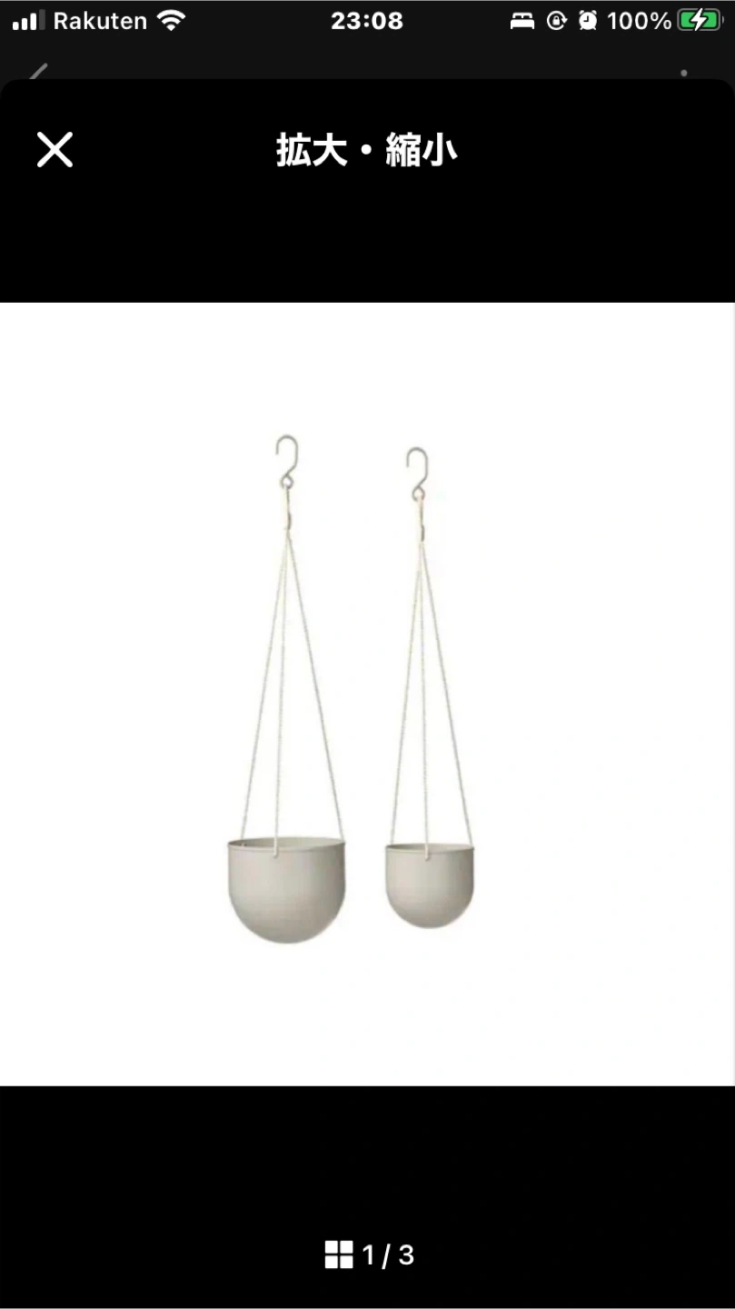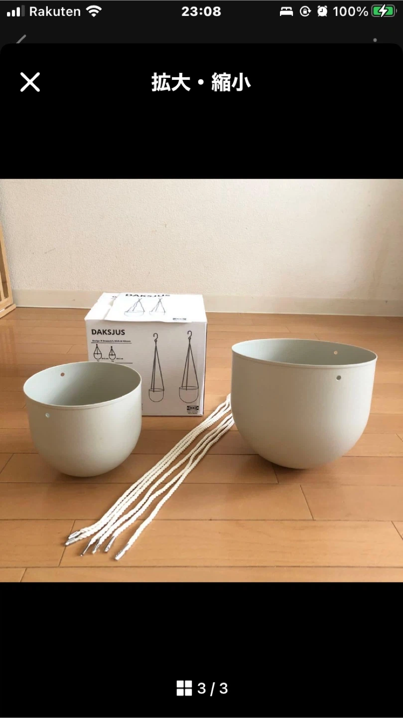 吊り下げ式のグレージュのプランター2個セット - タイプ: 吊り下げ式プランター - サイズ: 大・小の2個セット - カラー: グレージュ - 付属品: 吊り下げ用ロープ、説明書 ご覧いただきありがとうございます。 IKEA イケア DAKSJUS/ダクシュース ハンギングプランター2個セット 開封後、小サイズを一度組み立てて植物を入れてみましたがイメージと違ったためすぐ片付けました。 自宅保管品のため気になる方はご遠慮ください。