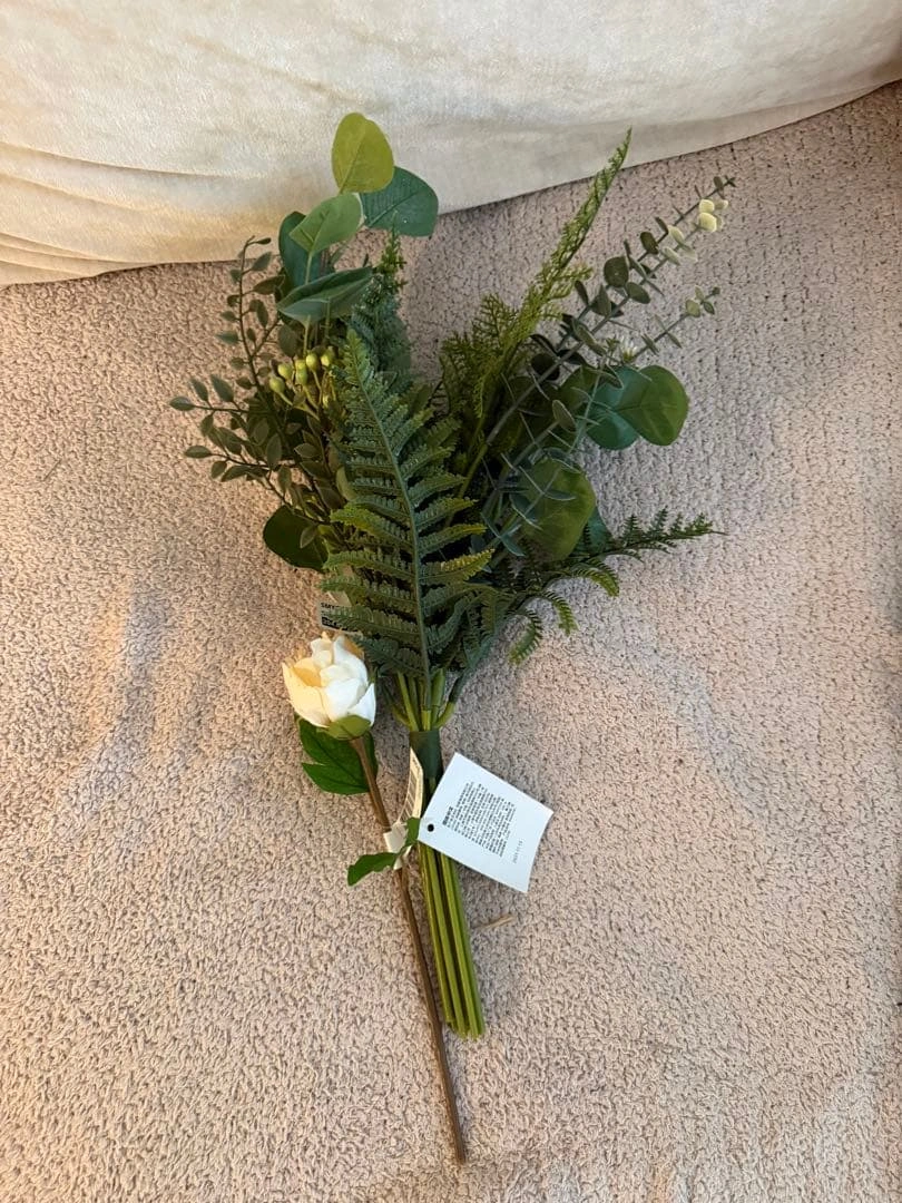 白いバラと多様な緑葉を組み合わせたナチュラルなアレンジメントです。 - 主な花の種類: 白いバラ - 葉の種類: ユーカリ、シダ、その他の緑葉 - スタイル: ナチュラルアレンジメント - タグ: 付属のタグあり ご覧いただきありがとうございます。 ご希望の方はお気軽にご連絡ください。