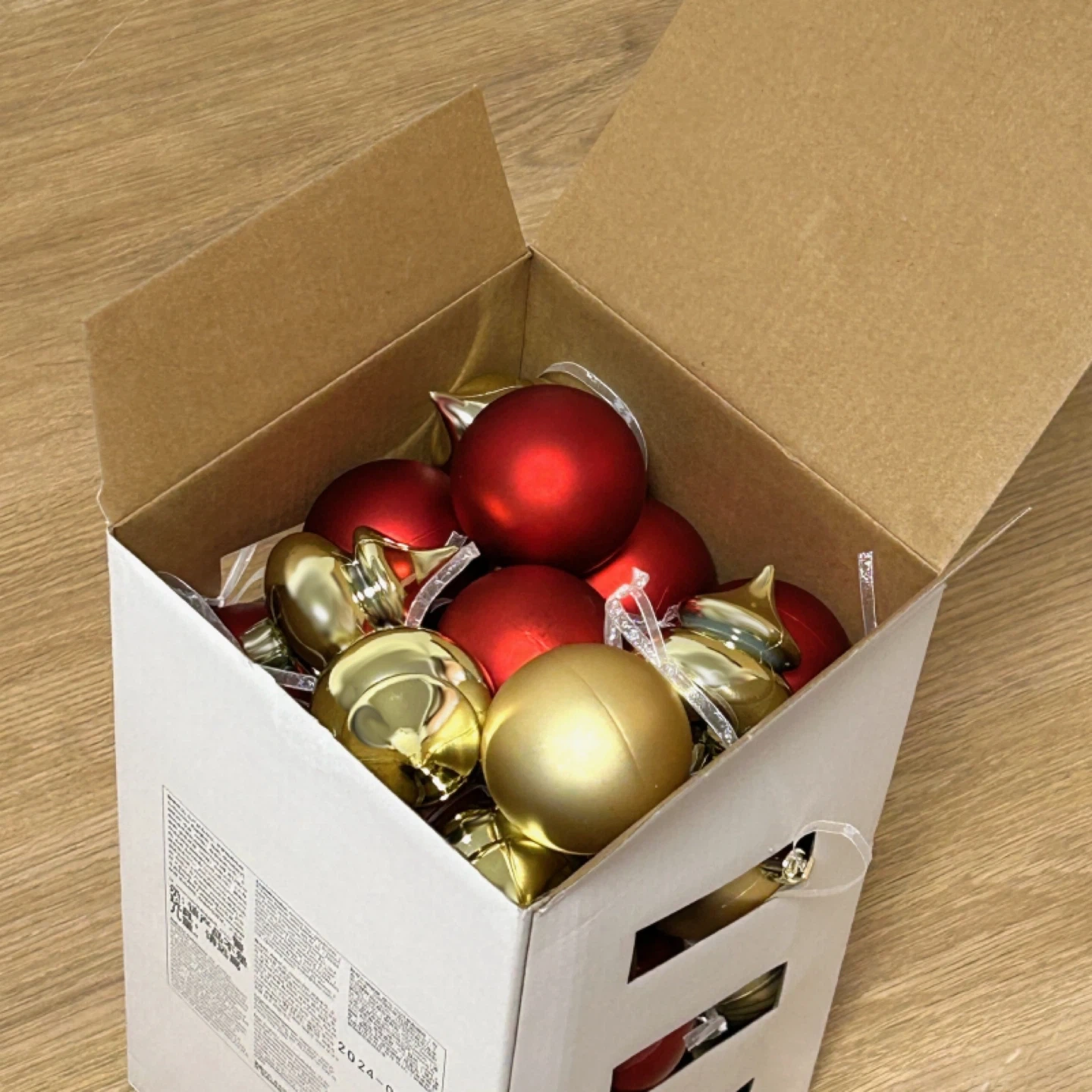 箱入りのオーナメント32個セットです 好みが分かれますが、個人的には1.2mくらいのクリスマスツリーにちょうどいい量だと思います。 カラーはゴールドとレッドだけですが、色々なデザインがあるので変化があってかわいいです。 1シーズン(短期間)飾りました。 紐は付けてありますが、一部リボンでなくワイヤーがついています 同じものをもう一つ出品しています。 2箱同時にお買い上げいただける場合、1箱400円(2箱合計800円)にお値下げします。 コメントからお申し込みください。 【セット内容】 ボールオーナメント(直径6cm)10個 溝付きボールオーナメント(直径6cm)5個 ボールオーナメント(直径5cm)12個 松ボックリ形ボールオーナメント(直径4.6cm)5個