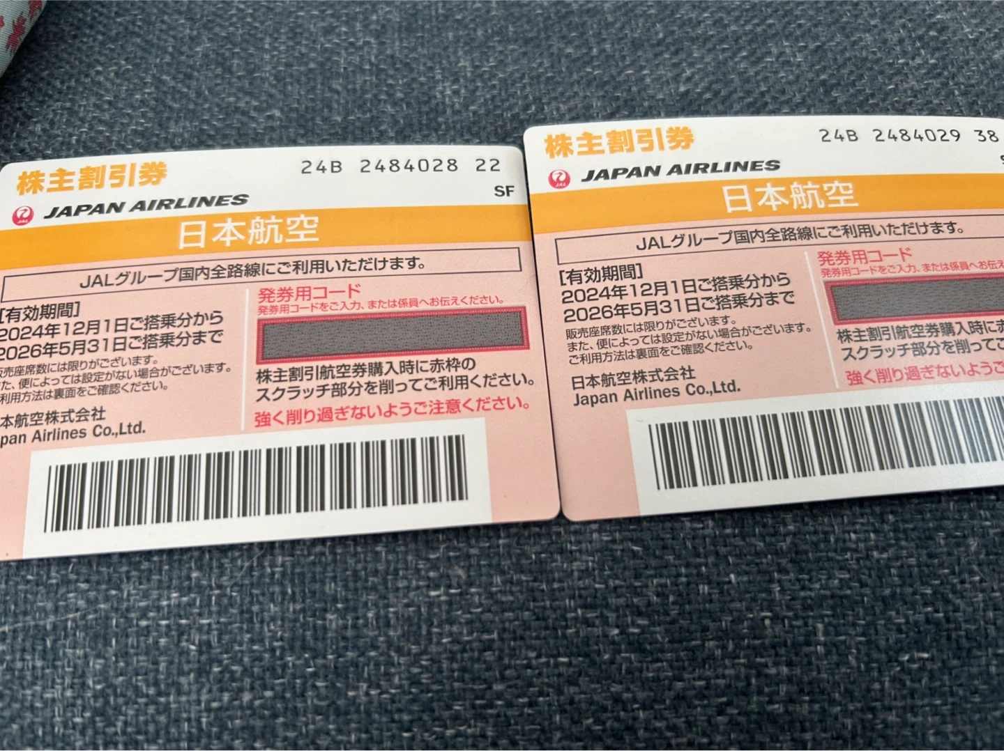JAL(日本航空)の株主割引券2枚セットです。 【情報】 航空会社:JAL (日本航空) 有効期間:2024年12月1日~2026年5月31日 株主割引航空券購入時に赤枠のスクラッチ部分を削ってご利用ください。 強く削り過ぎないようご注意ください。 ご不明点があればお気軽にお尋ねください。