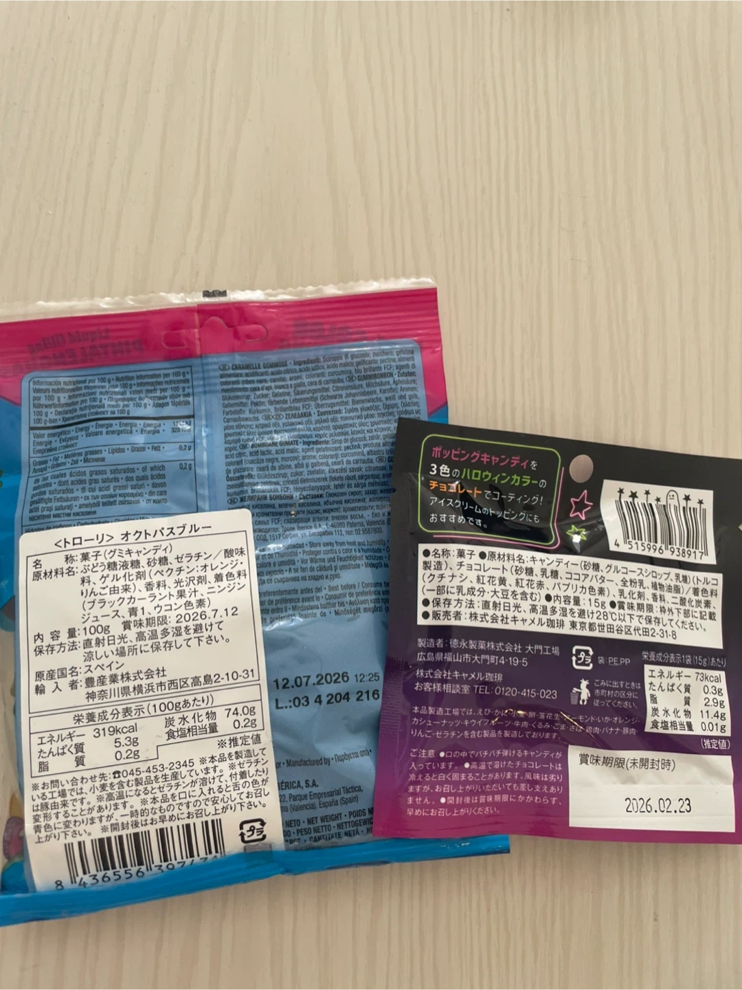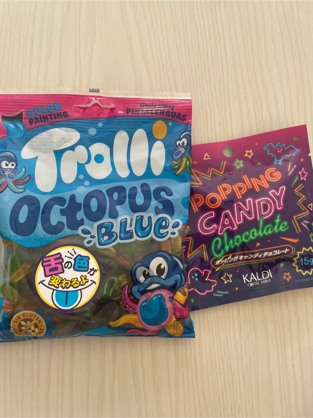 カルディで購入しました。 舌の色が変わるグミとポッピンキャンディです。 息子の好みではなかったようで、残念ながら余ってしまいました。 新品未開封です。 、トローリのオクトパスブルーとカルディのポッピングキャンディチョコレートです。 ・ブランド:トローリ、KALDI ・商品:グミ、チョコレート ・賞味期限:2026.07.12 (トローリ), 2026.02.23 (KALDI)