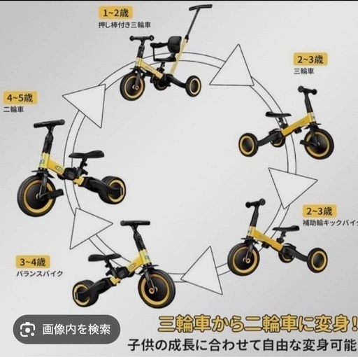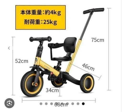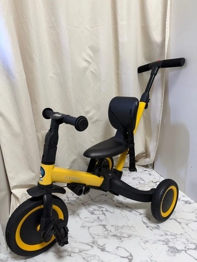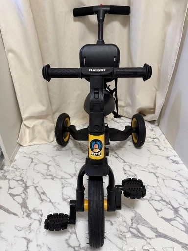 1台で年齢に合わせて5パターンの変形が可能な、1歳~5歳まで長く使用可能な三輪車です。 変形も容易でコンパクトかつ軽量、シートベルト付きで安全面にも配慮されています。 ◎商品名等 Knight NIJAKISE子供用三輪車/二輪車 5in1 対象年齢:1才〜5才 ◎特徴 1台で5パターンへ変形可能 ①1歳〜2歳 押し棒付き三輪車(画像1枚目) ②2歳〜3歳 三輪車(画像2枚目) ③2歳〜3歳 補助輪キックバイク(画像3枚目) ④ 3歳〜4歳 バランスバイク(画像4枚目) ⑤ 4歳〜5歳 二輪車(画像5枚目) 《商品の状態》 使用頻度がかなり低いため、特に目立った傷や汚れはないかと思いますが、中古品であることにご了承いただける方のみご検討をお願いします。