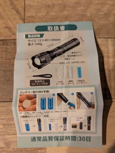 【商品説明】強力LEDライト 点灯パターンは5段階 ・強ライト ・中ライト ・弱ライト ・高速点滅 ・低速点滅 ズーム機能あり 強ライト状態で500ルーメン以上 充電式の専用電池付属 充電式電池が切れた時には、付属の単4電池のアダプタを使用することにより使用可能(単4電池3本) 災害時はもとより、キャンプなどのアウトドアにも活用できます。 ※動作確認のため開封済※ 強力LEDライト アウトドア キャンプ 釣り 災害 防災 非常 【お取引場所】 JR大森駅またはJR蒲田駅 (平日夜はJR品川駅でも対応可)