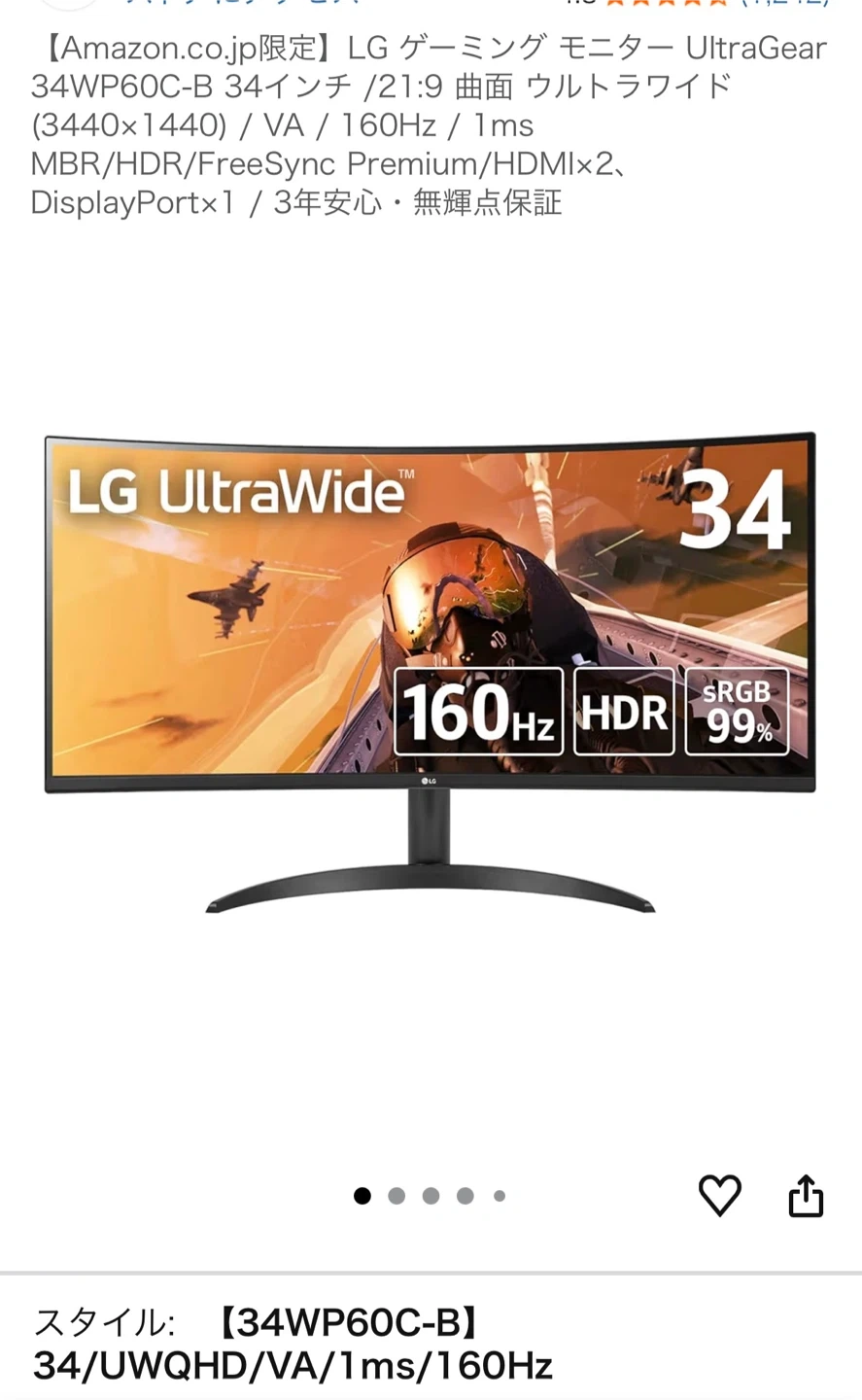 LG ウルトラワイドモニターを出品いたします。 【商品情報】 ・メーカー:LG ・型番:34WP60C-B ・サイズ:34イ ンチ ・解像度:3440×1440(21:9 ウルトラワイド) ・パネル:VA / 曲面 ・リフレッシュレート:最大160Hz ・応答速度:1ms MBR ・対応機能:HDR、FreeSync Premium ・端子:HDMI×2、DisplayPort×1 160Hz対応のため、ゲーム用途でも非常に滑らかにお楽しみいただけます。 作業用や動画視聴にもおすすめのウルトラワイドモニターです。 また、ご希望があれば ASUS製モニターをおまけとして無料でお渡し可能です。 ※中古品のため、使用に伴う小さな傷や使用感がある場合がございます。 ※動作確認済みです。 ※中古品につき、返品・クレームはご遠慮ください。 ご不明点がありましたら、お気軽にご質問ください。