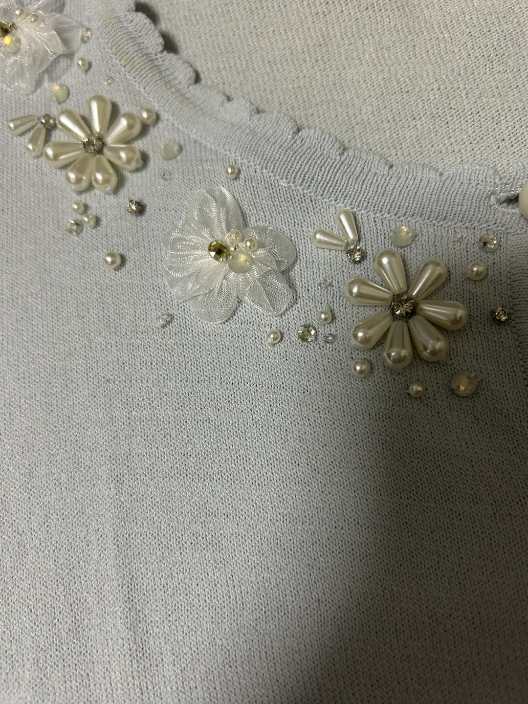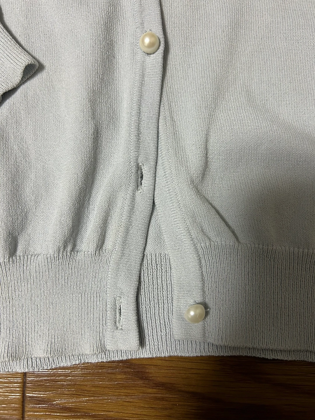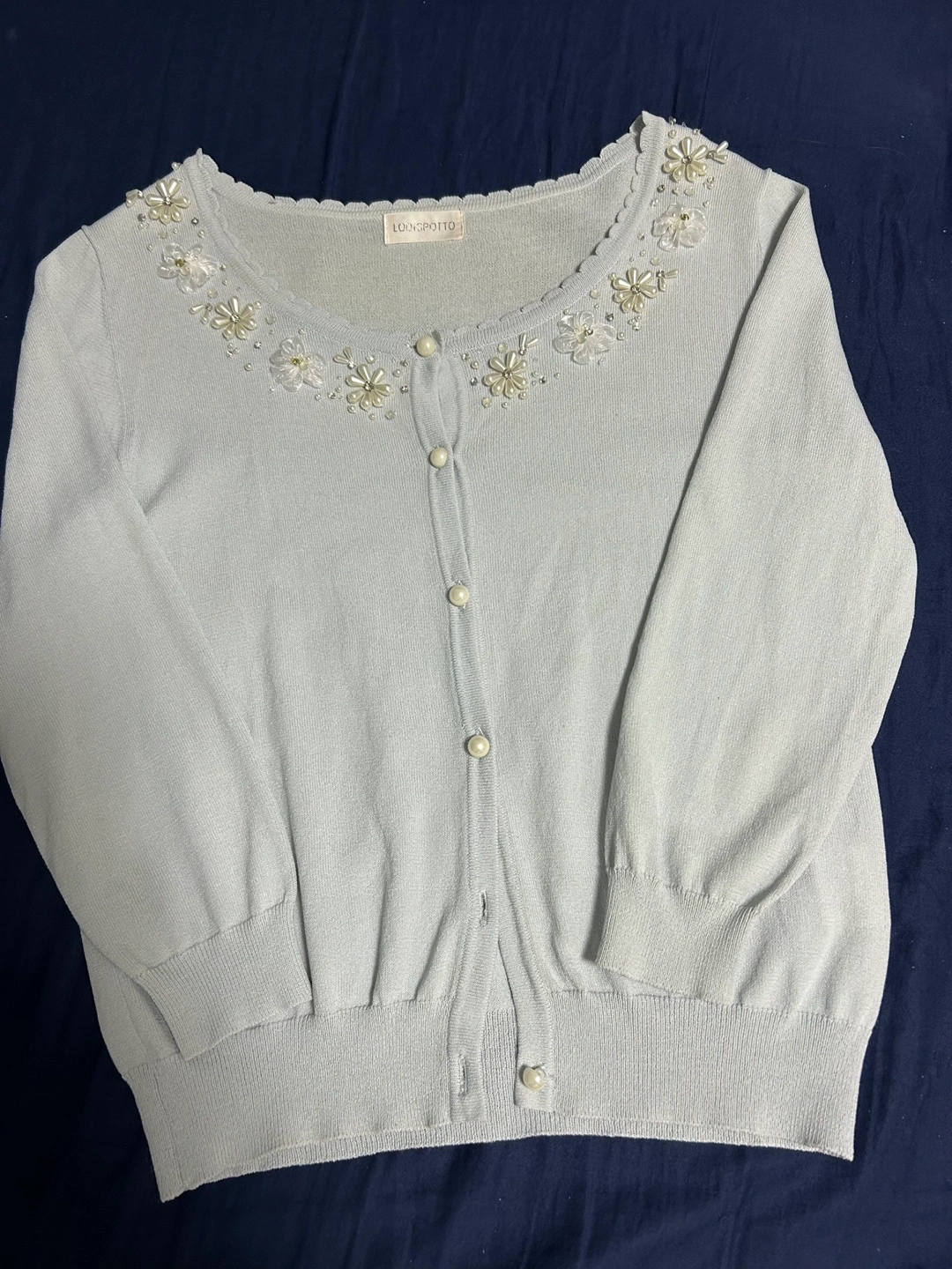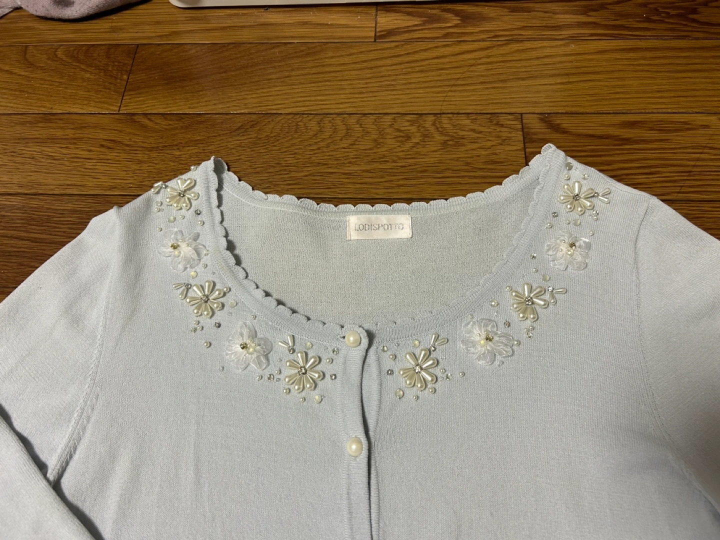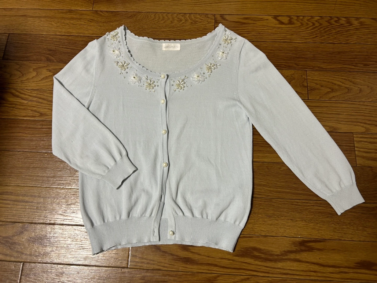 薄い水色になります 身幅 約39センチくらい 着丈 約46センチくらい 多少の誤差はお許しくださいm(__)m とても上品なカーディガンなのですが 画像の4.5.6.7をご覧いただければわかるように 内側の首の後ろあたりの黄色シミ(着ればわかりません) 小さなパールが取れています(目立たないと思います) 下から2番目ボタン取れ(1番下のを付け替えると良いかと、、、) ほつれ 見落としあれば すみません こちらは結構お値段したので、しかも胸元のパールやお花がとても可愛く どなたか着て下さったらと思い出品致しました 中古品です 見落とし含め全てご了承くださる方のみご購入ください その為に安価設定にしております よろしくお願い申し上げます