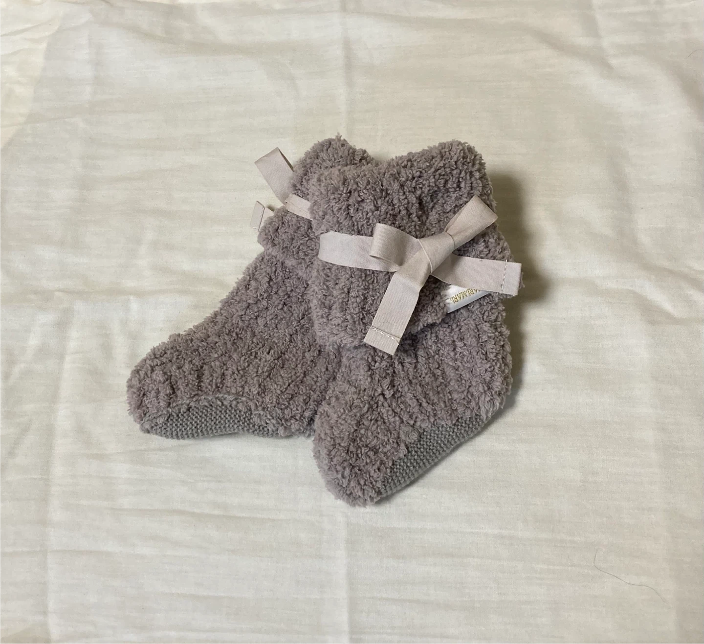 マールマールのブーティです。 まだ靴を履かない月齢の子の外出時の防寒に。 靴下よりも靴感があって、かなりかわいいです💕 フワ フワの気持ち良い肌触りで、私もお気に入りだったのですが、娘はすぐに脱いでしまい… ベビーカーでのお散歩時に1度だけしか使用してません(涙) ・色:チャコール ・サイズ:10~12cm ・素材:(本体)ポリエステル100%(付属テープ)綿100% ・推奨年齢:生後すぐ〜1歳半