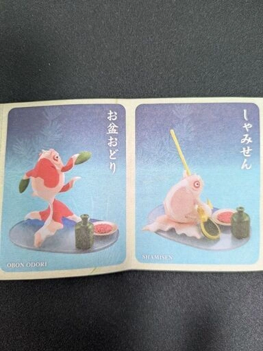 【miniQ】歌川国芳の金魚づくし『酒のざしき』 【商品説明】 歌えや踊れ、金魚たちの宴は終わらない。 歌川国芳が遺した多数の作品には戯画の範疇に入るものもあります。 中でも金魚や蛙、亀たちが描かれた『金魚づくし』は国芳が得意とした擬人化の手法が存分に活かされた逸品。 その中から酒宴にふける金魚と蛙を描いた『酒のざしき』をフィギュア化しました。4種揃えて楽しげな金魚たちの宴を再現してください。 ■ラインナップ 全4種のうち2種 1. お盆おどり 水草の葉をお盆の代わり持って踊る舞妓を金魚に見立てた姿を立体化。 2. しゃみせん 掬い網を三味線代わりに演奏する芸者を金魚に見立てた姿を立体で表現。 【参考URL】 https://www.kyd-store.jp/c/genre/miniq_g_d/mqn029b 【お取引場所】 JR大森駅またはJR蒲田駅 (平日夜はJR品川駅でも対応可)