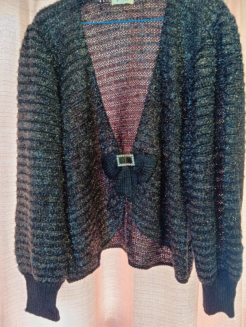 ブラックのニットカーディガンです。装飾的なバックルが付いています。 - ブランド: MISUAL - 色: ブラックラメ風 - デザイン: Vネック、前面に装飾的なバックル - 素材: 編み込みのニット - サイズ: L - 装飾: ストーン付きのバックル レーヨン50%、ナイロン50%です。品質は良好です。 クリーニング済みです。 ご希望の方はお気軽にご連絡ください。