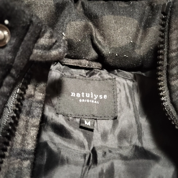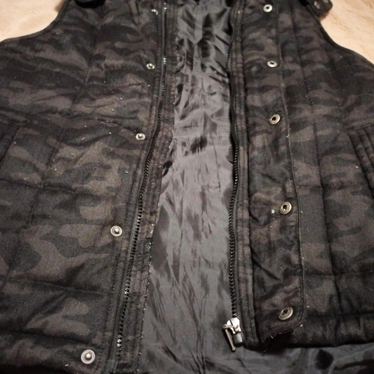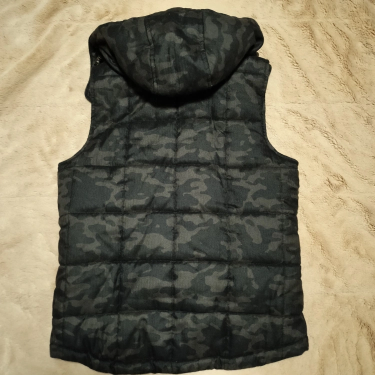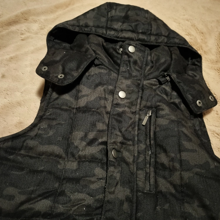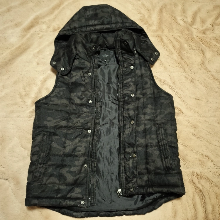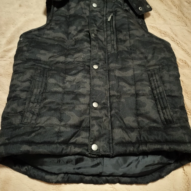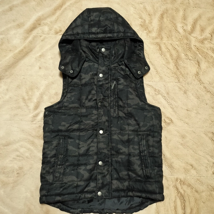 黒の迷彩柄の中綿入りダウンベスト、フード付きで便利なジッパーポケット付き。 Natulyse 中綿ベスト ダウンベスト ダークグレー系 迷彩 カモフラージュ柄 メンズM フード取り外し可能 ところどころ毛玉はありますが、まだまだ着て頂けます。 - Color: Black camouflage - Material: Padded fabric - Features: Hood, Zipper pocket, Snap buttons カジュアル 古着 ヴィンテージ ご覧いただきありがとうございます。