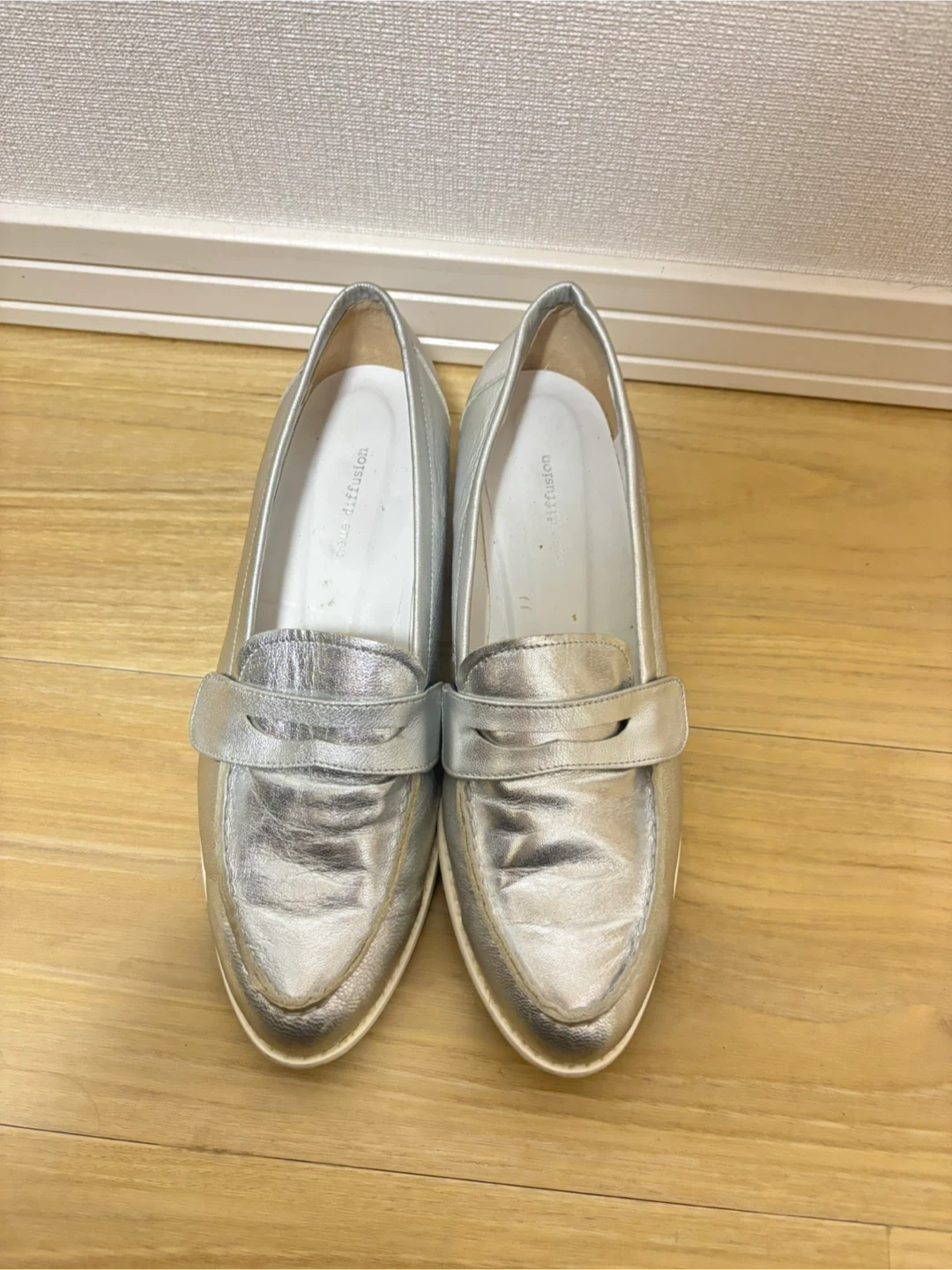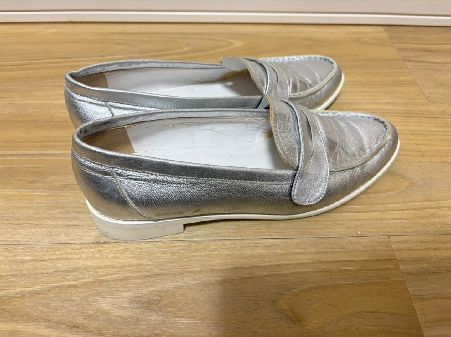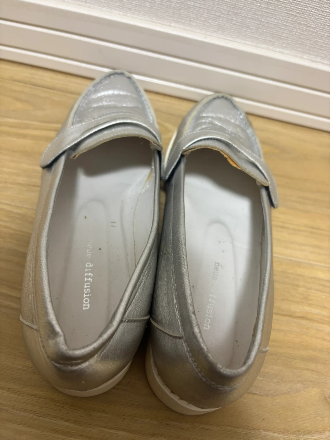 ノイエディフュージョンのシルバーのローファーです。 柔らかいので足に優しく感じました 現在靴下変え、少し大きく感じるため出品 ・スカート、パンツどちらにも合うデザイン ・カラー:シルバー ・サイズ:23cm ・ブランド:ヌーディフュージョン ・日本製 ・天然皮使用で柔らかい ・購入時15000円位、しばらく自宅保管 ・内側少し使用感ありますが、まだ見た目綺麗なので気にならない方に