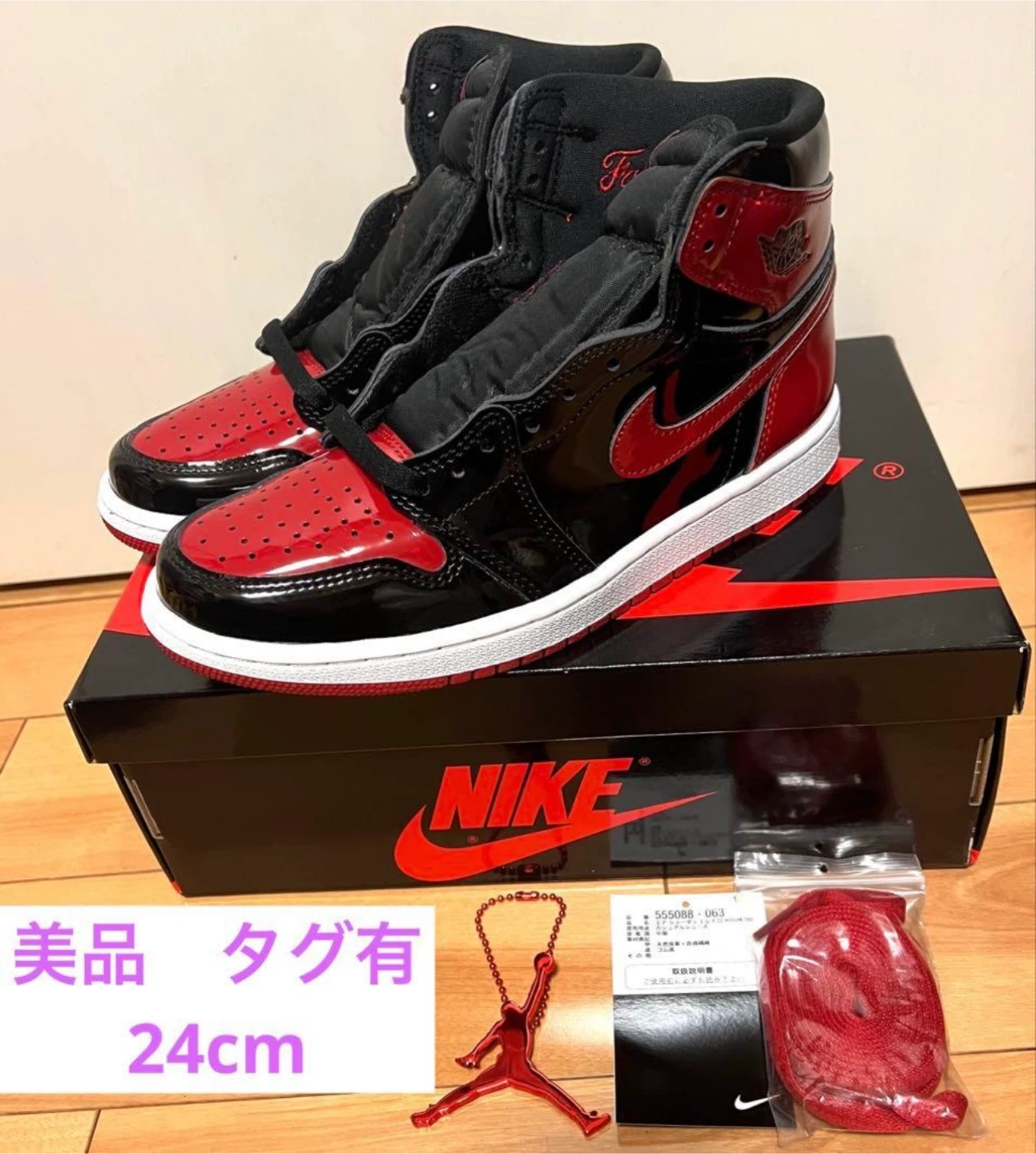 Nike Air Jordan 1 High OG "Patent Bred"ナイキ エアジョーダン1 ハイ OG "パテント ブレッド"    サイズ 24cm ドレコで1度のみ一瞬履いただけの美品です。 爪先のシワもないです。 付属全て有ります すり替え防止の為、購入後の返品等はお受け出来ませんのでご了承下さい。 引っ越しのため、断捨離となります。 コレクションしてたので、乾燥剤とか入れてとても状態良く保管しておりました。 他のサイトでも出品してますので、無くなり次第削除致します。予めご了承くださいませ。 【情報】 ブランド:ナイキ 商品名:エアジョーダン1 レトロ HIGH OG サイズ:24cm 型番:555088 063 色:ブラック/レッド/ホワイト 【状態】 使用感は少なめ、全体的にきれい 【付属品】 箱、替え紐、キーホルダー、タグ 中古品であることご了承ください。