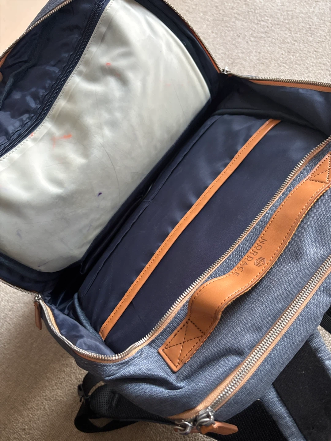 Nordace Siena リュック ビジネスリュック メンズ レディース 大容量 旅行 通勤 通学 学生 軽量 バックパック USB充電 ノルディス クラシック ND1001 【製品の特徴】 ●リュックを担いだままでもUSB充電が可能な最新モデル。 ●空っぽでも荷物一杯でもリュックの形が崩れません。 ●Nordace Sienaには隠しポケットがたくさん。盗難の心配がありません。 ●USB充電ポート付きで充電切れの心配なく散歩や旅行を楽しめます。 ●15.6 インチサイズのノートパソコンは専用の柔らかいスペースに収納できます。 ●ラゲージストラップをスーツケースのハンドルに取り付ければ空港内の移動も快適。 【製品詳細】 ブランド名:Nordace ( ノルディス ) 商品名 :Nordace Siena 軽量デイリーリュック 品番 :ND1001 カテゴリー:リュック / ビジネスリュック 容量 :約19L サイズ :約幅29×高さ42×奥行16cm ※内寸奥行(メイン収納12-13cm) (パソコン収納ポケット)約幅28cm×高さ41cm×奥行3〜4cm 荷物の状況によりリュックが広がるため内寸奥行サイズ表記に誤差がございます。 重量 :約0.88kg 素材 :フロステッドファブリックポリエステル カラー :Blue / ブルー その他 :ノートパソコン入れ 41.5×28.5cm :水筒ポケット×1L :外部USBポート×1ヵ所 ・レインカバー付属(未使用) ・多少の使用感あり(内側) 中古品であることをご了承ください。