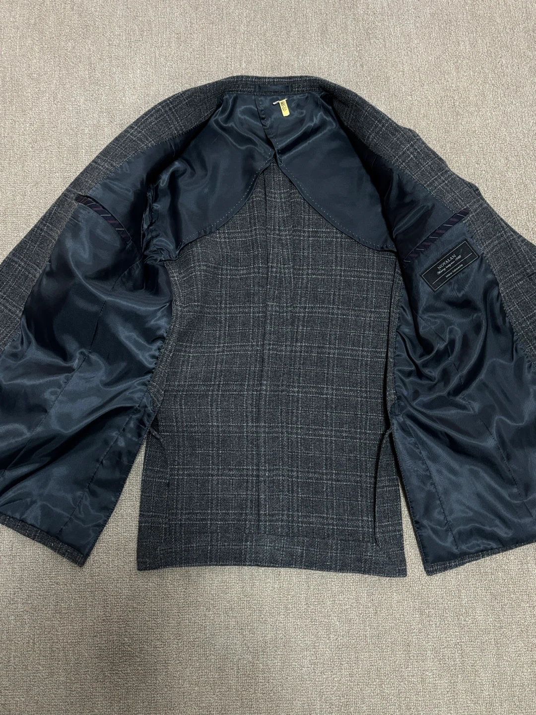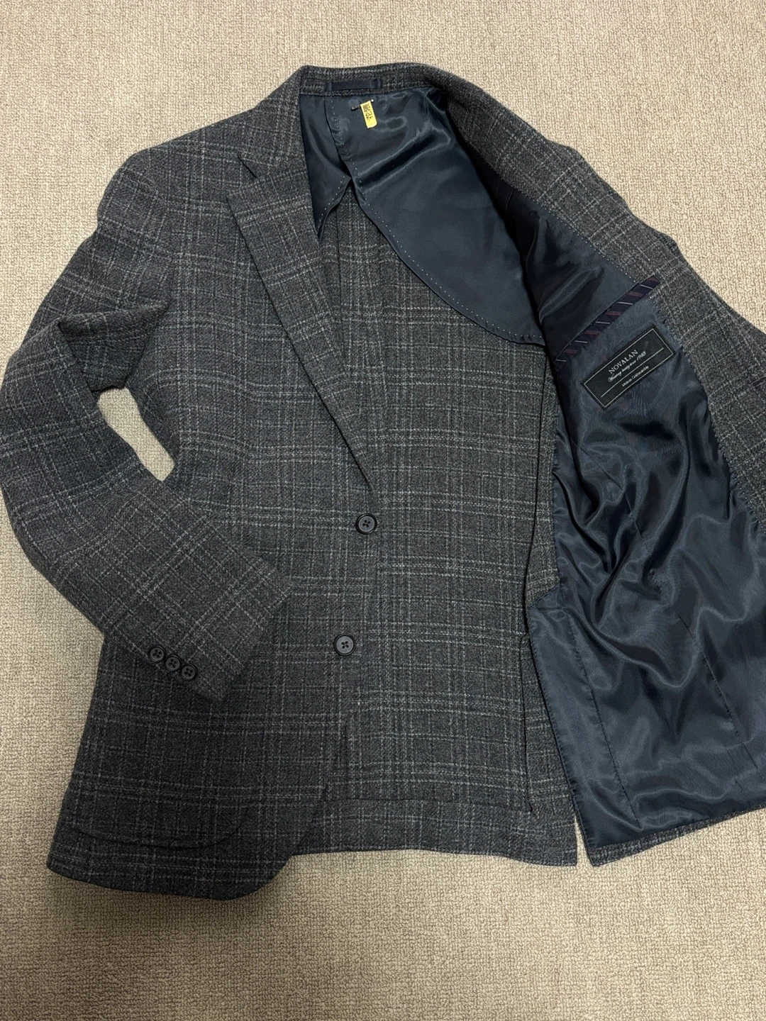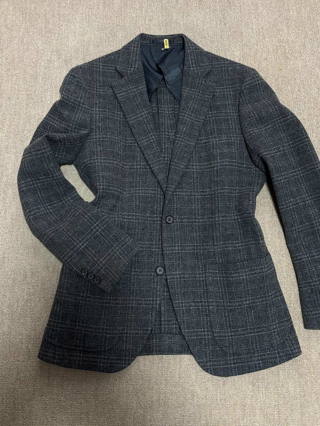 NOVALANツイードジャケット  落ち着いたチェック柄のツイード素材が醸し出す、上品な大人ジャケット 【生地】 メキシコの生地メーカー「NOVALAN」のツイード生地を使用。 粗野感がありながらも、上品な印象で重すぎない独特の生地感がポイントです。 紡毛織物の特徴として糸と糸の間に空気が含まれるので、保温性が高く、軽くて暖かさのある一着。 【ディテール】 ・2ボタン 袖口3ボタン ・サイドベンツ ・パッチポケット 【スタイリング】 汎用性が高く、気軽に羽織ることが出来るのでタイドアップはもちろんカットソーやポロシャツ、ニットなどと合わせてカジュアルなスタイリングもおすすめです。 スラックス、デニム、チノパンなどきれいめからカジュアルまで相性抜群です。 【サイズ】 LL表記ですがそこまで大きくありません  実測で肩幅44、袖丈65、身幅51、着丈71センチ 【素材】 毛100% 背抜 【カラー】 グレー チェック柄 【コンディション】 目立つようなダメージは見当たりません  クリーニング済