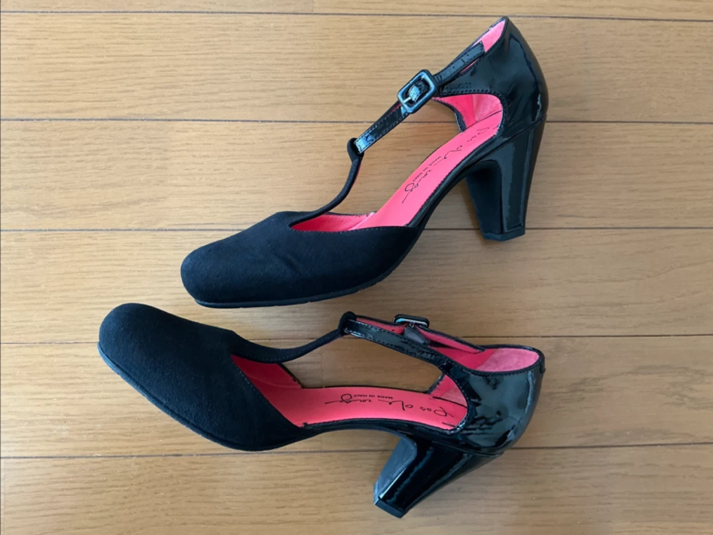 Pas de Rougeパ・ド・ルージュ イタリア製 サイズ:39(日本サイズ24.5〜25) ヒール:8㎝ 黒色のスエード 🩷鮮やかなピンク色のインソール Tストラップとアンクルストラップは黒のエナメル 👑伝統的な「手袋縫い」という製法と超軽量素材の組み合わせで、一日中履いていても疲れにくい「魔法の靴」と称されています。 室内試し履きのみ。ほぼ新品。 お取引場所:駅改札or中央区内、お互いの都合の良い場所も可能。 ご不明点があればお気軽にお尋ねください。
