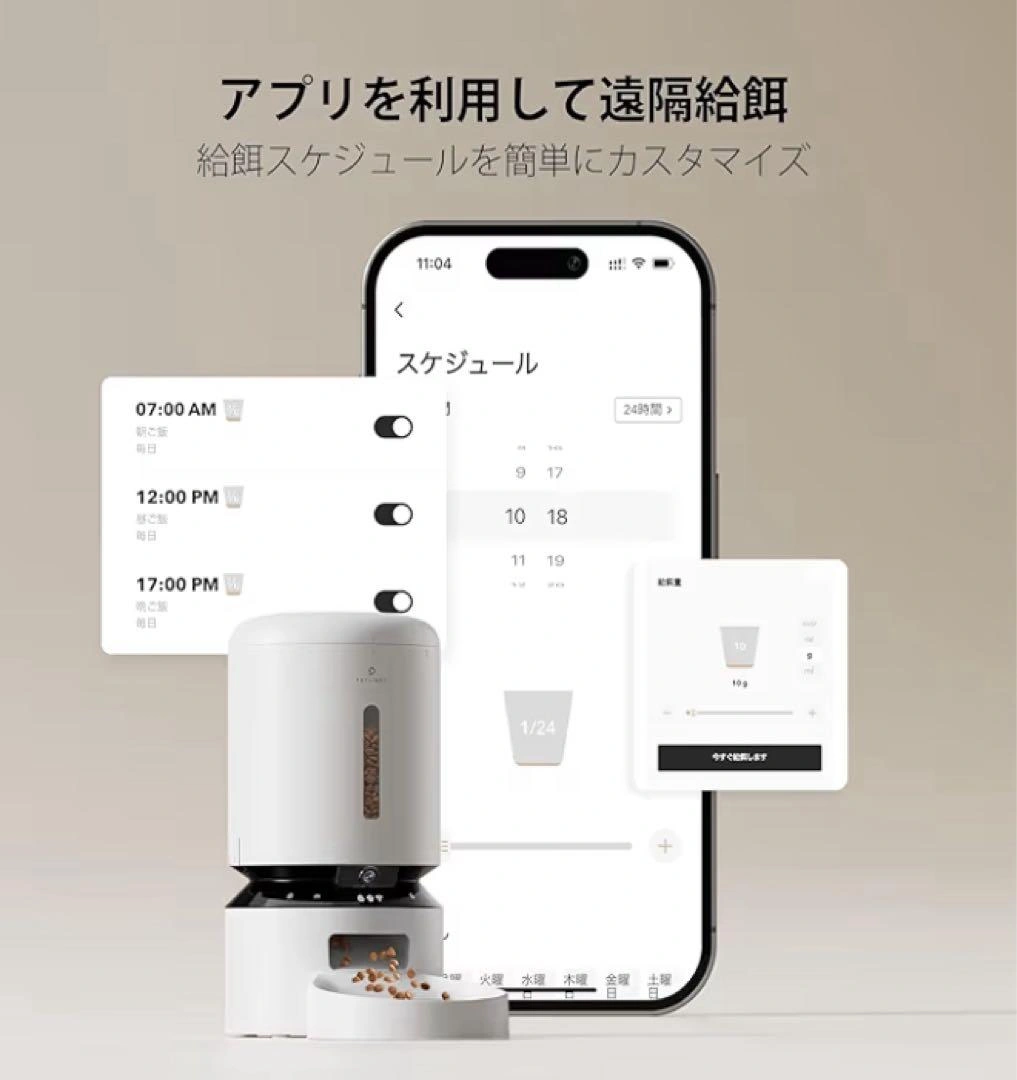 ペットカメラを探していた時にこだわった条件 ↓↓ ①安価なペットカメラは画質が悪く不明瞭というレビューを参考にし、高画質カメラを探した ②暗視機能付き。部屋が薄暗くなってきても見えるし夜間見守りや防犯にもなるので。 ③広角レンズであること。ペットが部屋の中で移動すると見切れるとかカメラ置き場所に左右されると聞いたので。 ④双方通信可能。映像の確認だけでなく話しかけたり部屋の様子も確認したかったので。 ⑤給餌量の細かい調整。手動と時間設定での自動両方使えるか。 ⑥安心設計。いたずら食い、残量不足通知など。 ⑦清潔さとお手入れの楽さ。ステンレス製ボウルやタンクは取り外し丸洗いでき衛生的。プラ製はベタベタしたり匂いが付きやすいので避けたかった。 …これら全てをクリアしたこちらの商品を購入しました! しかしリモートワークになったり、カメラ付きエコーを購入したため出番がなくなってしまいました。数回(数週間中)しか使用しておりません。 おすすめポイントはたくさんあるのですが、意外な使い方としては「家にいるはずの連絡の取れない子どもに話しかける利用法」はけっこう使えると思います。 フードタンク、トレイなどアルコール消毒済 箱なし、説明書つき 初期化済 - ブランド: PETLIBRO - モデル名: 自動給餌器 - カメラ機能: 1080P HD - 容量: 5L - WiFi対応: 2.4G/5G - 動体検知機能: あり - 暗視機能: あり - 視野角: 145° -定価:17,999円 ご希望の方はお気軽にご連絡ください。