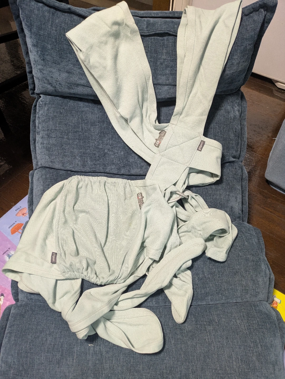 ピジョンのベビーキャリアです 1〜3枚目は公式写真、4、5枚目が実際の写真です。 1カ所1センチほどのシミがありますが、着用時には隠れるところです。 小さくたためるので、持ち運びに便利です。 中古品であることご了承ください