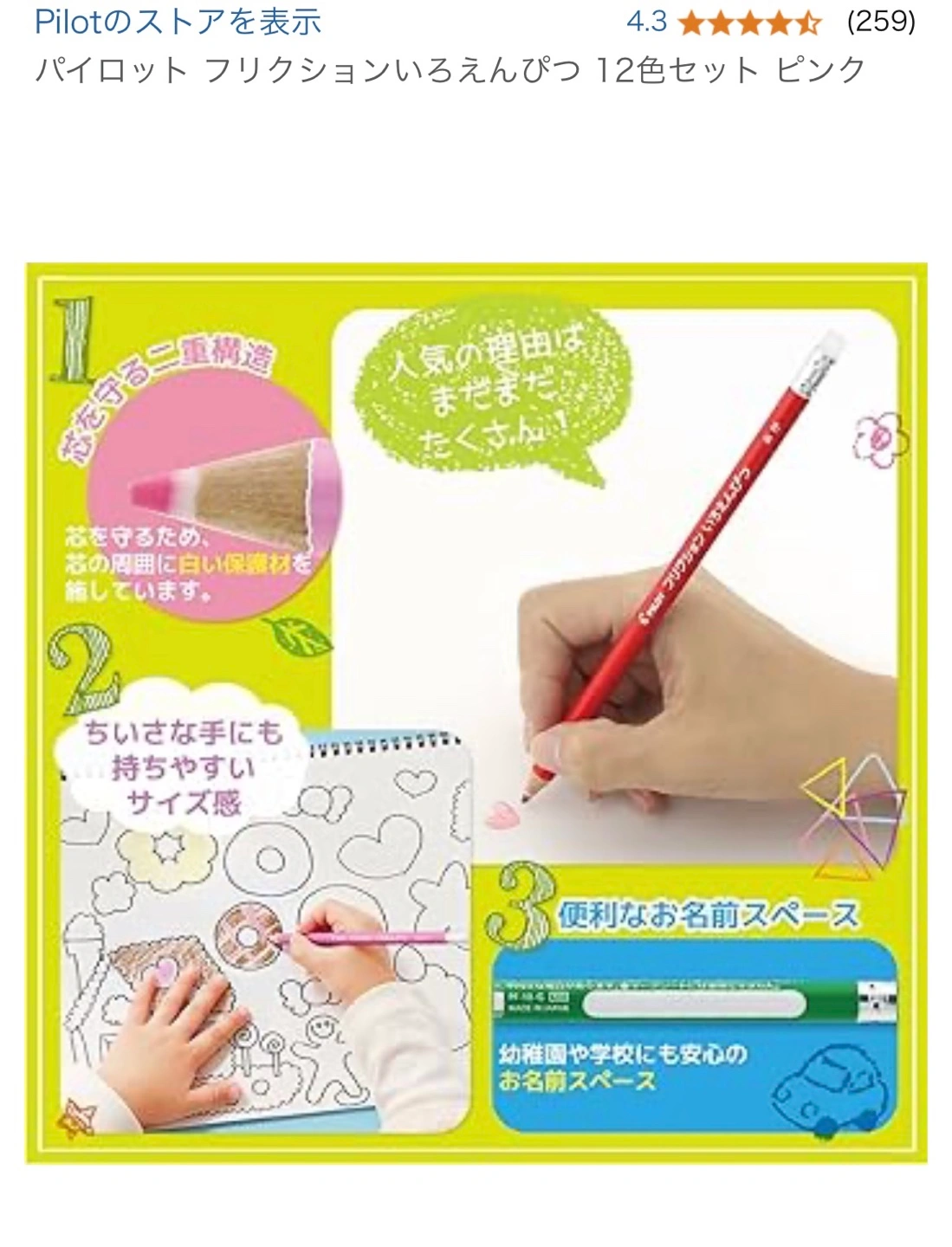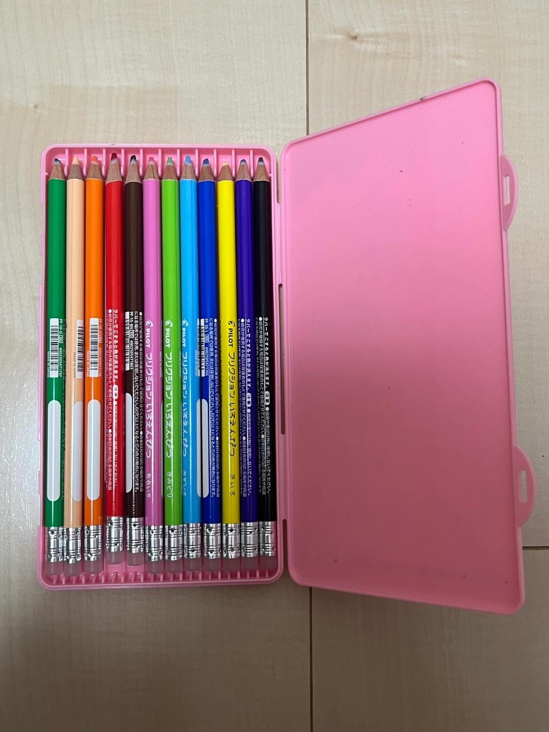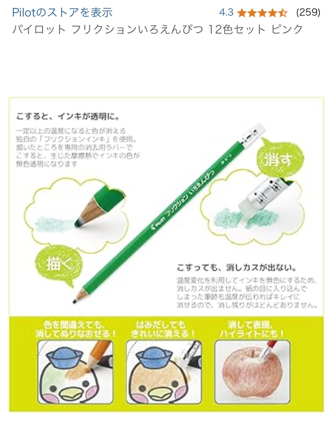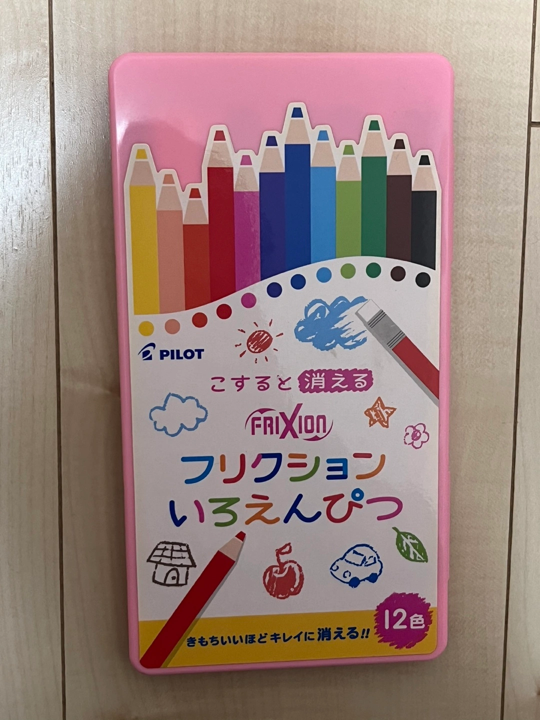 ほとんど使用せずしまったままになっていたものを引越しを機に出品いたします。 問題なくご使用いただけるかと思いますが、気になる方はご遠慮ください。 お写真そのままのお渡しとなります。 中古品であることをご了承の上、ご購入くださいませ。 ご不明点などございましたらお気軽にお尋ねください。 以下、商品説明になります。 摩擦熱による温度変化によって筆跡を無色にするフリクションインキの色素をワックスで固めた新開発の芯を搭載。消去用ラバーで擦ることで筆跡をきれいに消すことができる色鉛筆です。 消しゴム等で消す、これまでの「消せる色鉛筆」と異なり筆跡の消し残りがほとん どなく、また、摩擦熱で筆跡を消去するので消しカスが出ないため、テーブル上や部屋を汚すこともありません。芯を守るため、芯の周囲に白い保護材を施した2重構造です。 色種は、きいろ、うすだいだい、だいだい、あか、ももいろ、むらさき、あお、みずいろ、きみどり、みどり、ちゃいろ、くろの12色。柔らかタッチのソフトな発色です。塗った色を部分的に消すことで「白色」を表現することもできます。